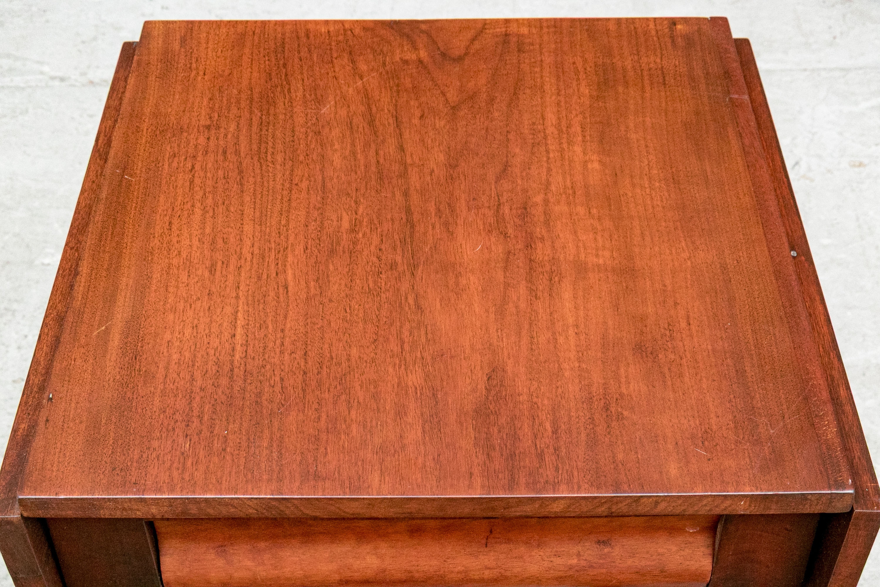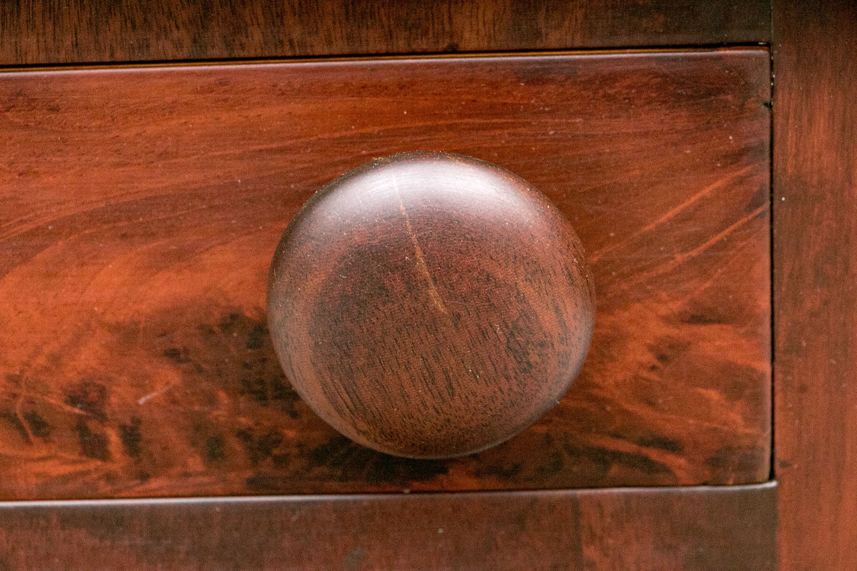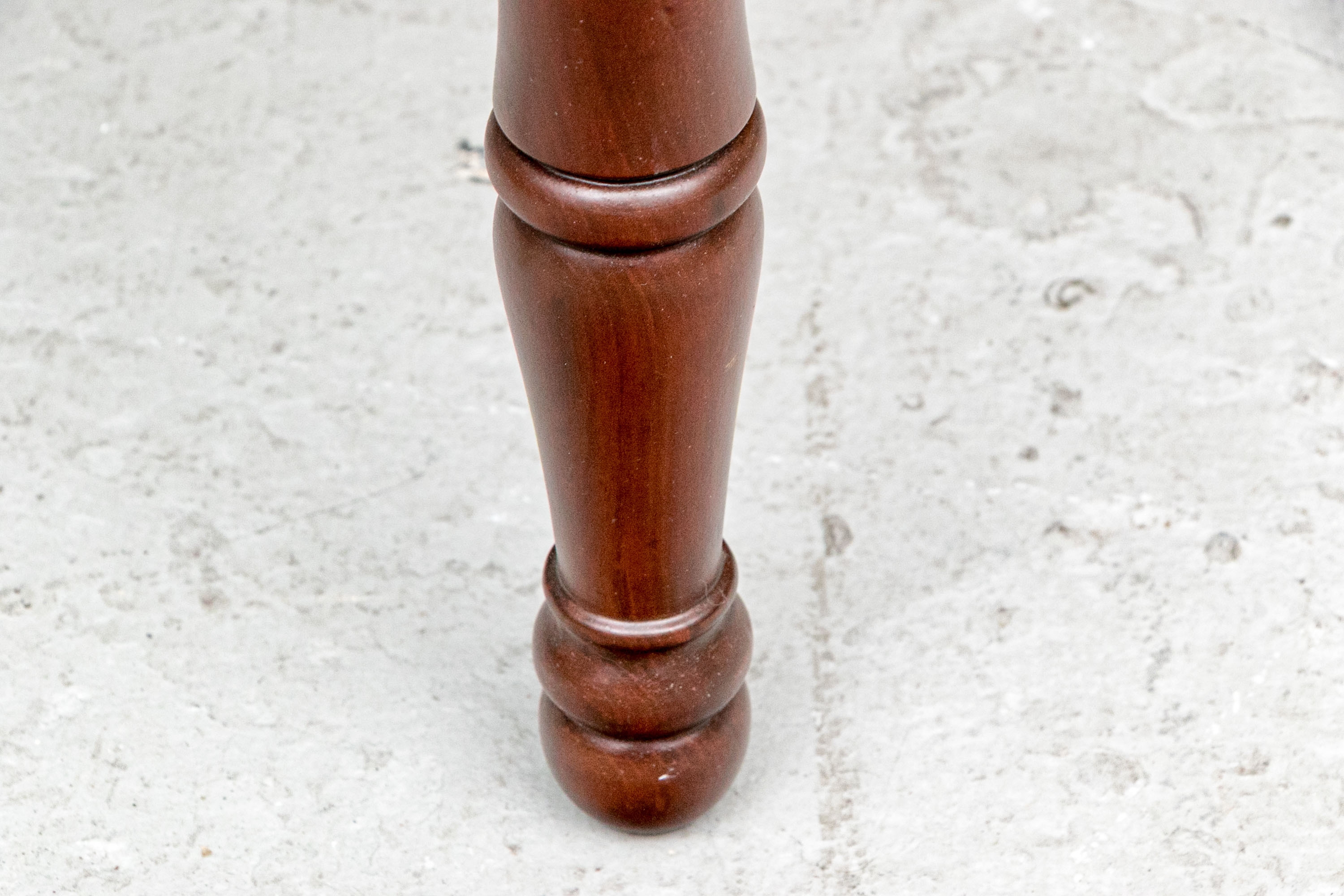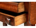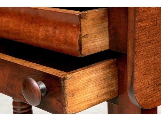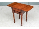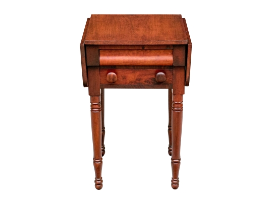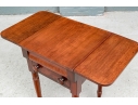 A finely constructed antique mahogany stand with drop leaves. With a curved flush frieze drawer over a drawer with knob pulls. Raised on tall ring turned legs,