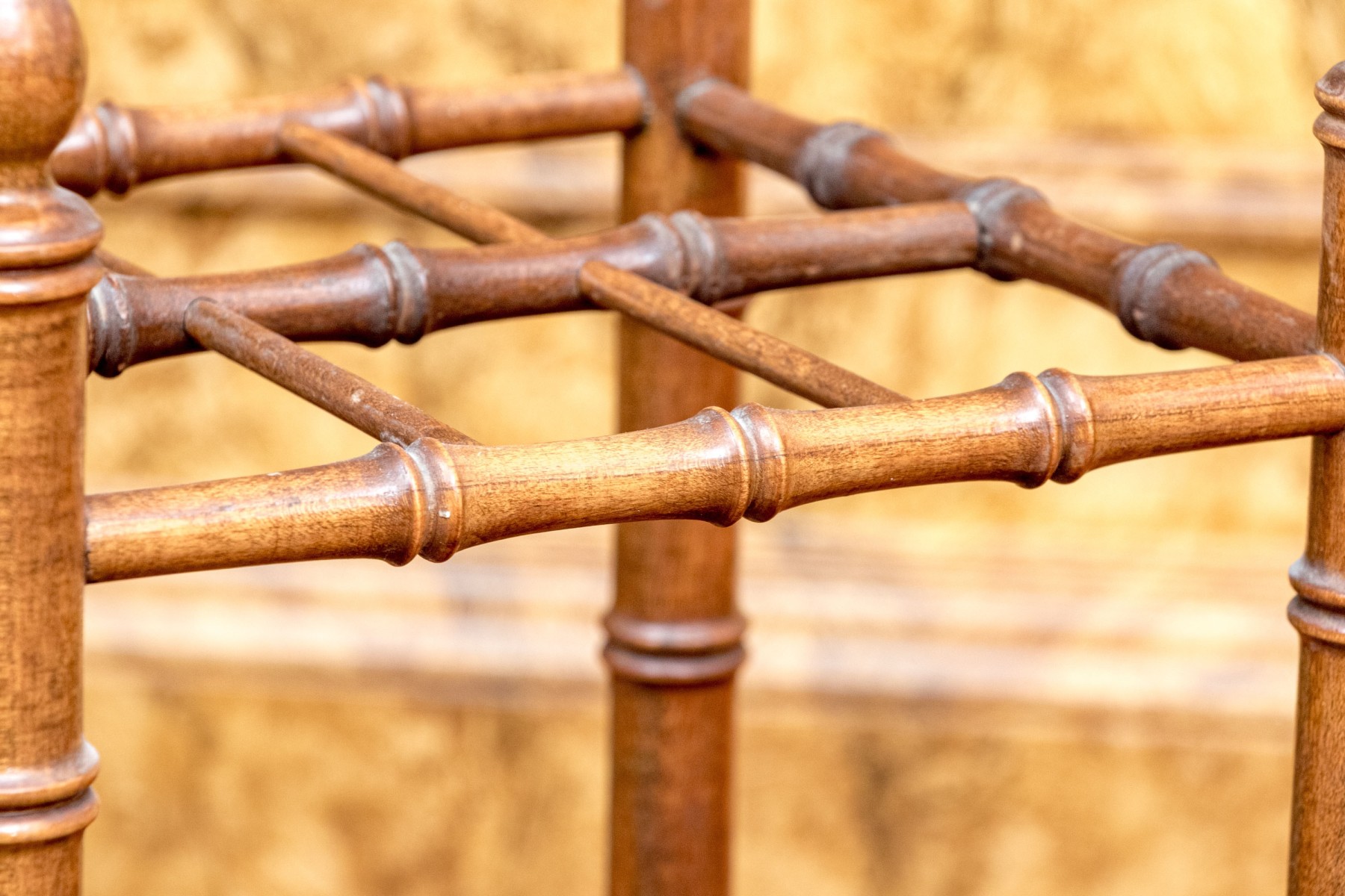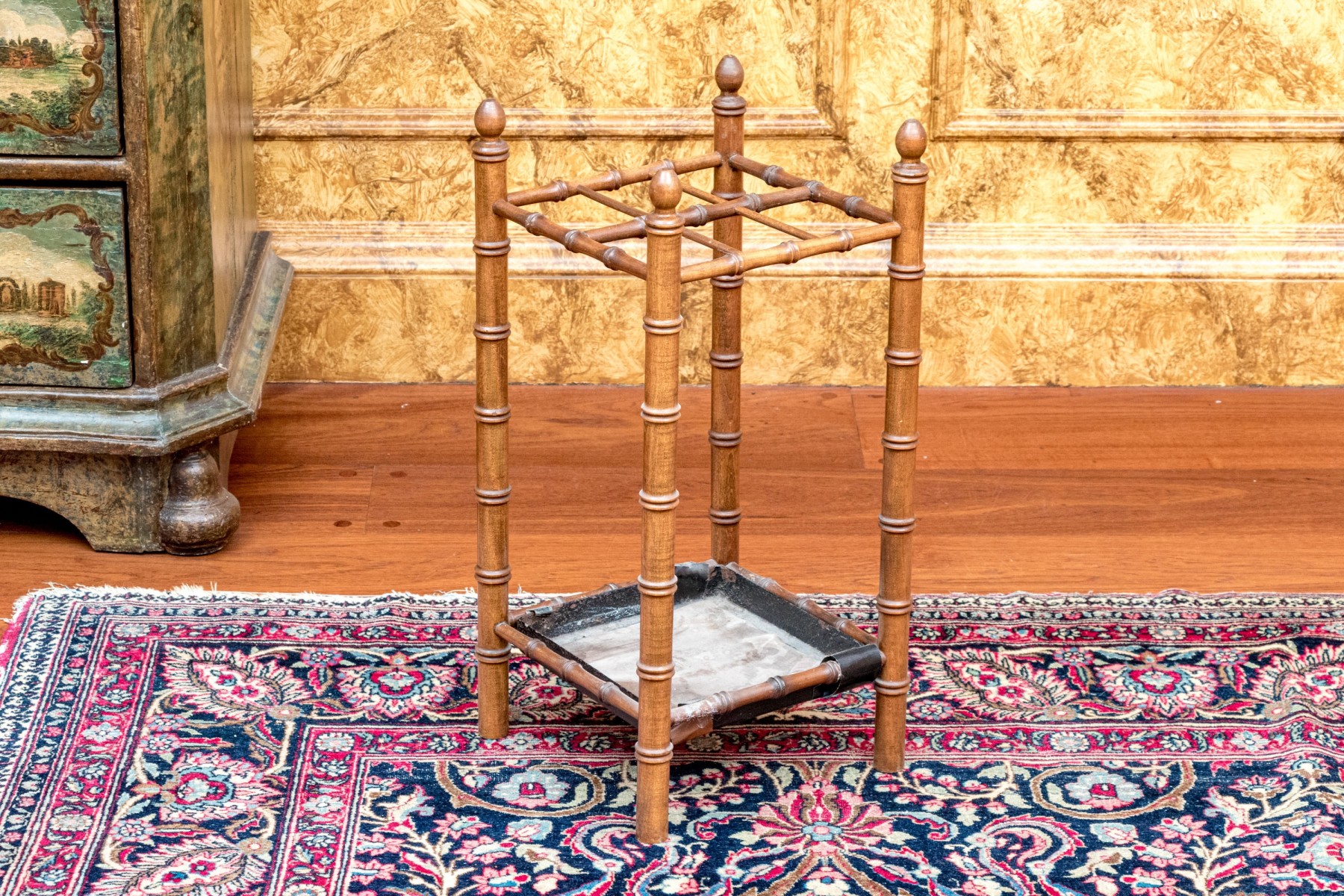 A wonderful antique umbrella or cane stand with great mid-century appeal, nicely crafted in honeyed brown wood. The stand features ovoid finials on faux bamboo banded cylindrical legs with a grid top and a metal drip pan at the bottom.