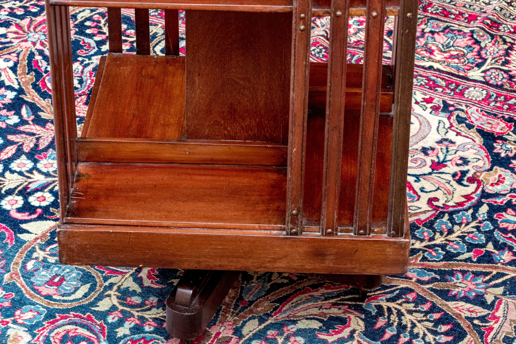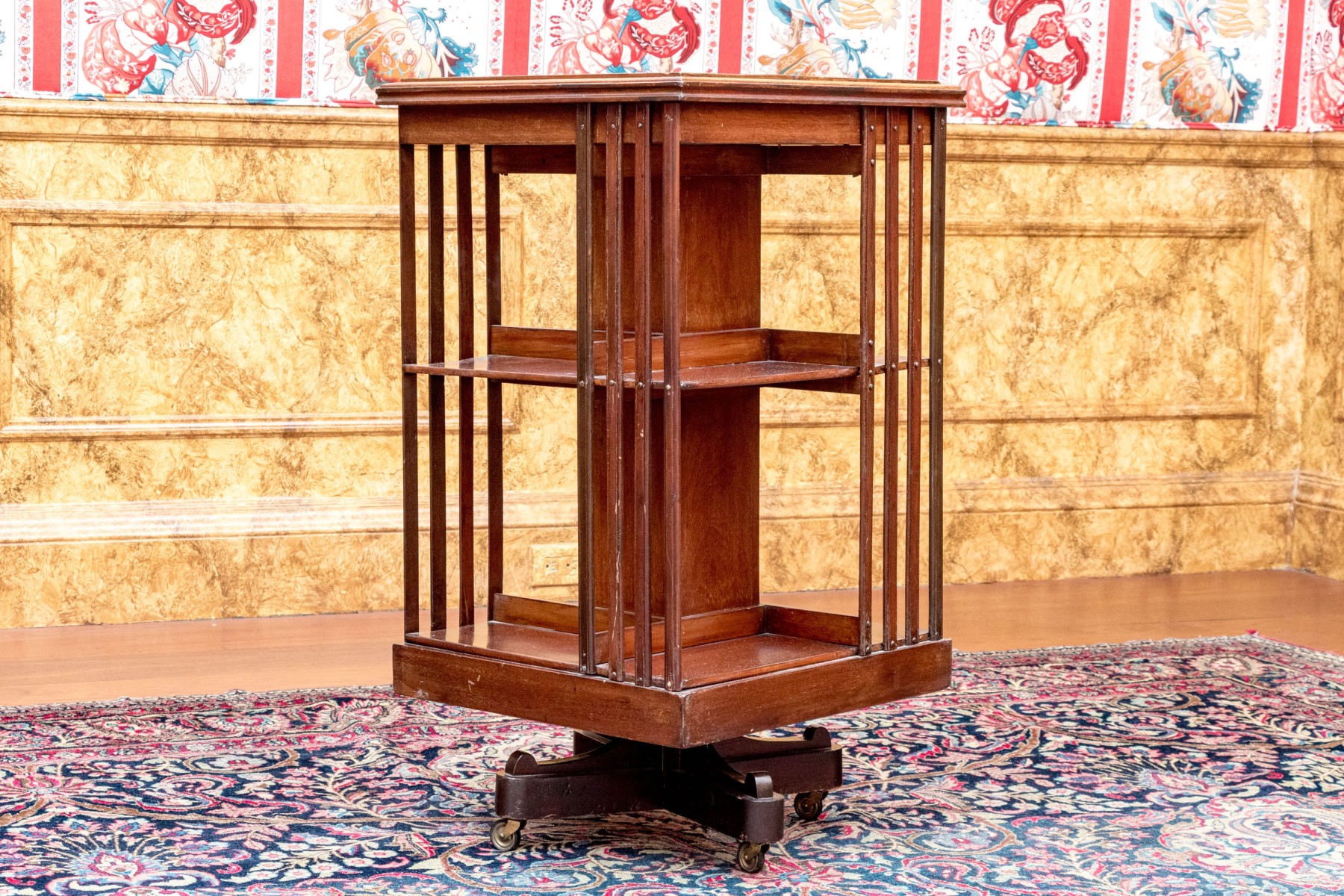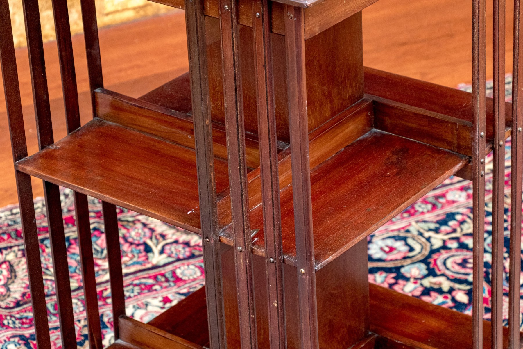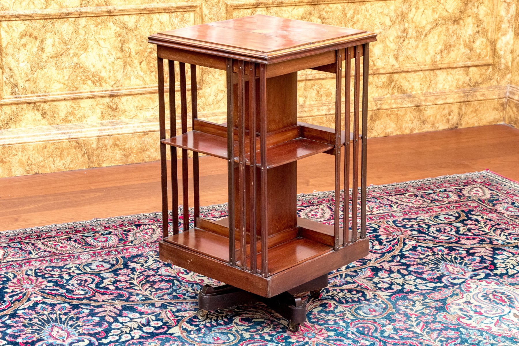 A delightful antique revolving bookcase in classic Edwardian design, well crafted in warm-toned brown mahogany. The bookcase features a square beveled top with a marquetry medallion at the center, leading to two tiers of bisected shelves with strategically placed rails encasing the body. The body is raised on a later added four-prong base on casters for added mobility.