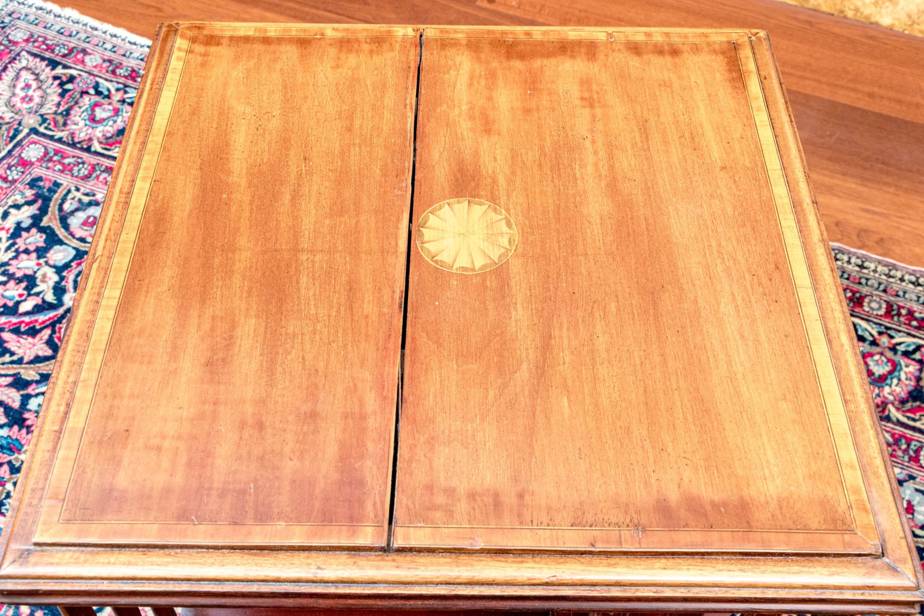 Crack and split to the table top with some losses to the veneer and finish commensurate with age and use. Despite wear still a handsome piece with plenty of life left to live.