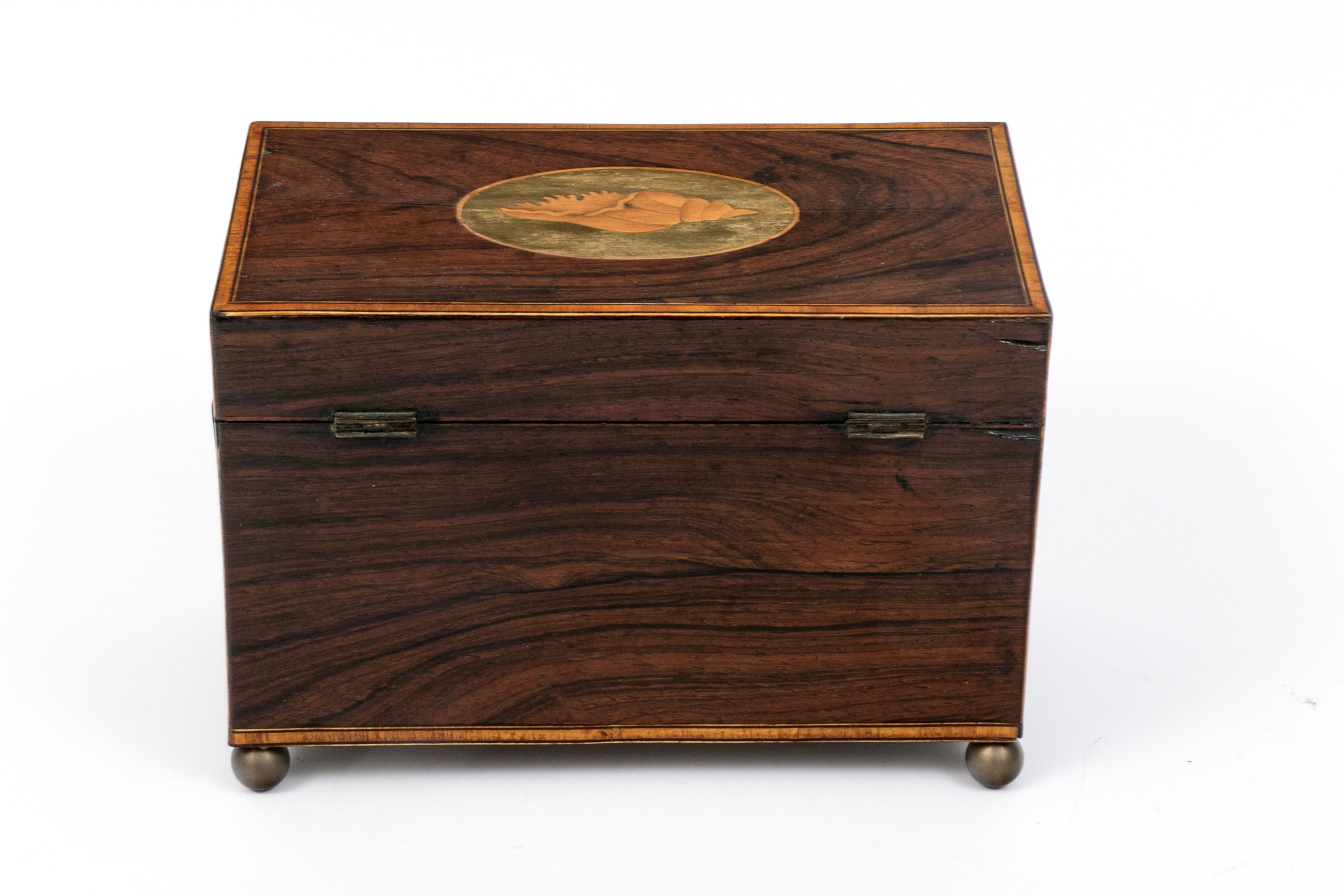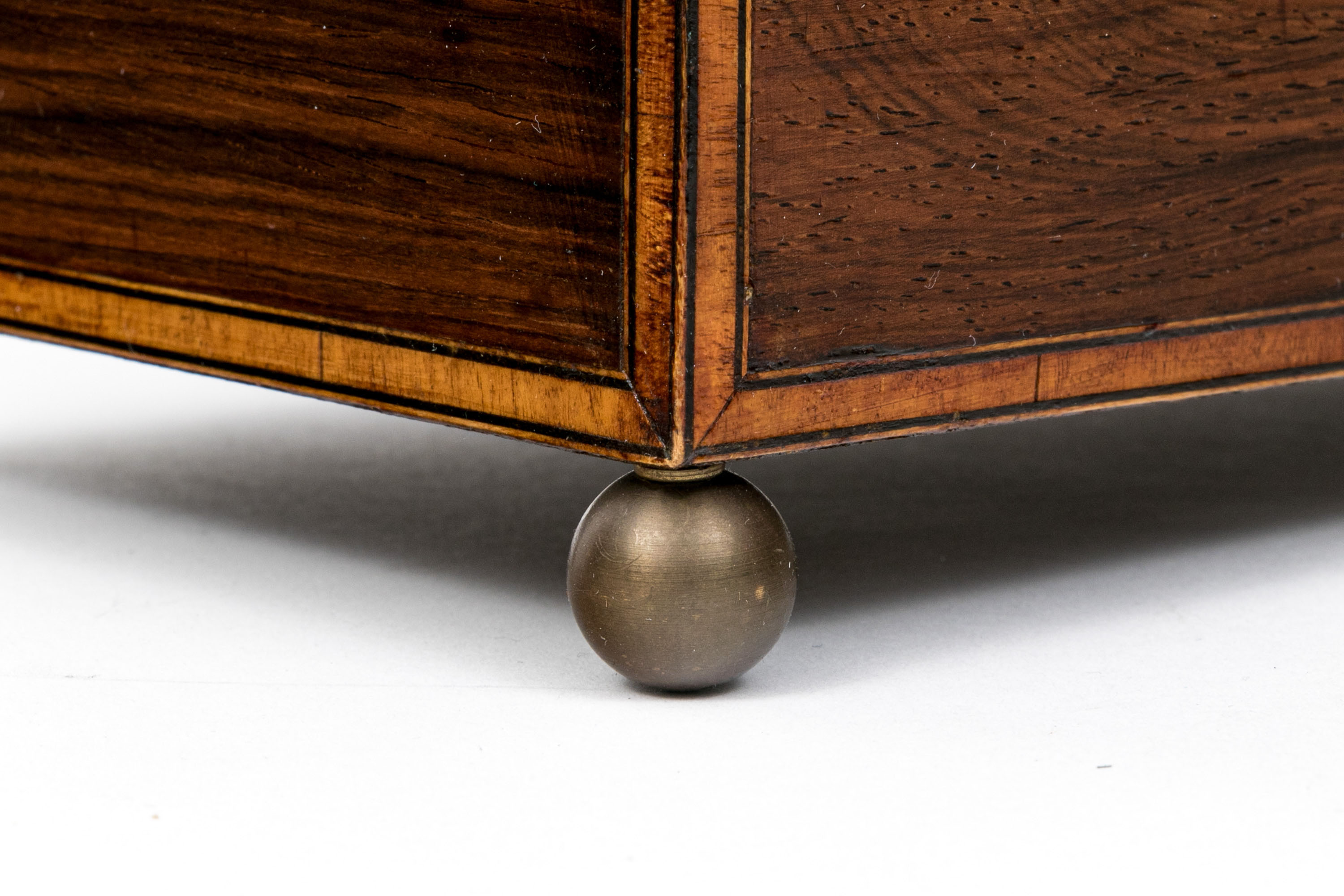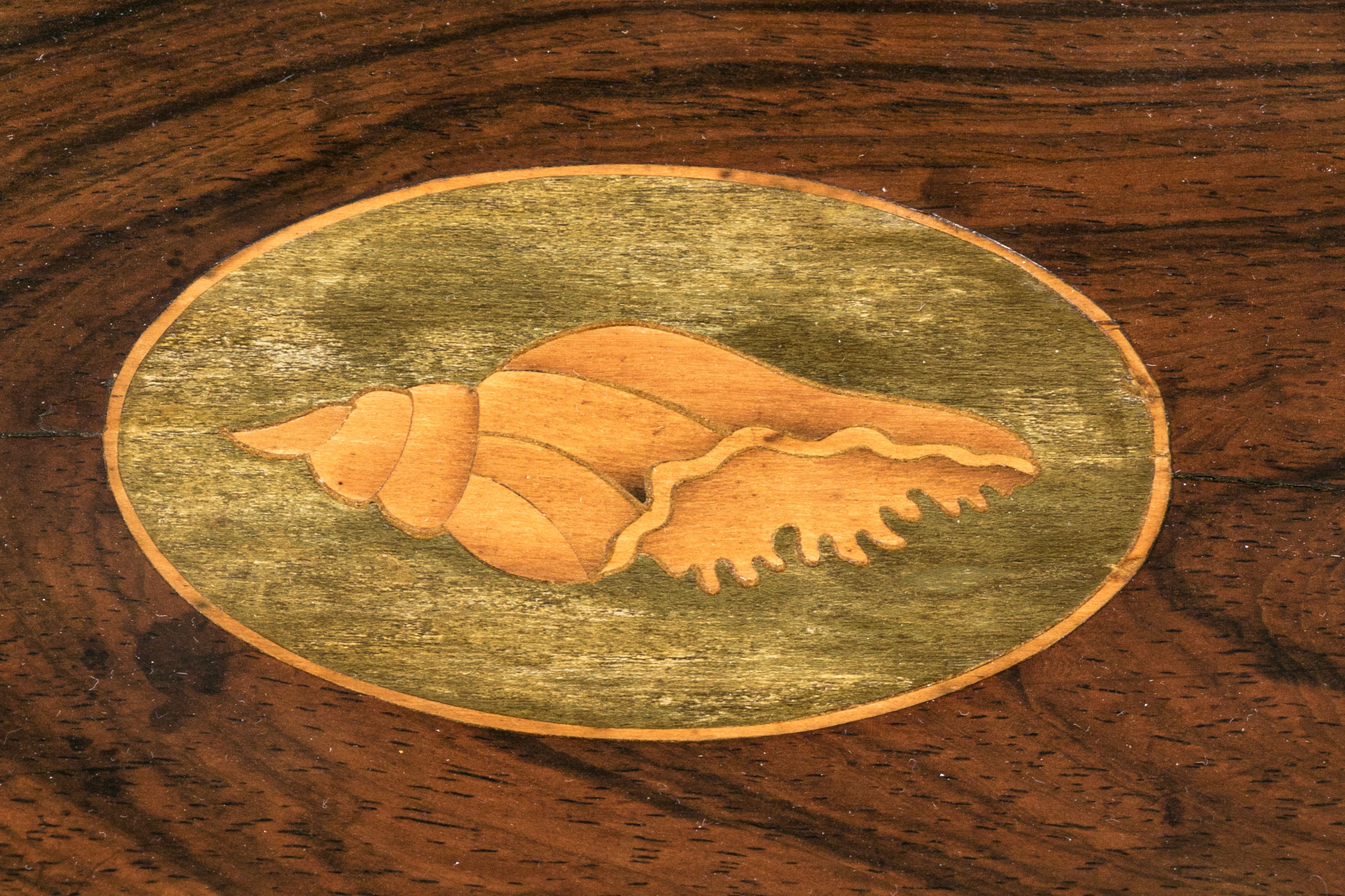 Raised on four ball form feet with satinwood banded trim and a central oval inlaid shell motif.