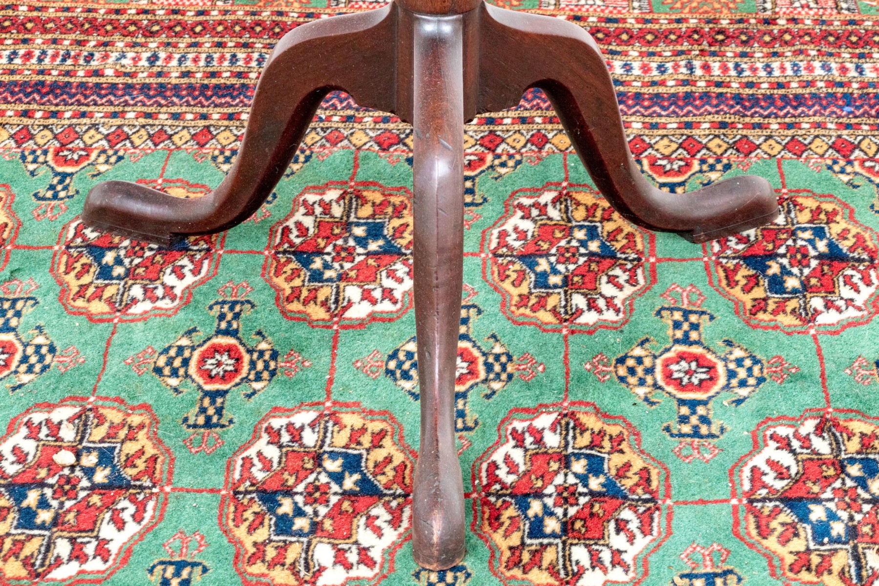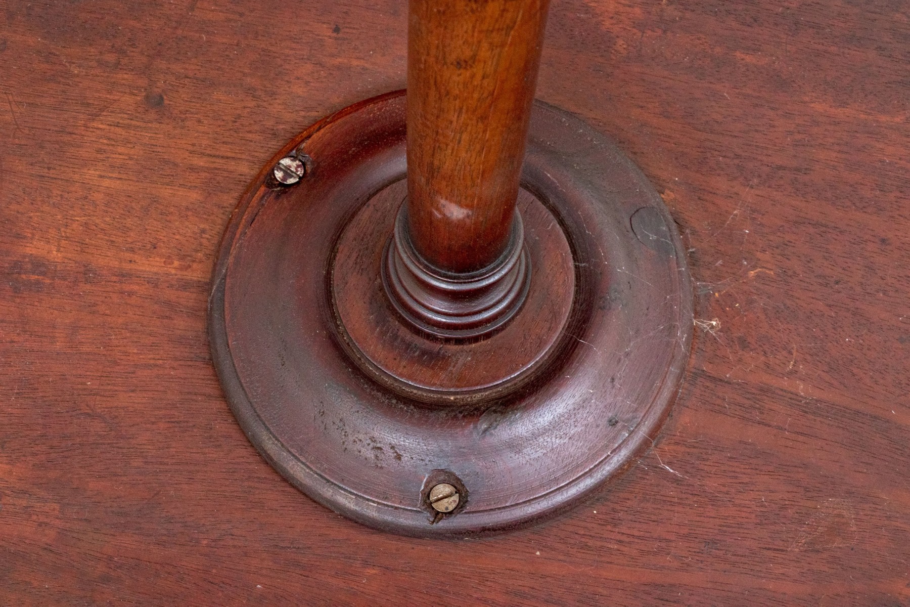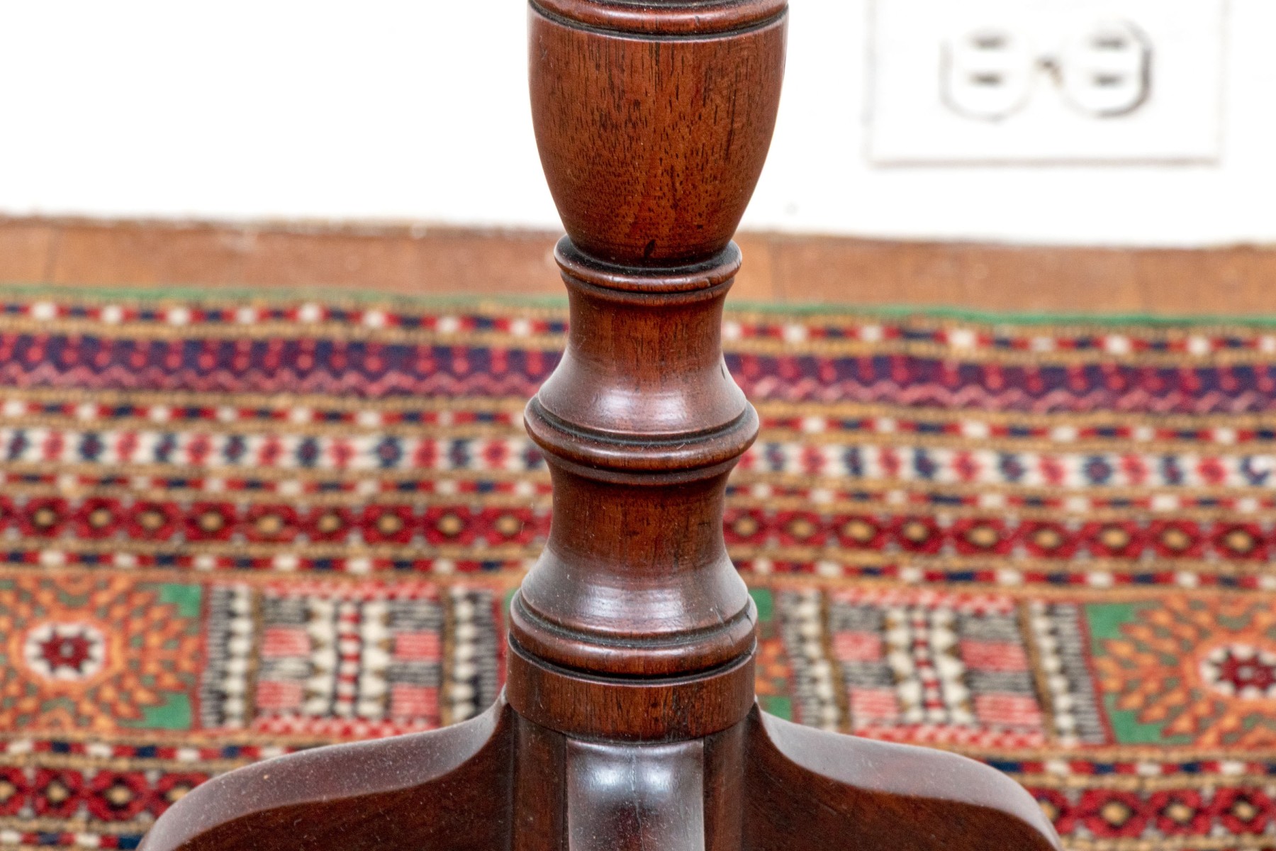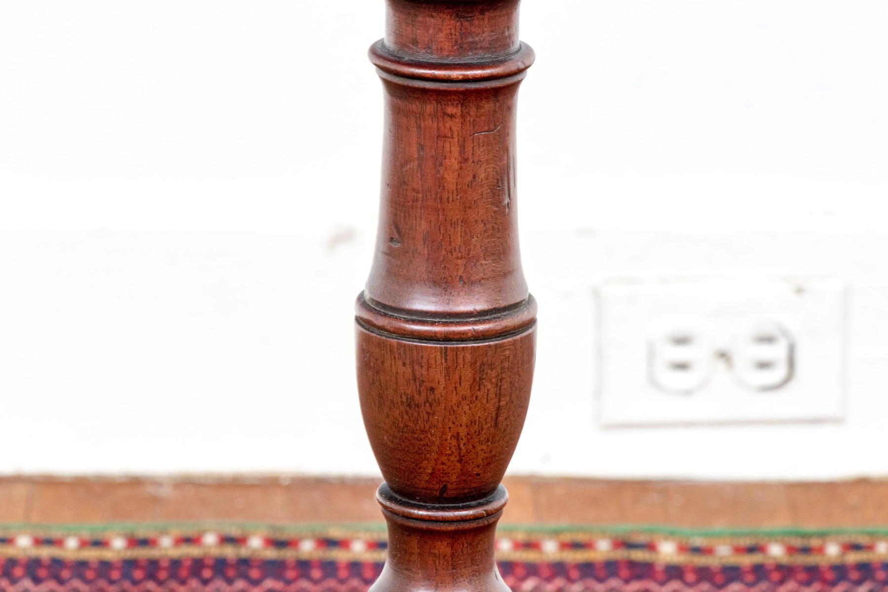 A charming antique tilt top occasional table or gueridon sporting a sleek warm-toned medium brown oval top on a turned pedestal column leading down to three cabriole legs with slipper feet.