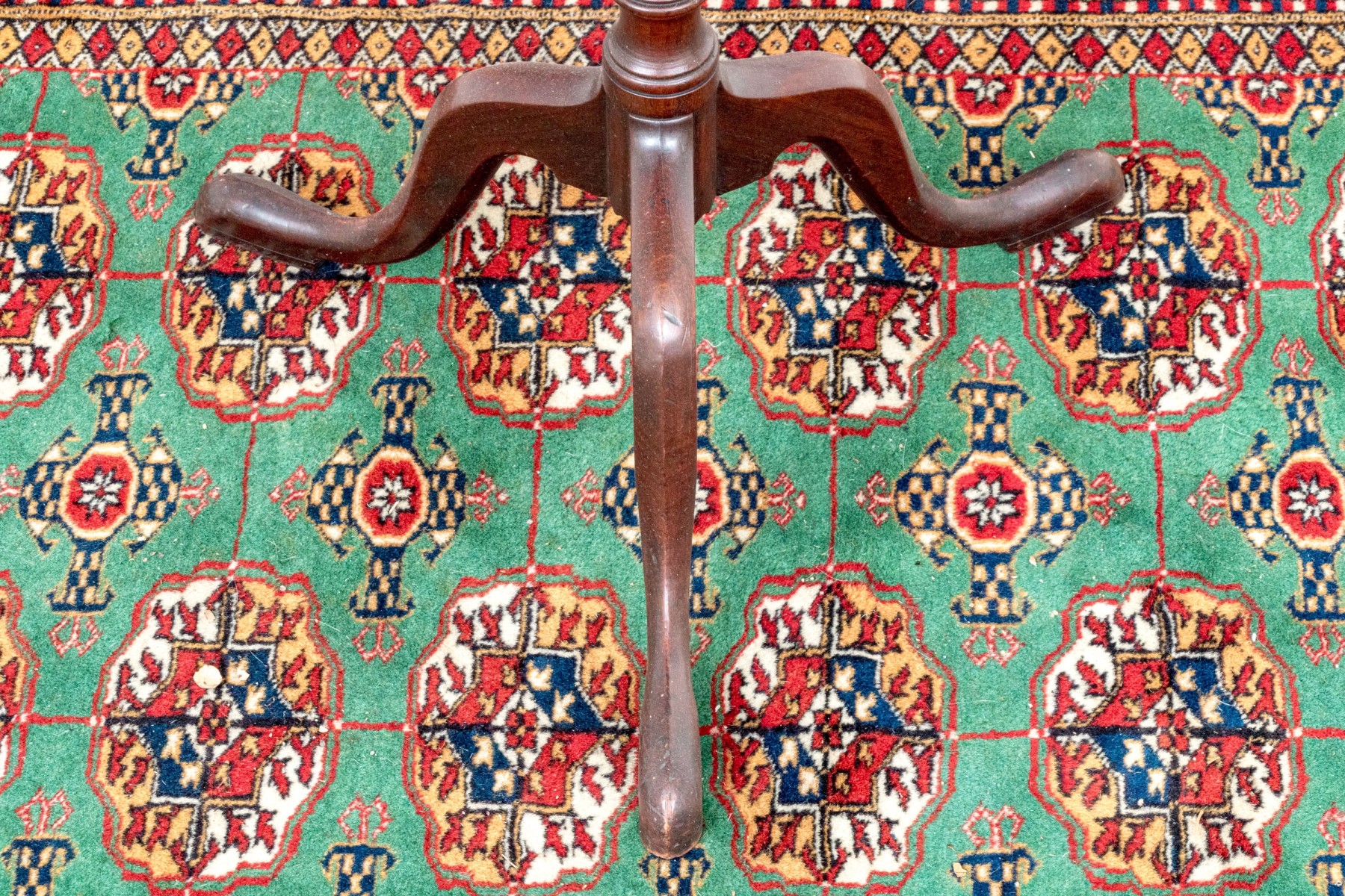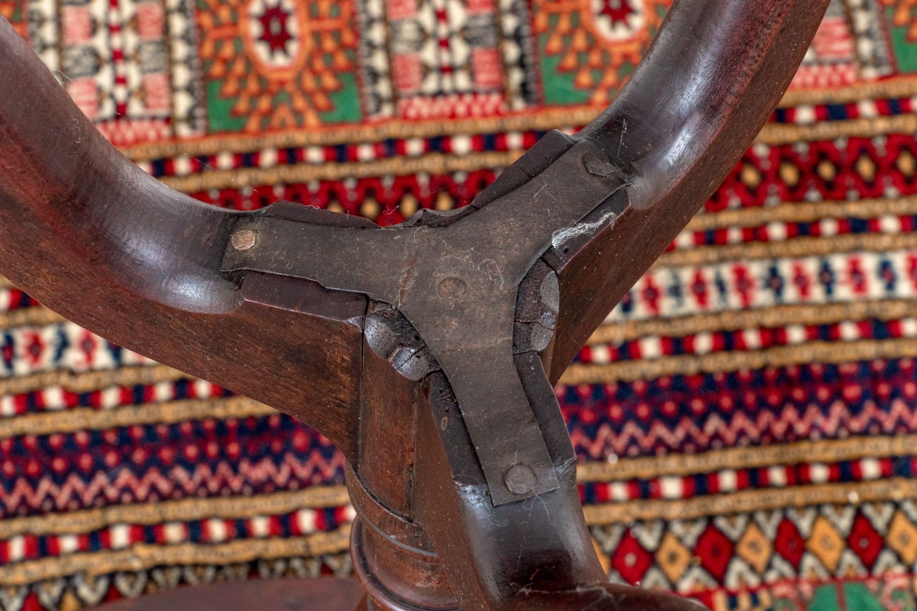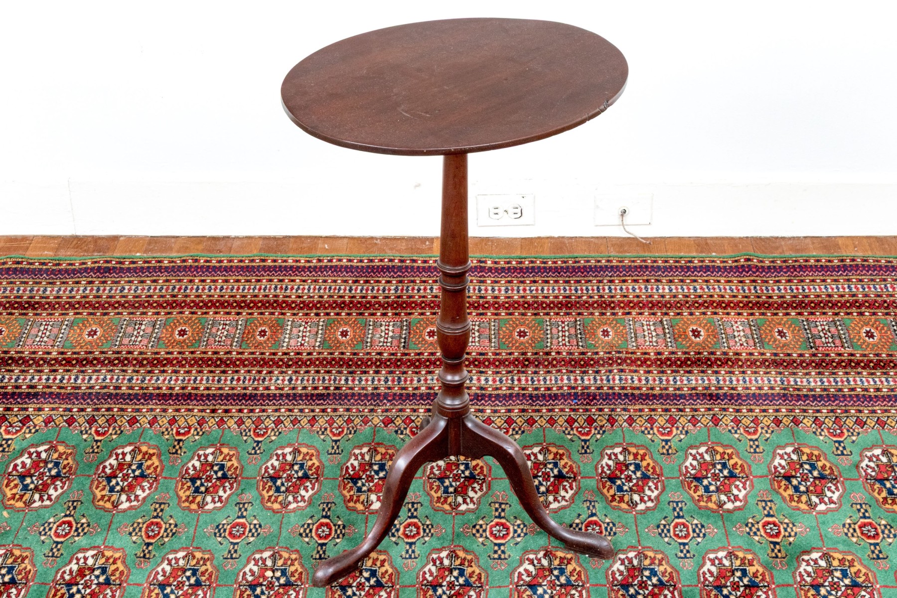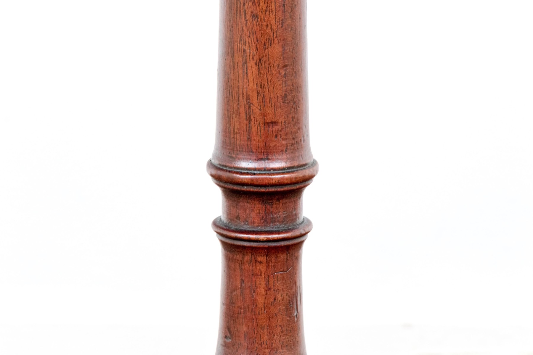 A charming antique tilt top occasional table or gueridon sporting a sleek warm-toned medium brown oval top on a turned pedestal column leading down to three cabriole legs with slipper feet.