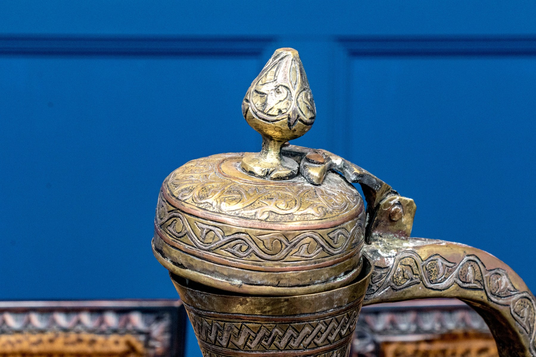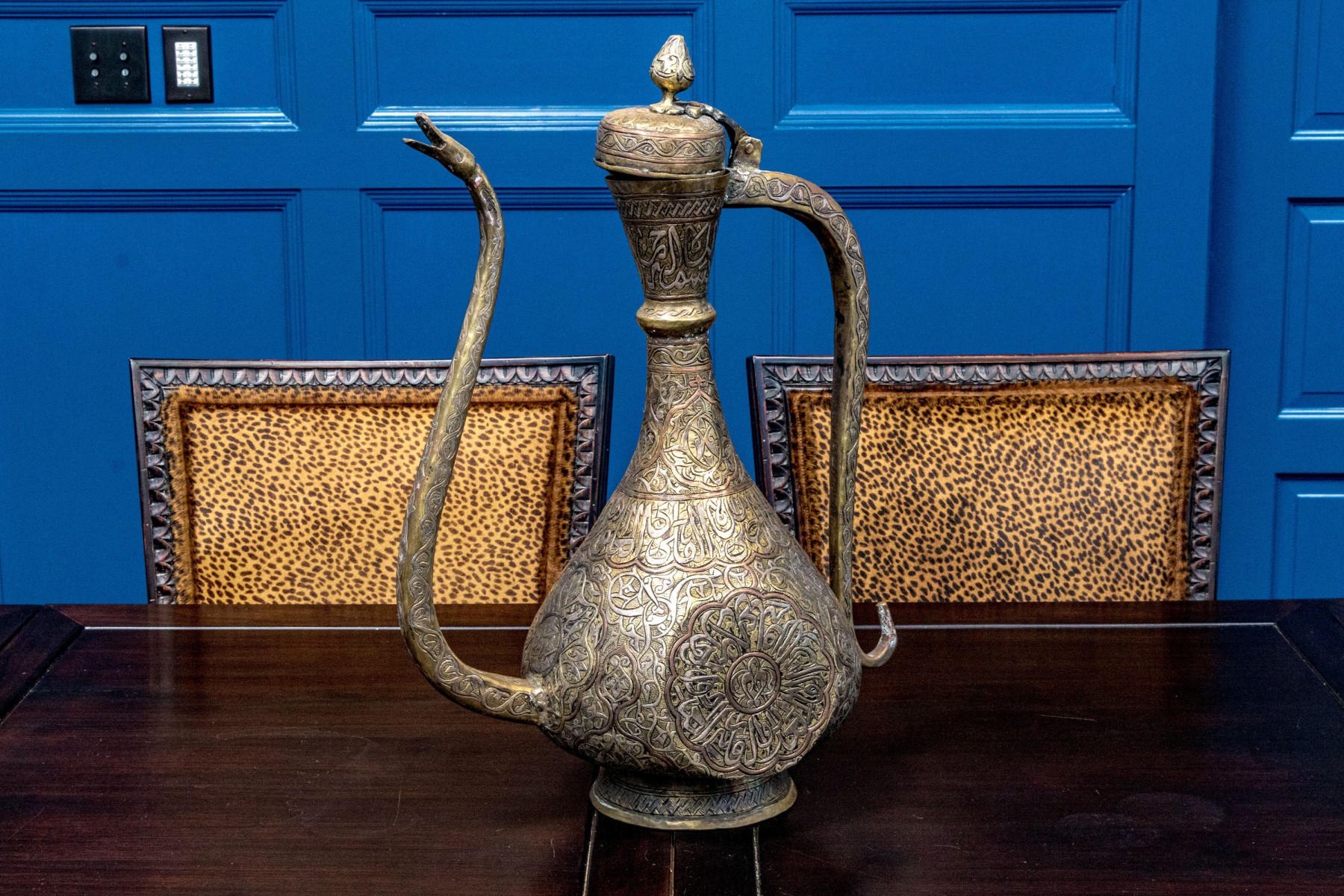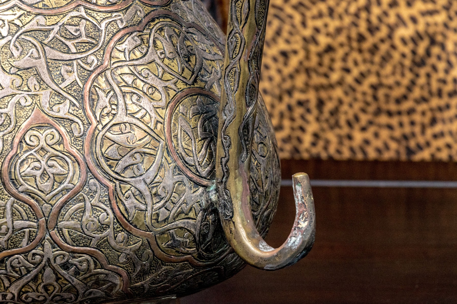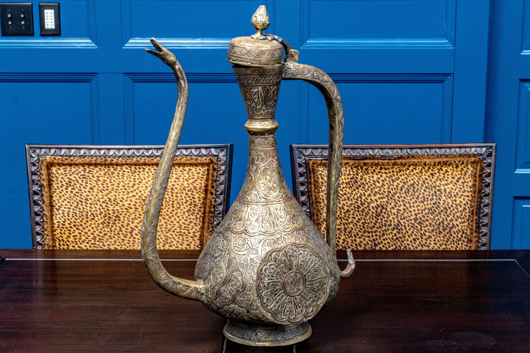 A gorgeous antique Mamluk revival mixed metal ewer showcasing a pointed finial over an affixed cap on a conical neck with a banded knop tapering out to a rotund pear-shaped body. The ewer features a tall handle that echos the form of a dramatically swooping spout with a goose head motif. Beautifully detailed throughout with copper, brass, and silver tones incorporating geometric designs and organically curving motifs, including a large scalloped medallion at the center of the body. Finished with a raised foot, making for an ornate and highly decorative piece overall.