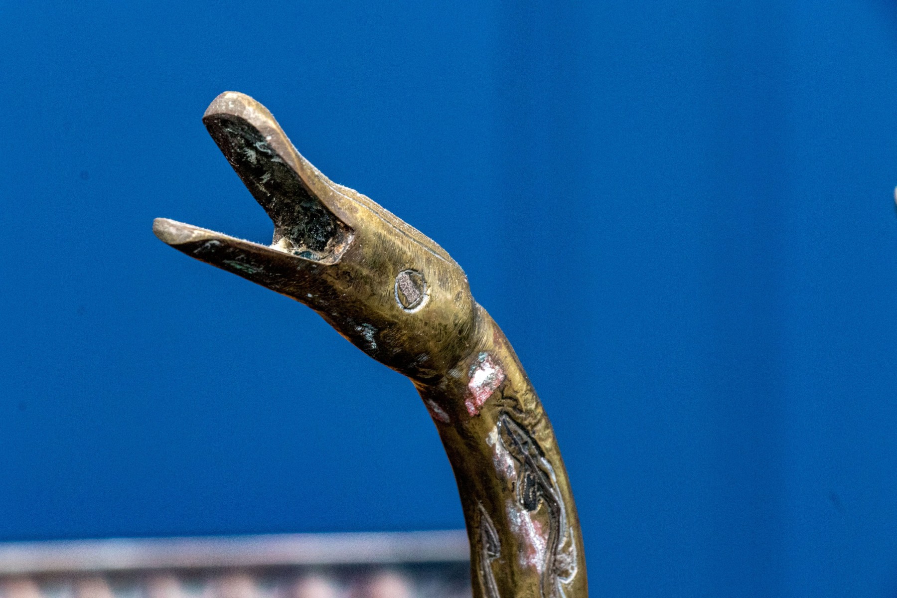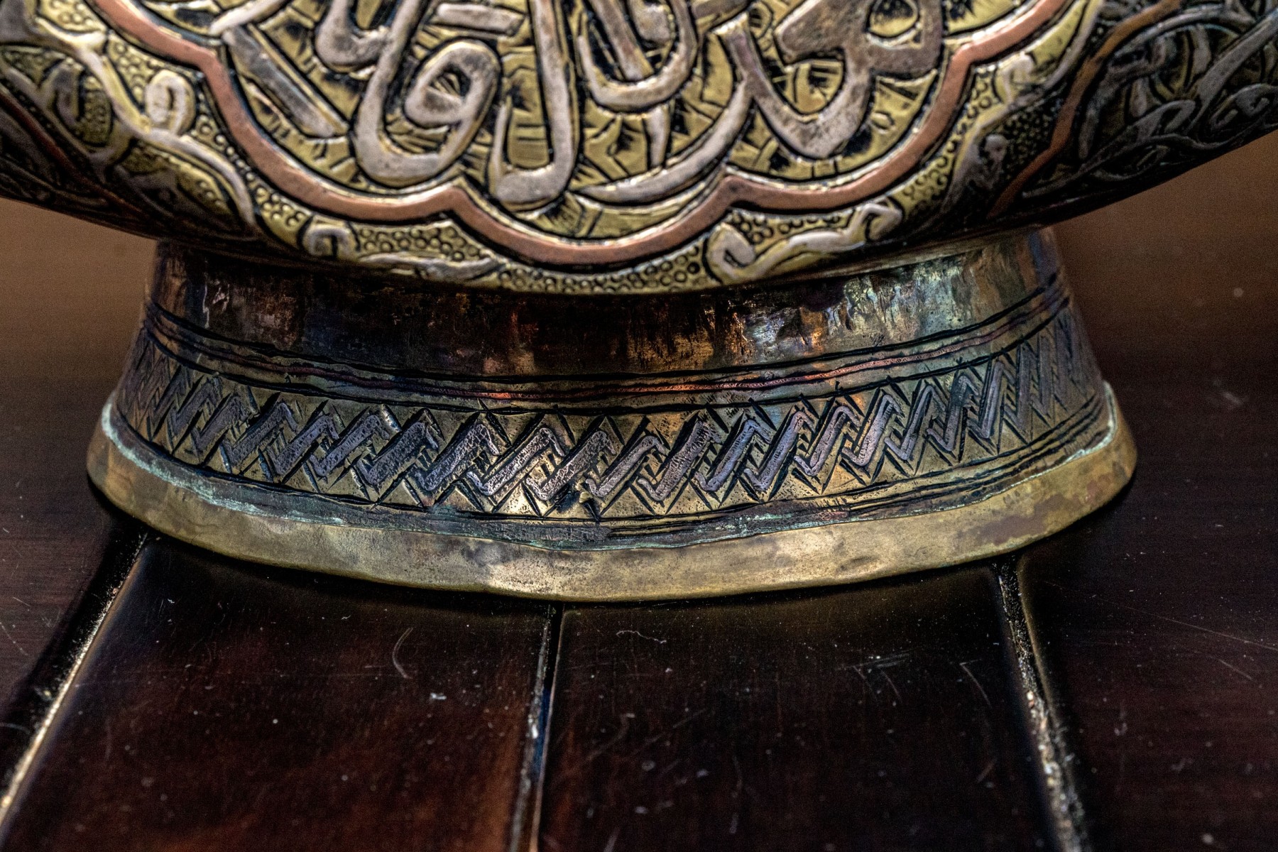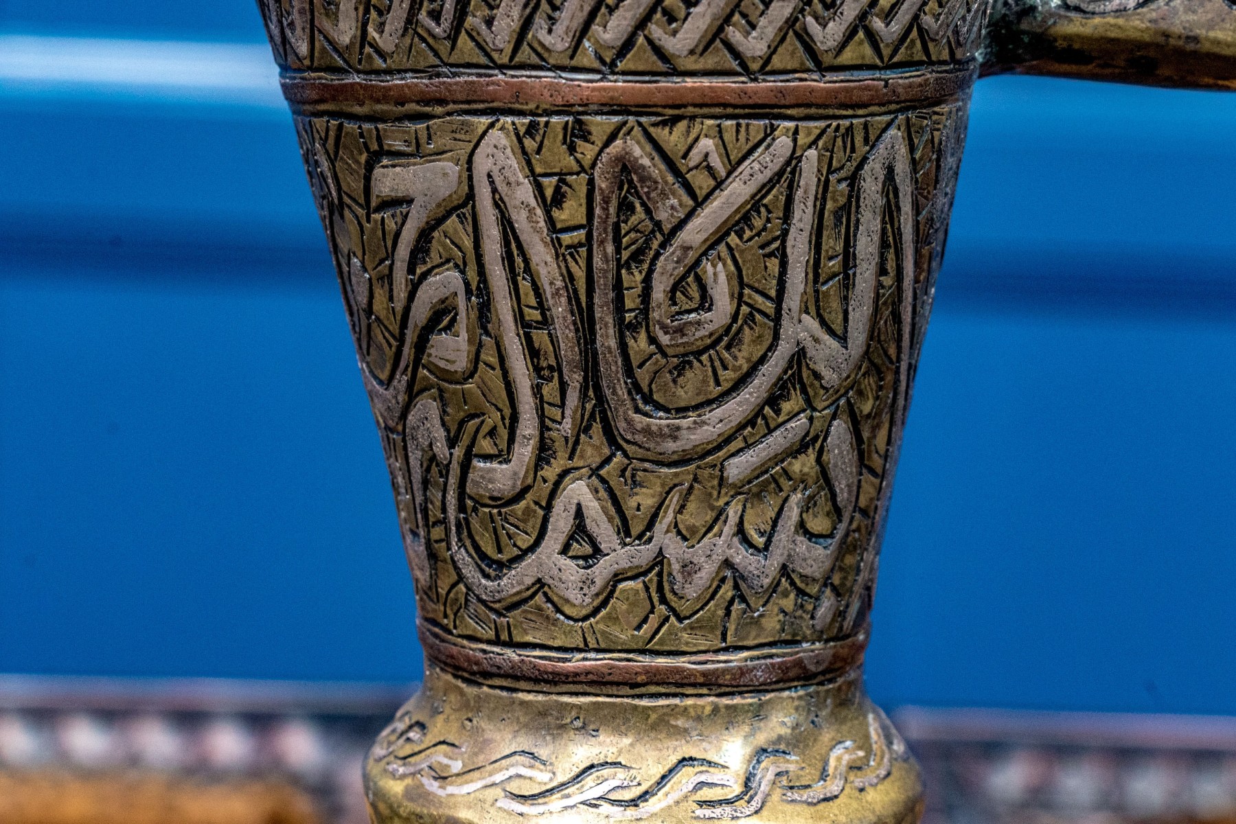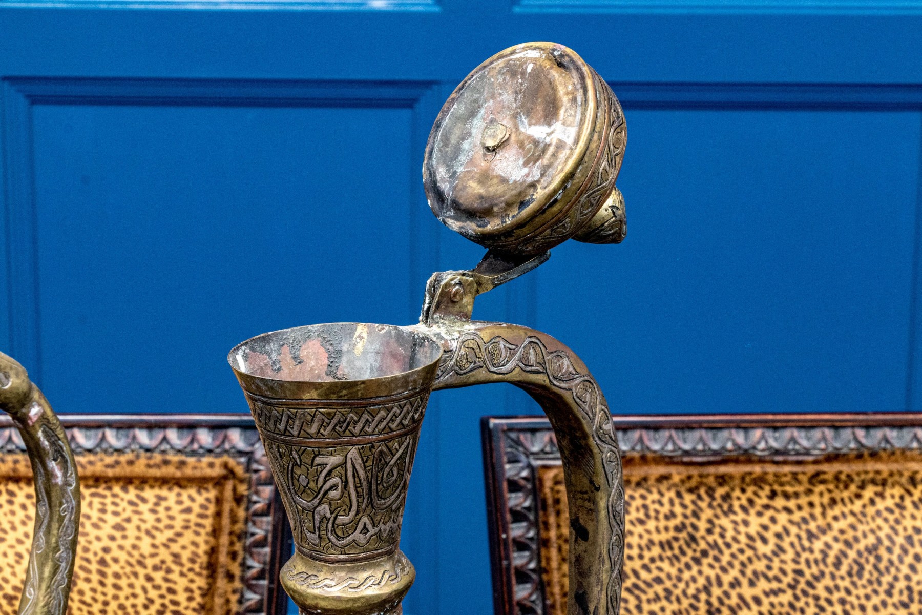 A gorgeous antique Mamluk revival mixed metal ewer showcasing a pointed finial over an affixed cap on a conical neck with a banded knop tapering out to a rotund pear-shaped body. The ewer features a tall handle that echos the form of a dramatically swooping spout with a goose head motif. Beautifully detailed throughout with copper, brass, and silver tones incorporating geometric designs and organically curving motifs, including a large scalloped medallion at the center of the body. Finished with a raised foot, making for an ornate and highly decorative piece overall.