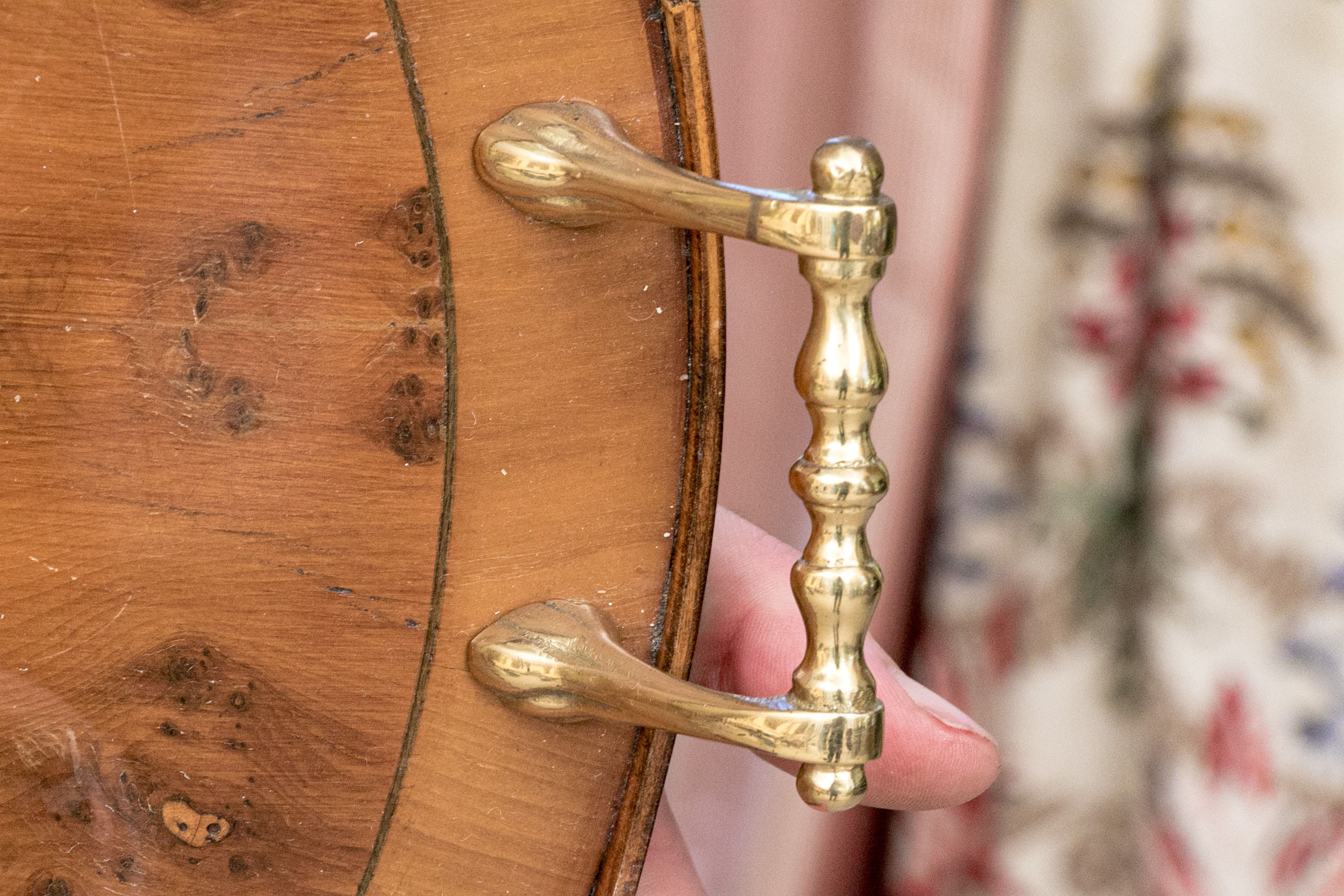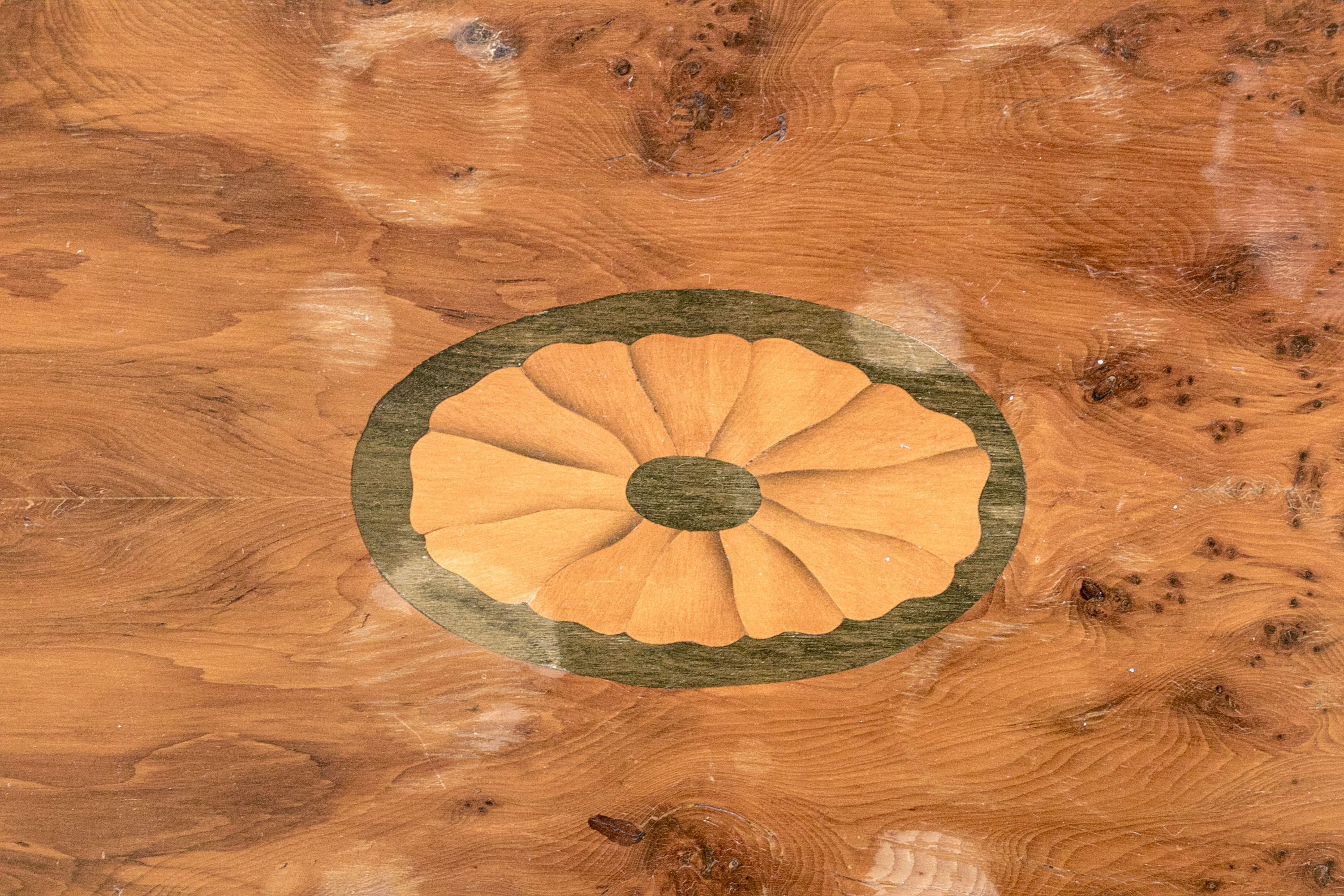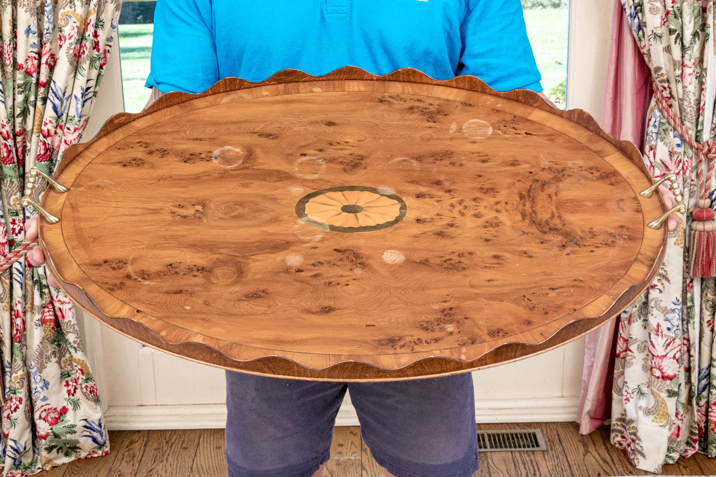 The oval tray with burl mahogany veneers with satinwood banded trim with a central marquetry inlaid foliate reserve. The oval serving tray with scalloped gallery and twin brass handles at either end.