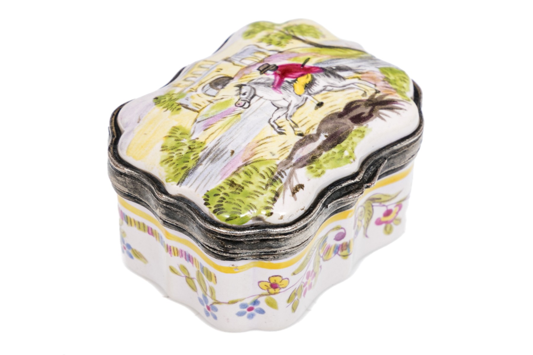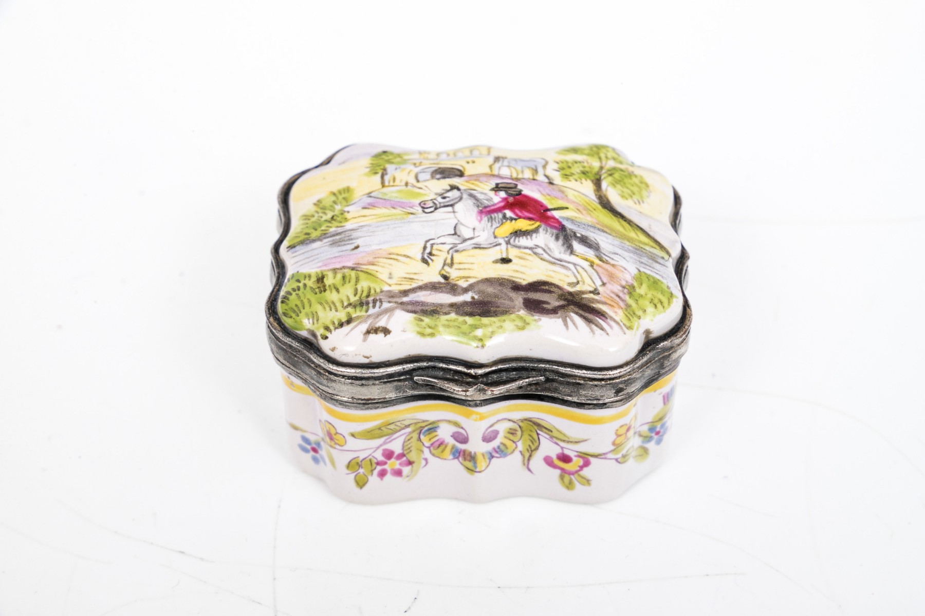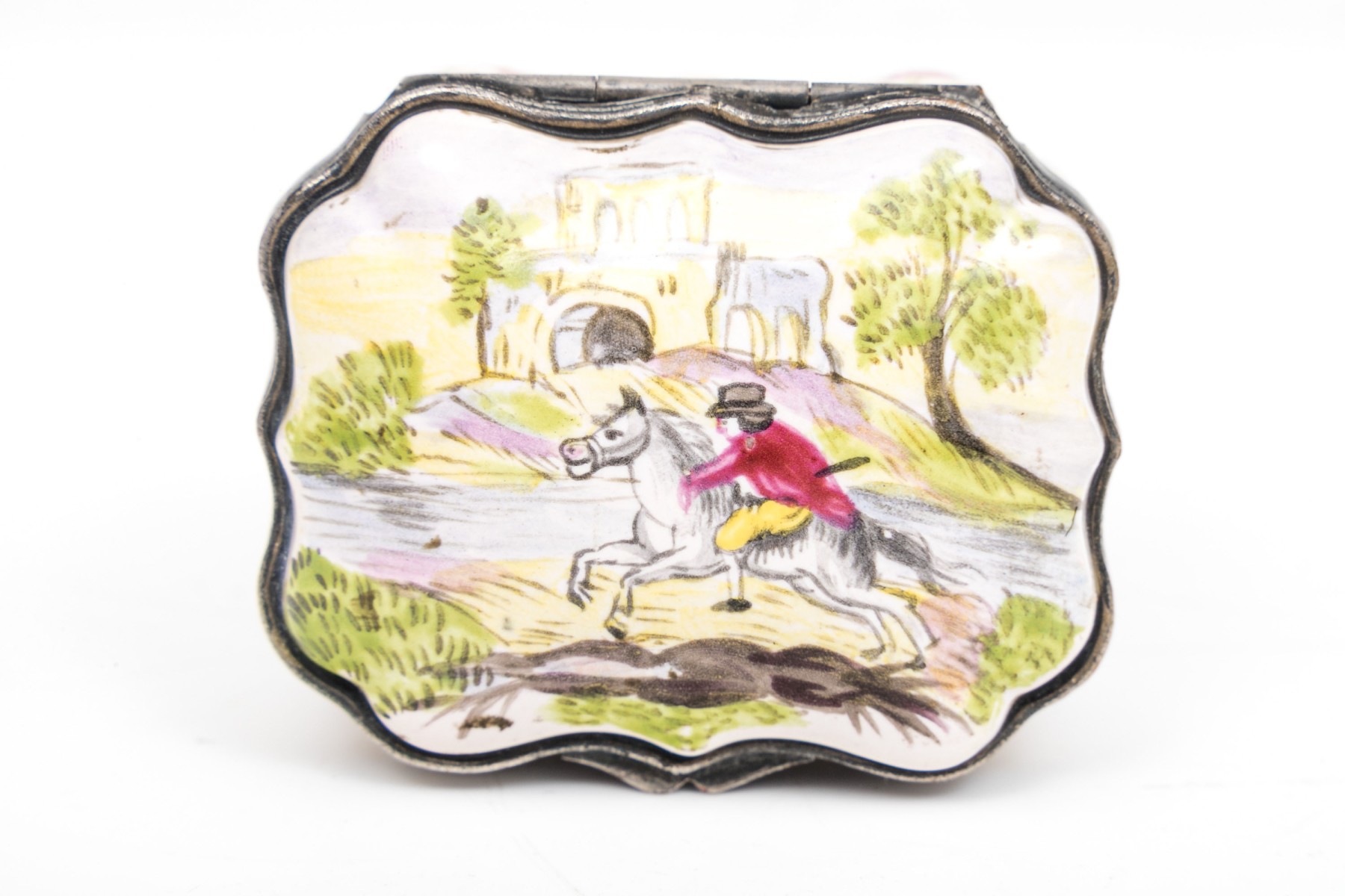 Antique mid 19th century charming hinged Battersea box, horse and rider motif