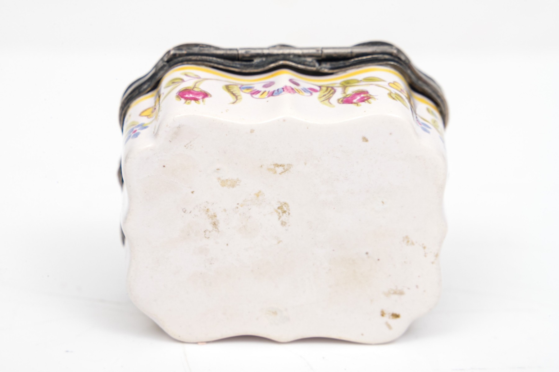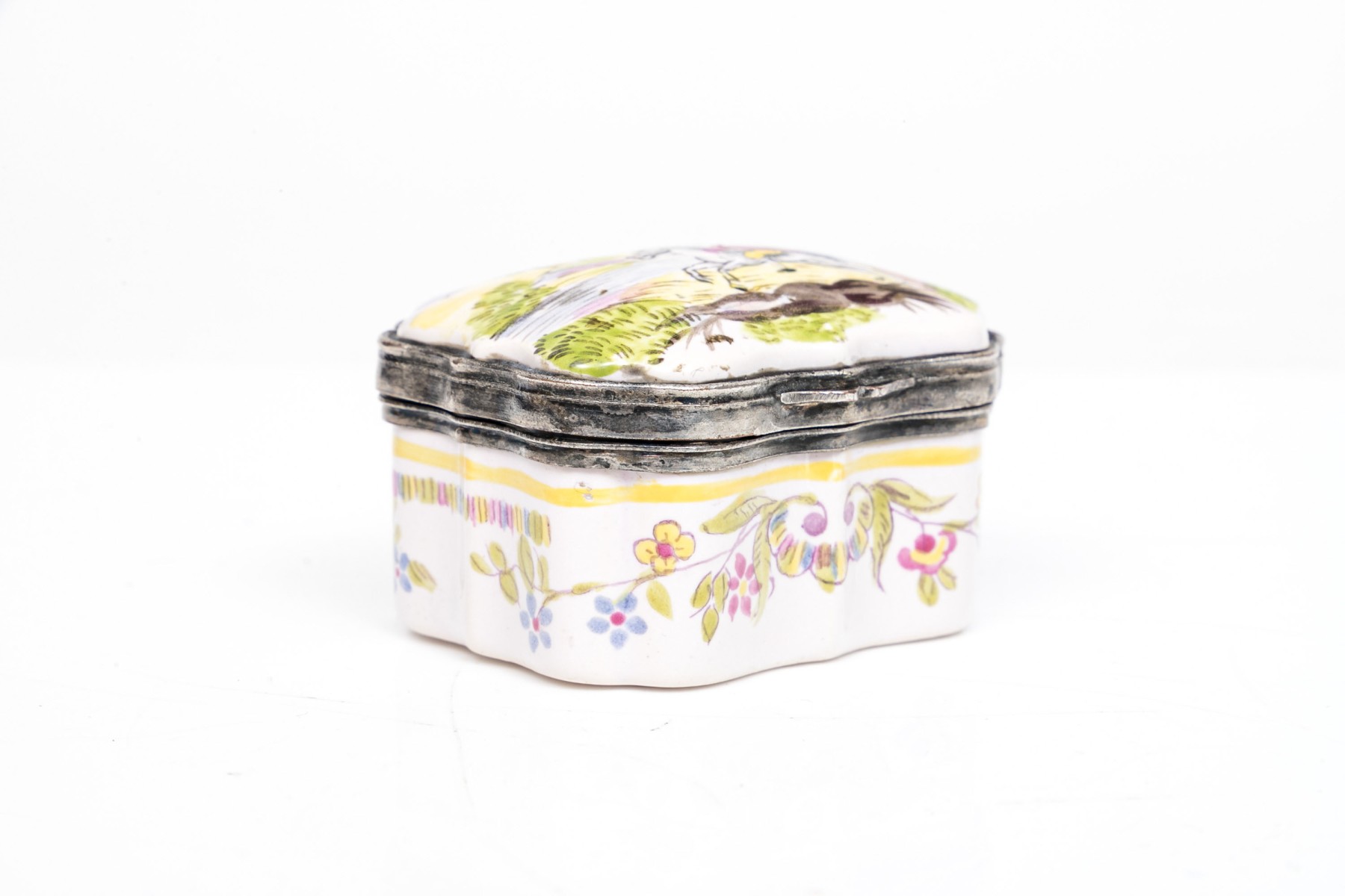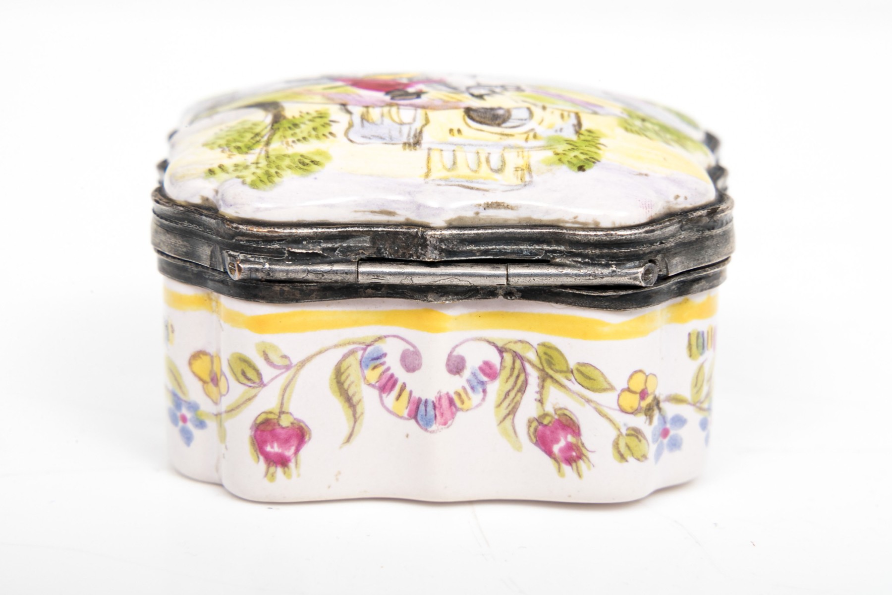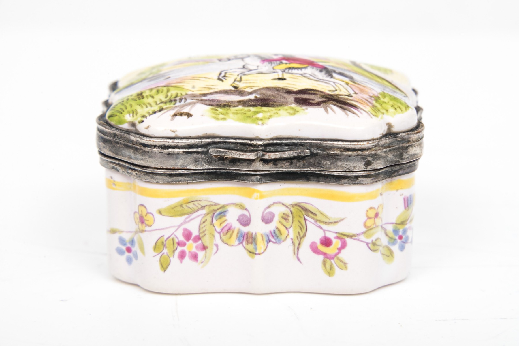 Antique mid 19th century charming hinged Battersea box, horse and rider motif