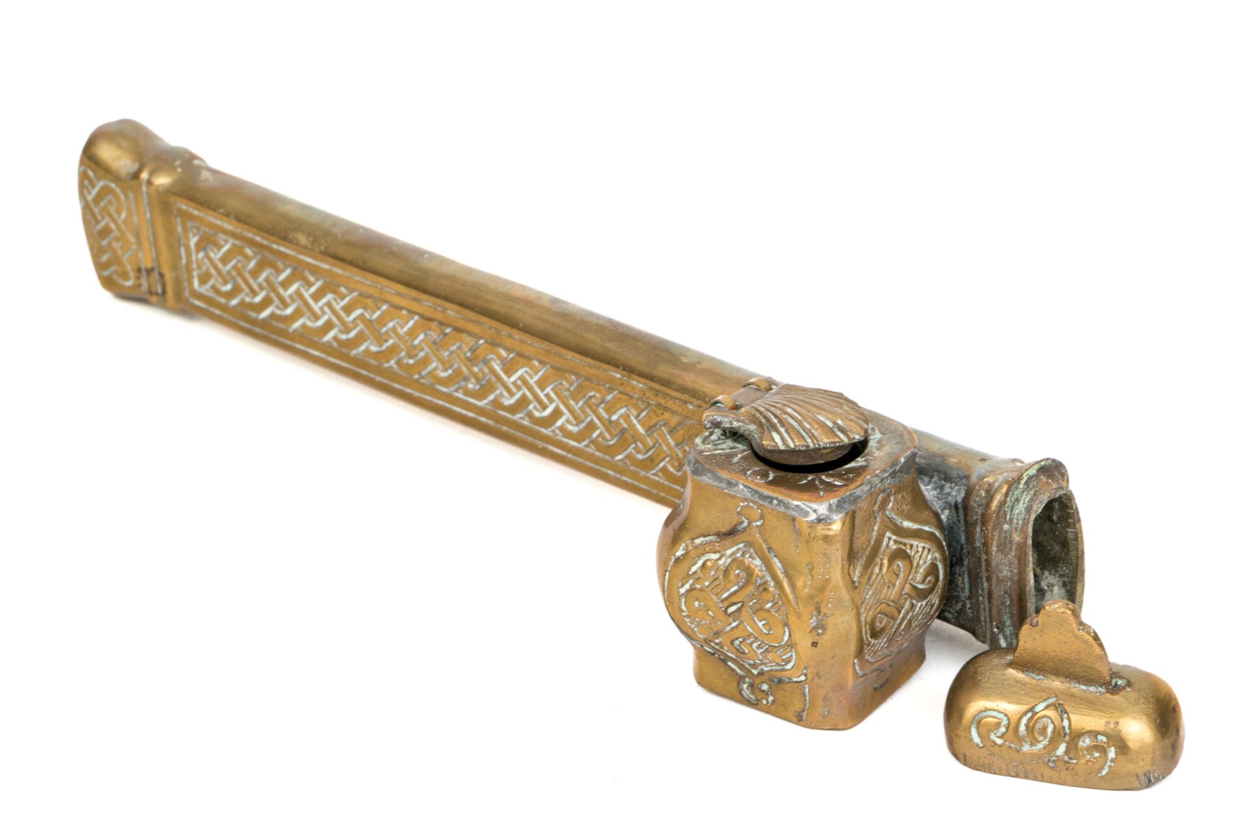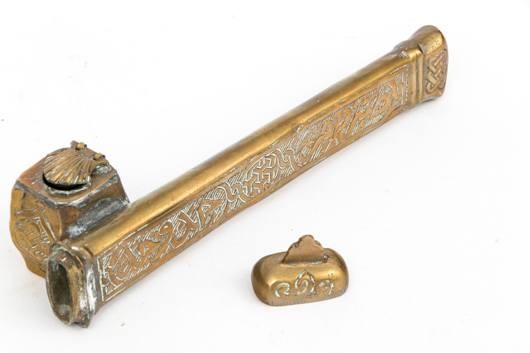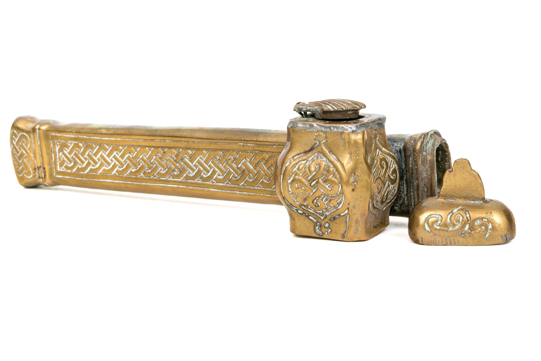 A fabulous antique Middle Eastern brass inkwell qalamdan consisting of a bombe forme inkwell with a shell-shaped lid attached to a tubular reed pen compartment. Beautifully detailed with ornate patterns throughout.