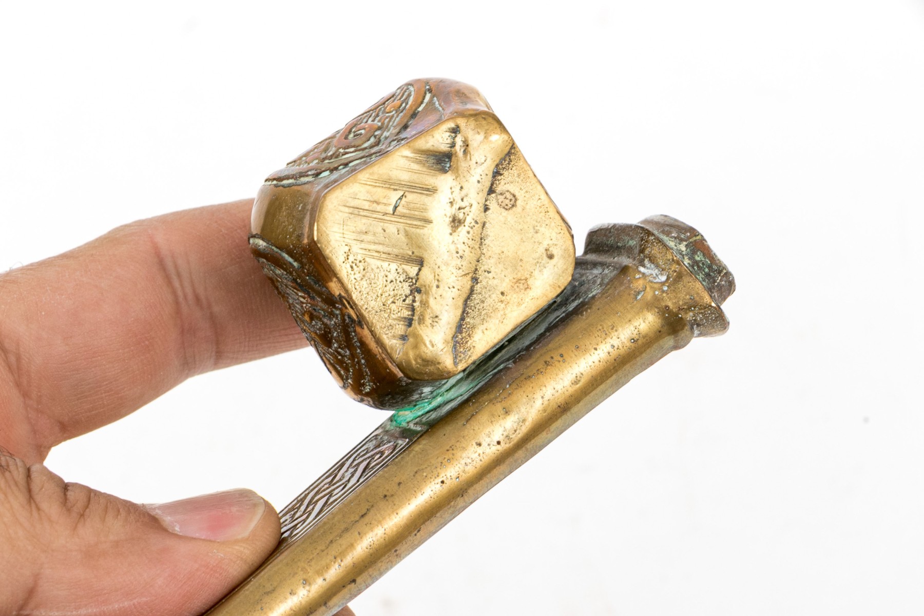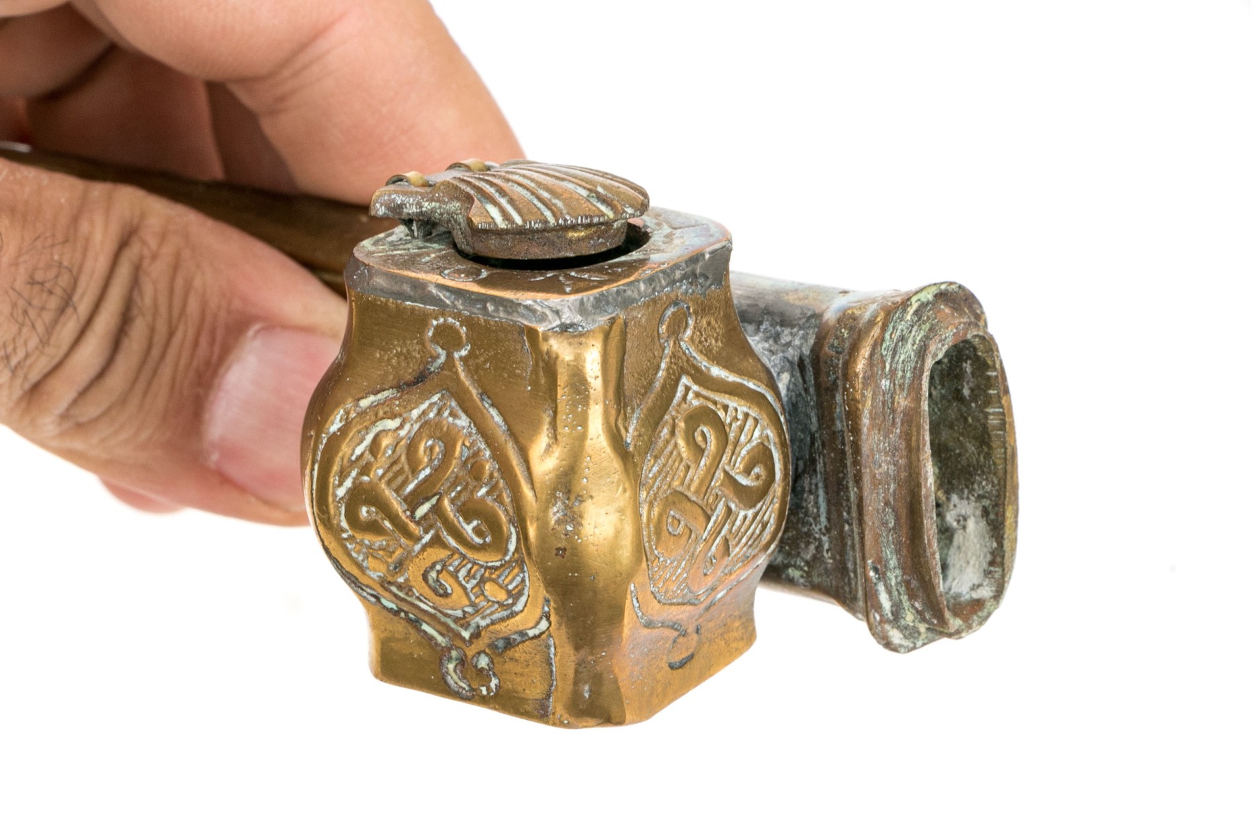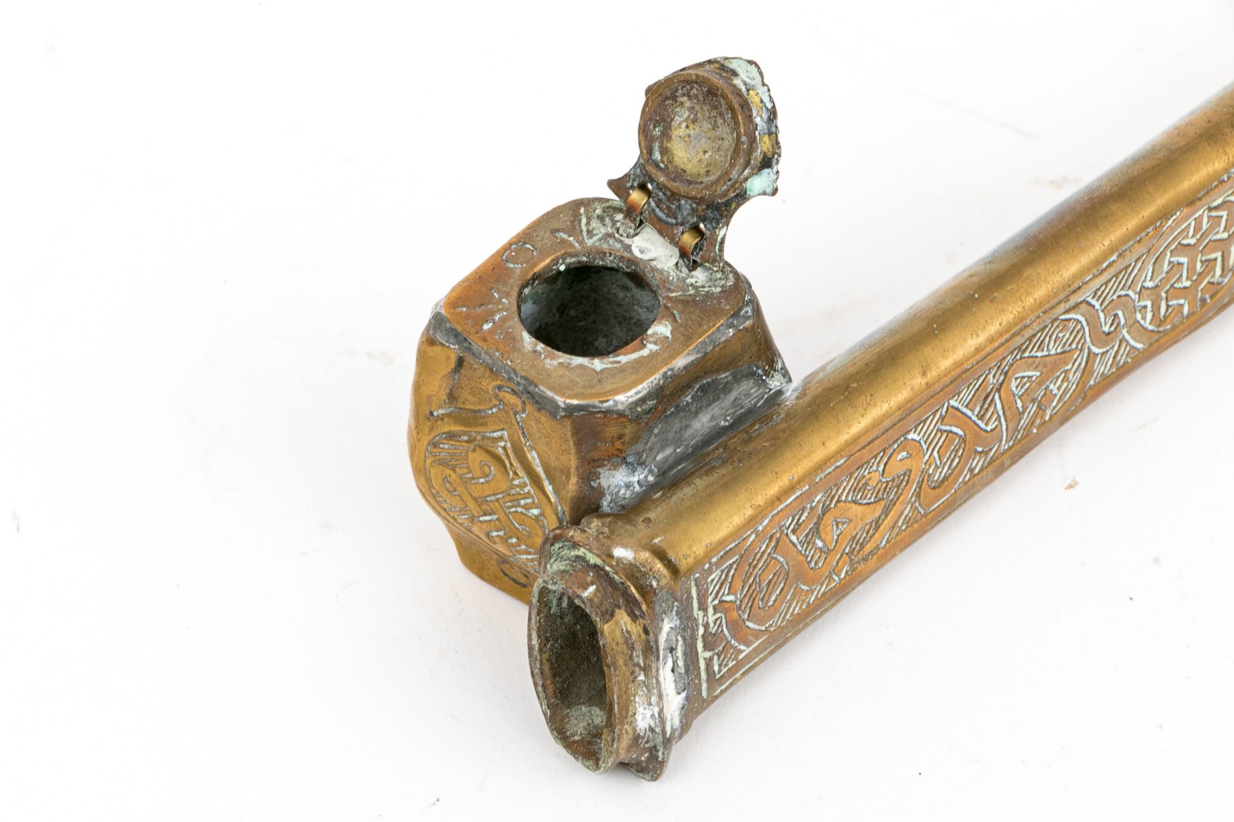 A fabulous antique Middle Eastern brass inkwell qalamdan consisting of a bombe forme inkwell with a shell-shaped lid attached to a tubular reed pen compartment. Beautifully detailed with ornate patterns throughout.
