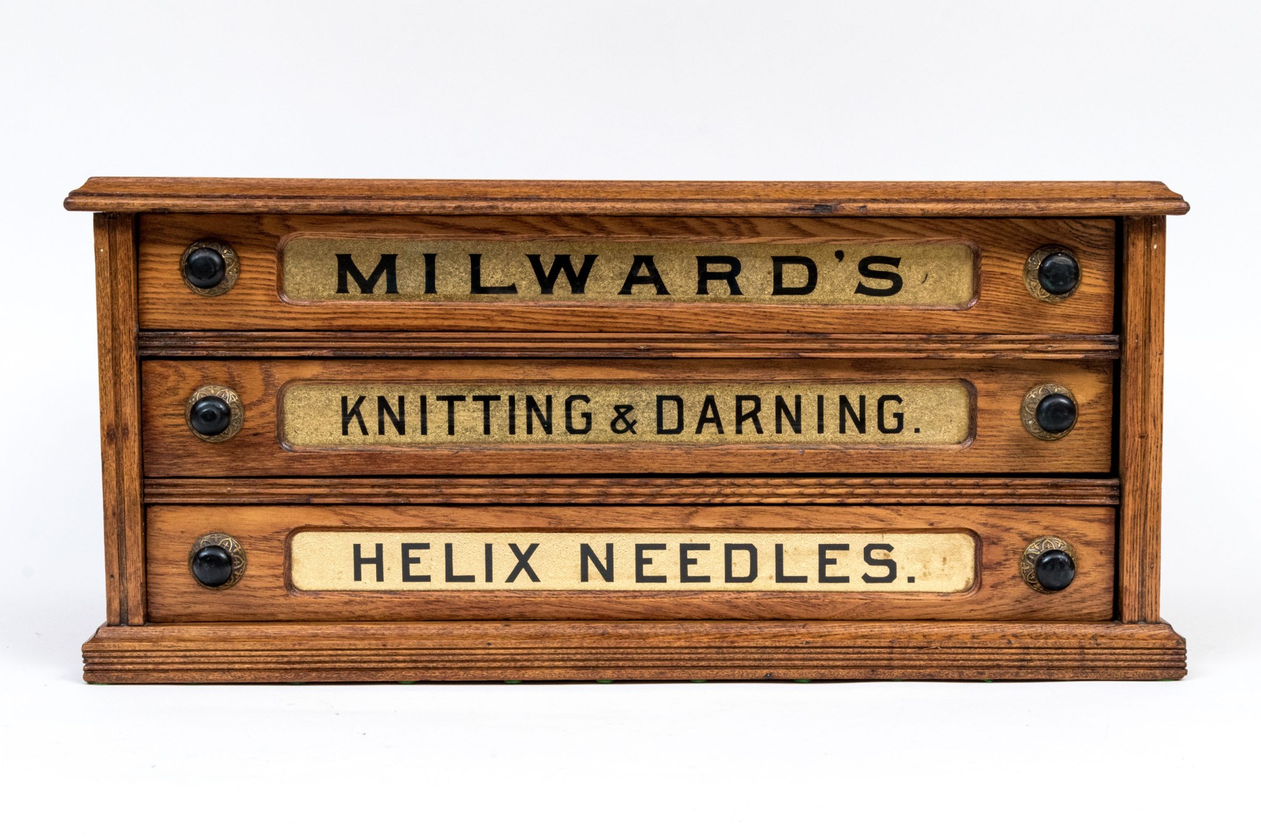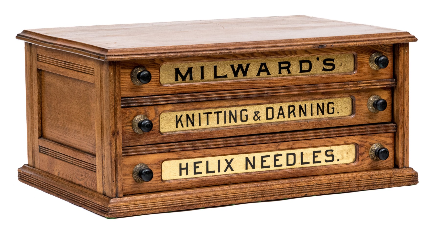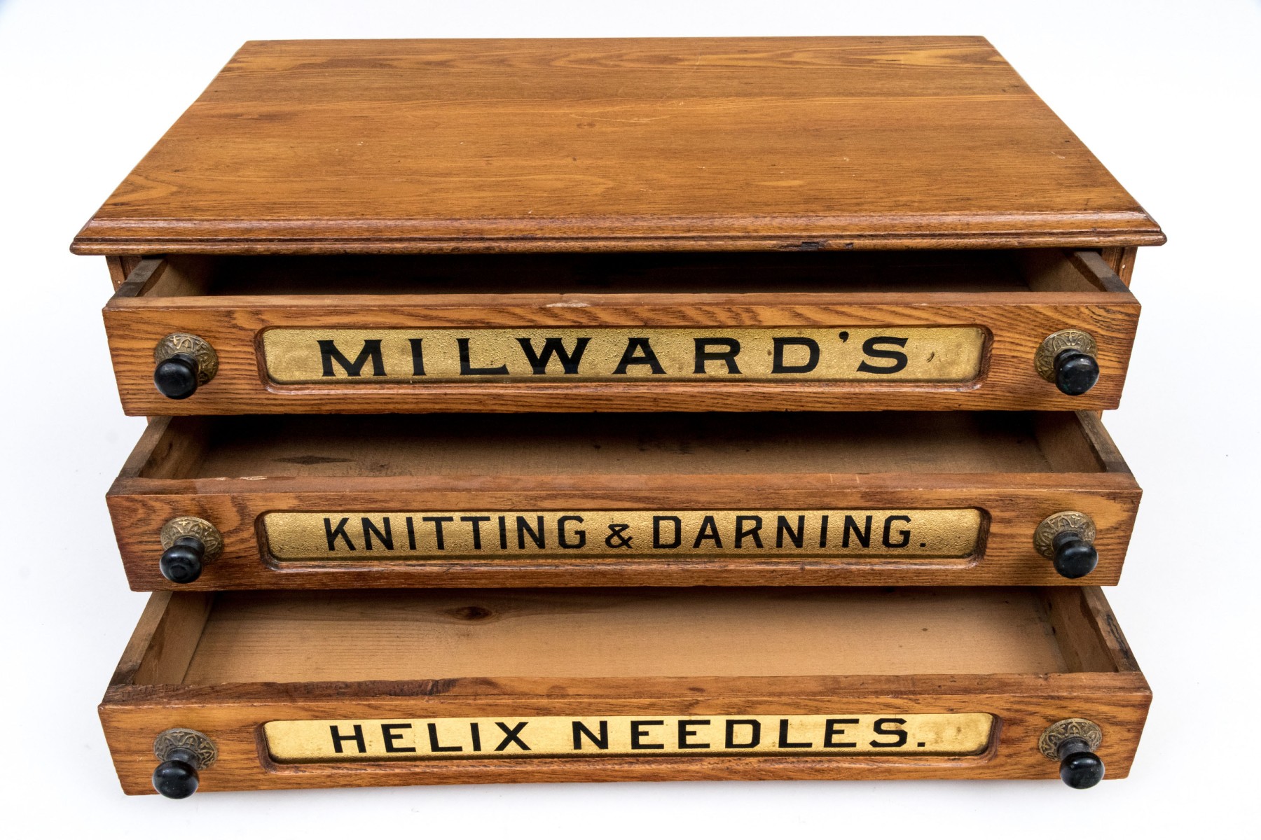 The top drawer reads "MILWARD'S", middle drawer reads "Knitting & Darning", lower drawer reads "HELIX NEEDLES"