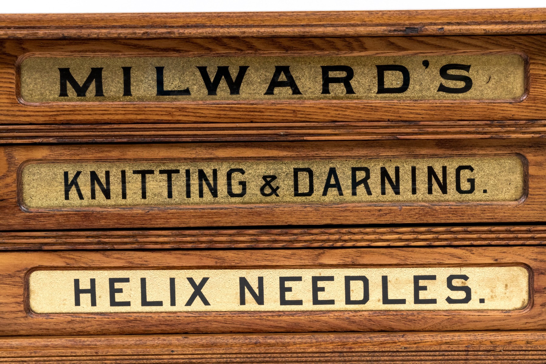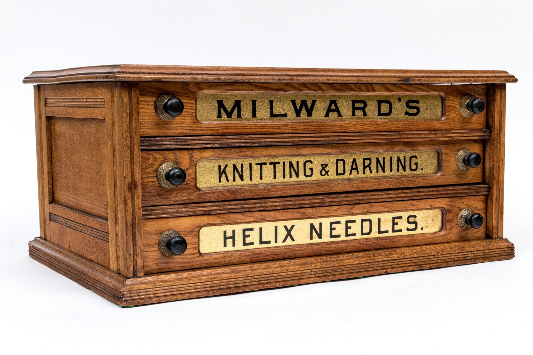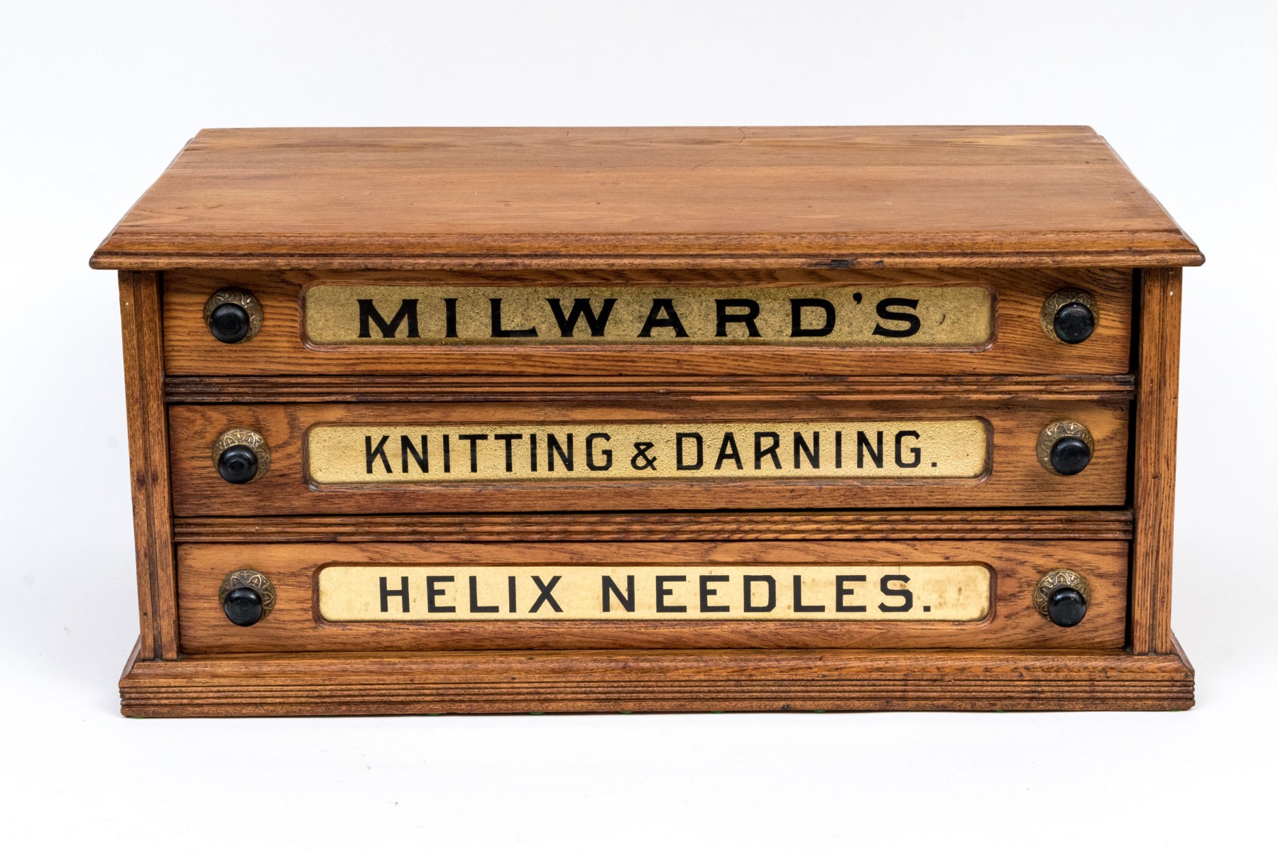 The top drawer reads "MILWARD'S", middle drawer reads "Knitting & Darning", lower drawer reads "HELIX NEEDLES"