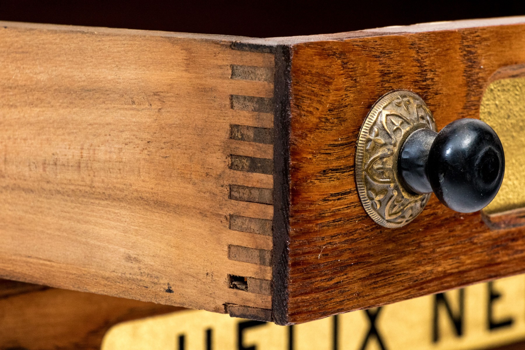 The wooden case has three drawers, each with labeled drawers with knob pulls.