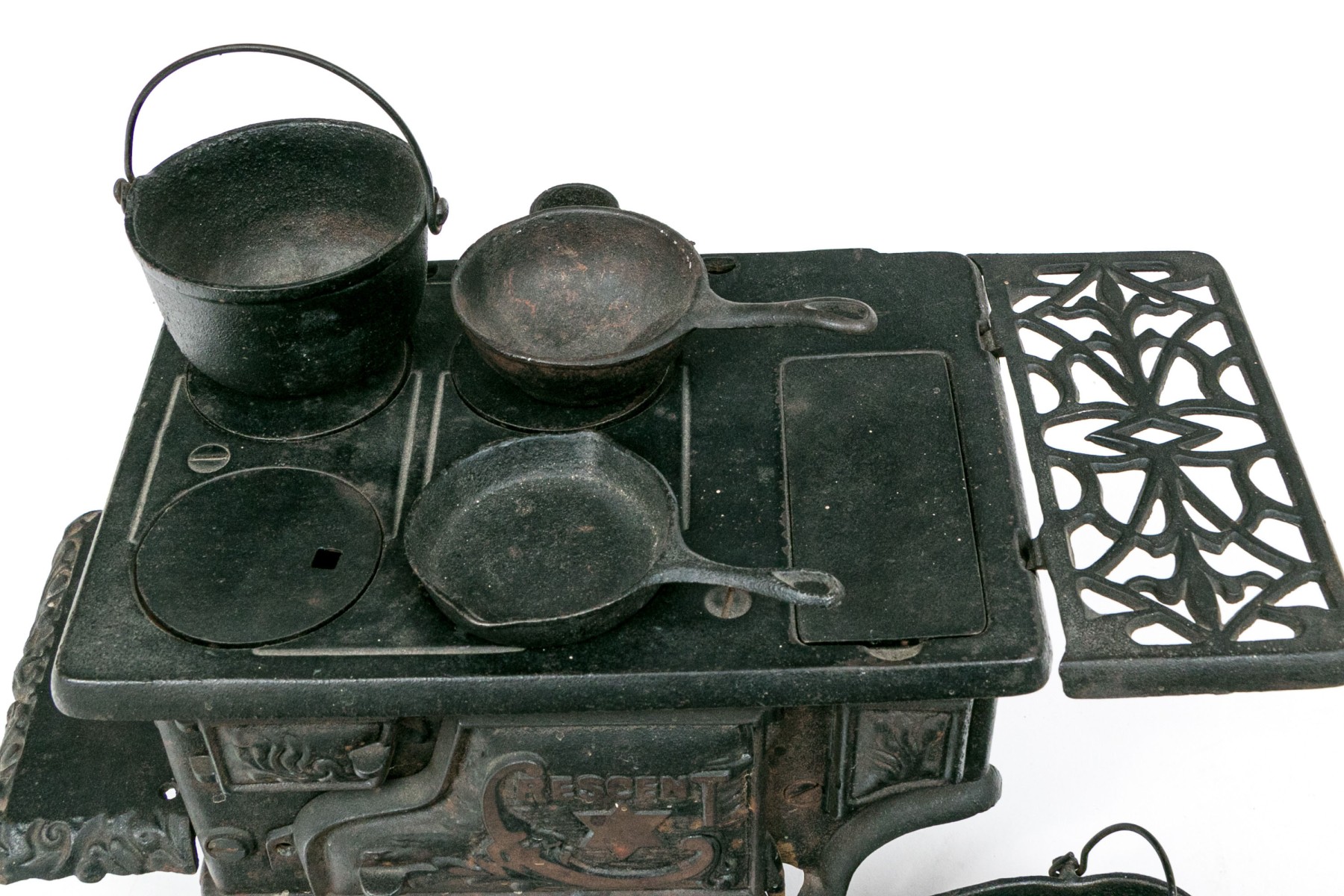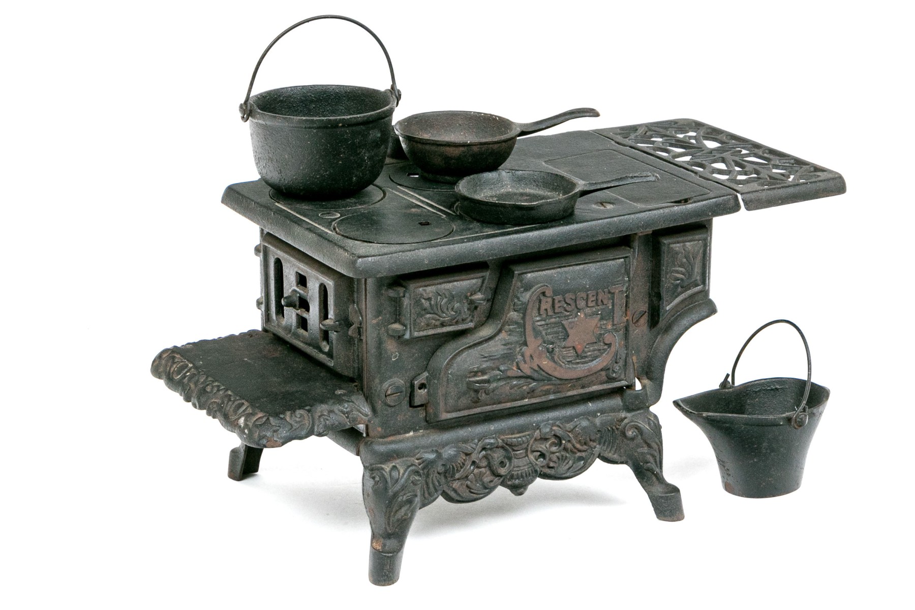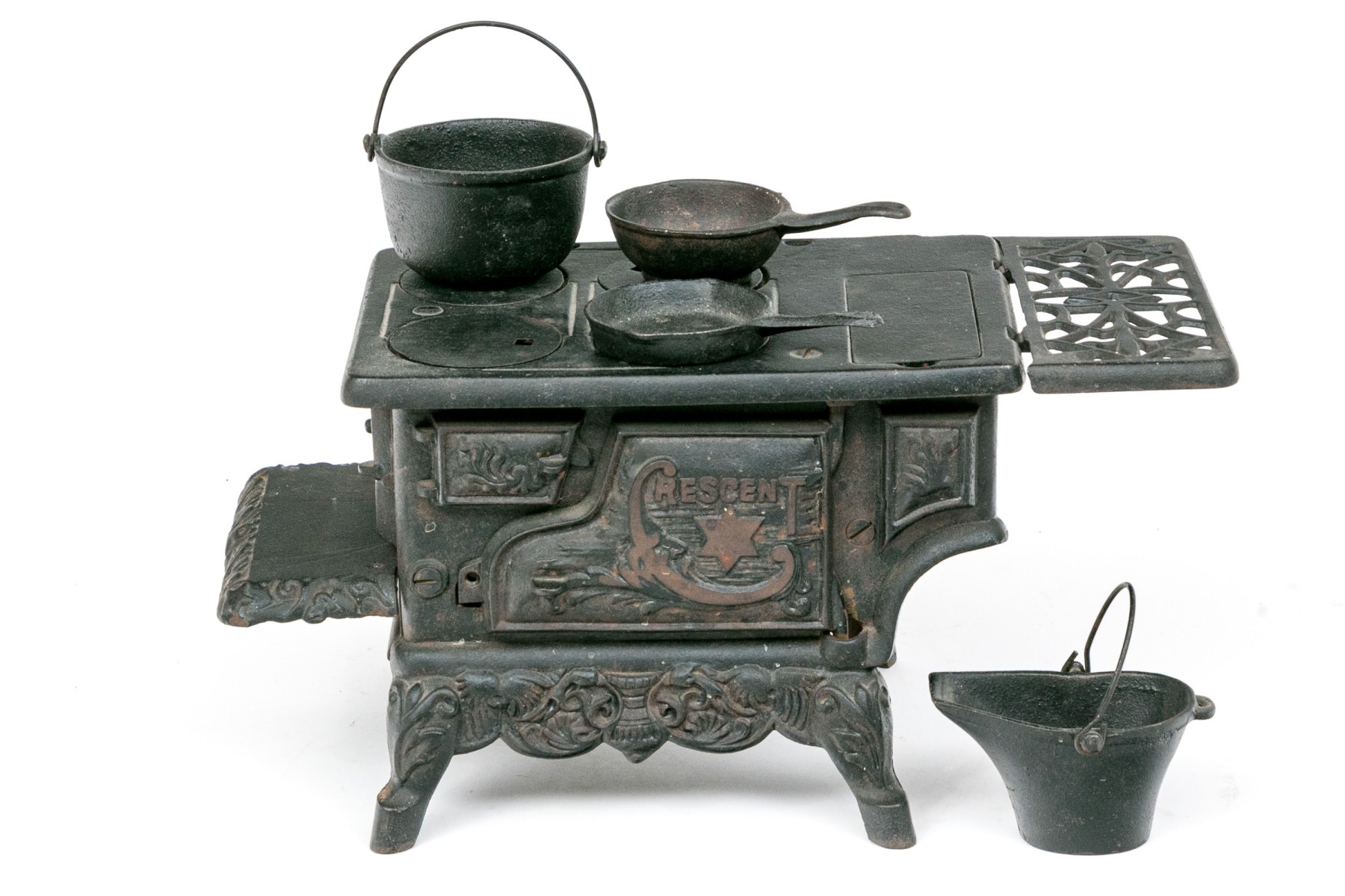 Marked Crescent with a star. The miniature stove with a door and openwork sections. Including a set of cookware and accessories- a fry pan, a sauce pot, a bucket and a scuttle.