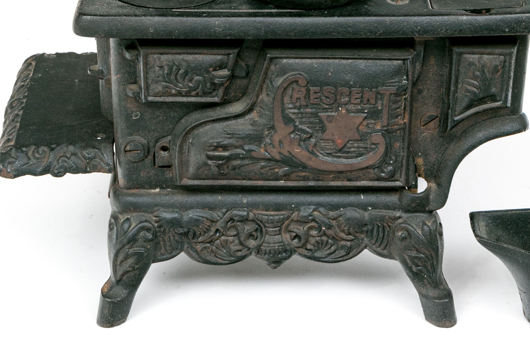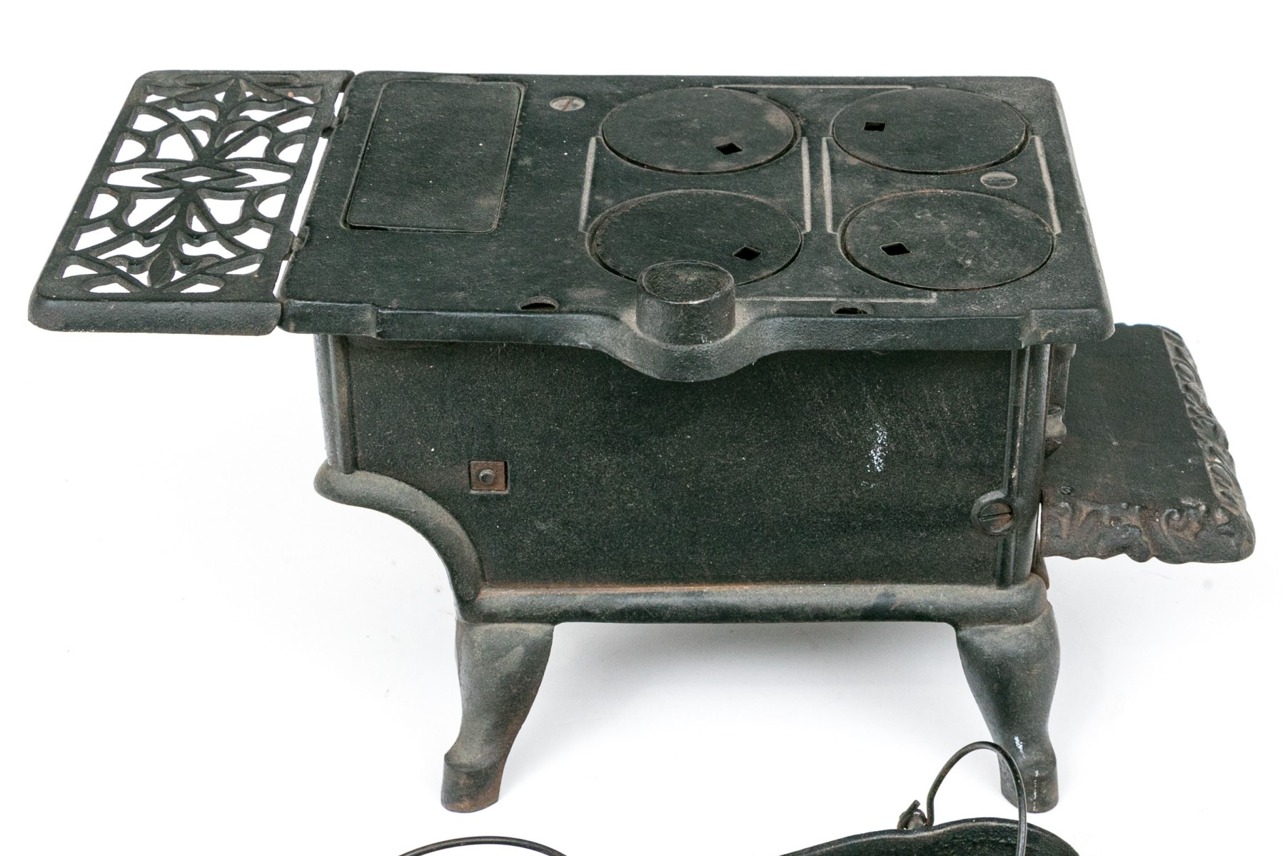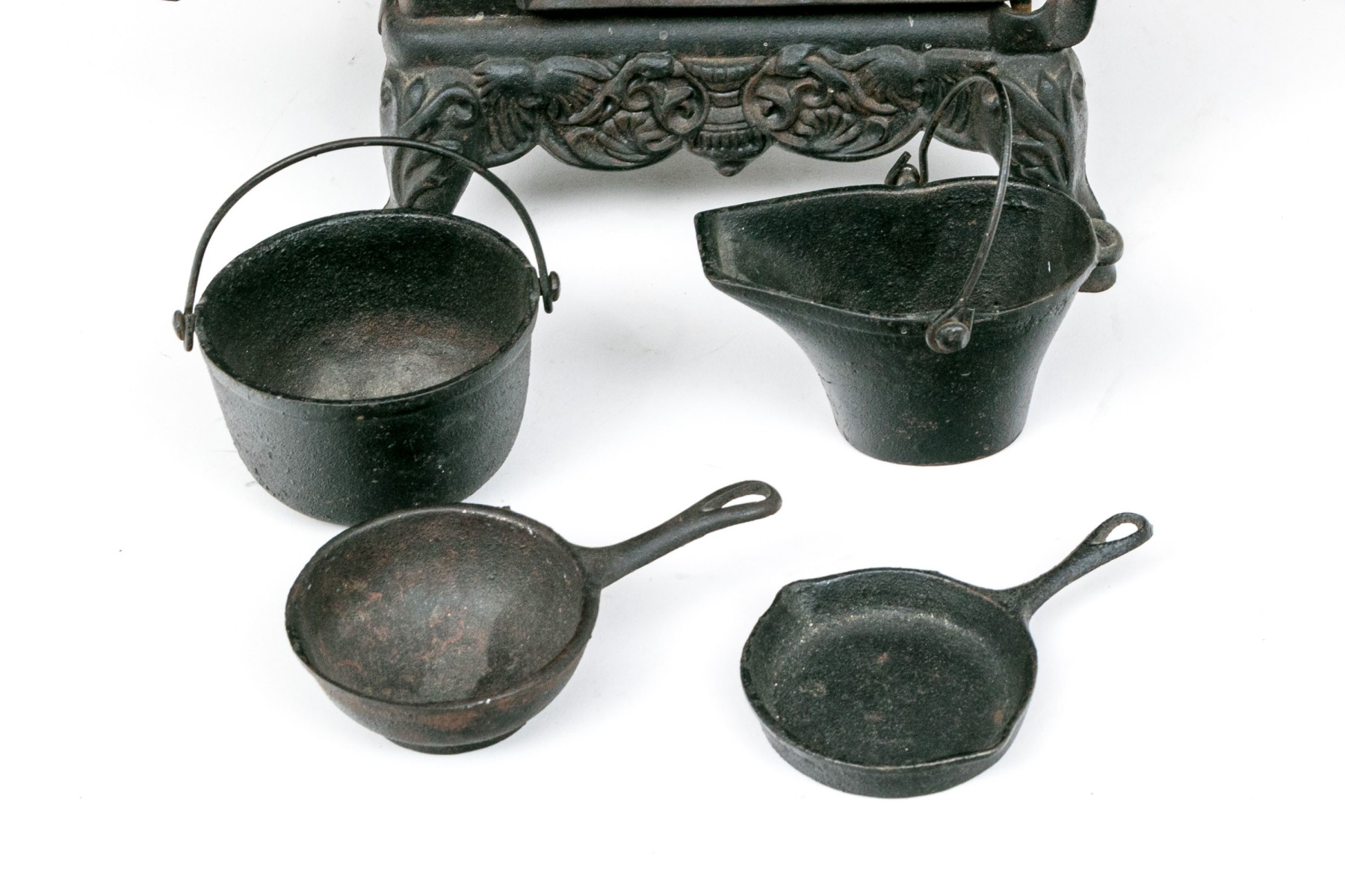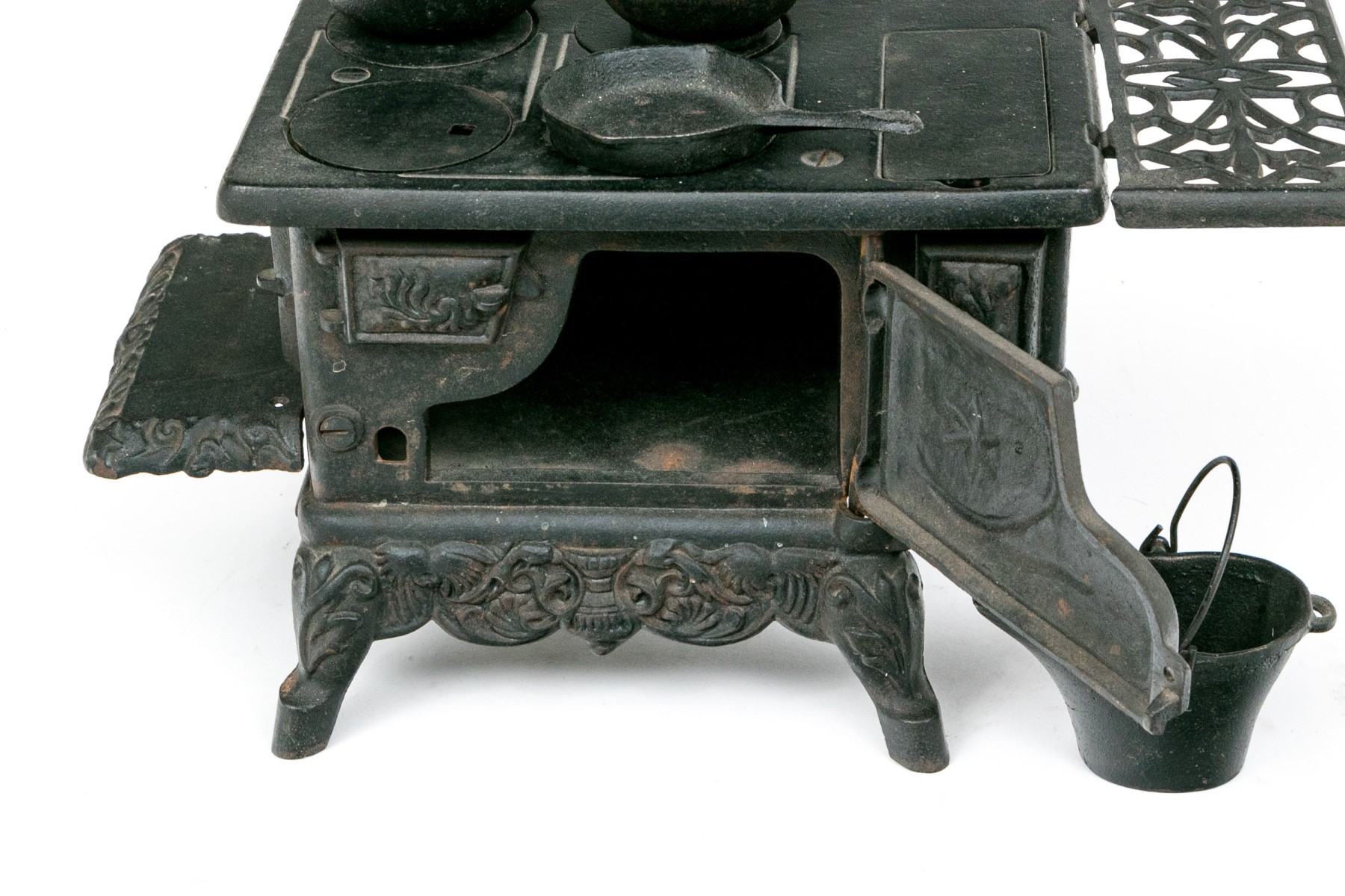 Marked Crescent with a star. The miniature stove with a door and openwork sections. Including a set of cookware and accessories- a fry pan, a sauce pot, a bucket and a scuttle.