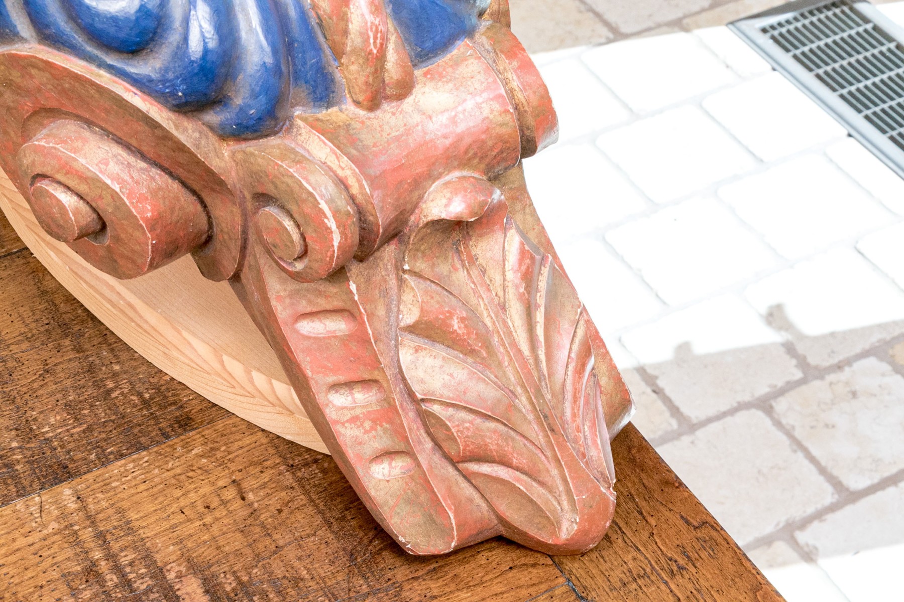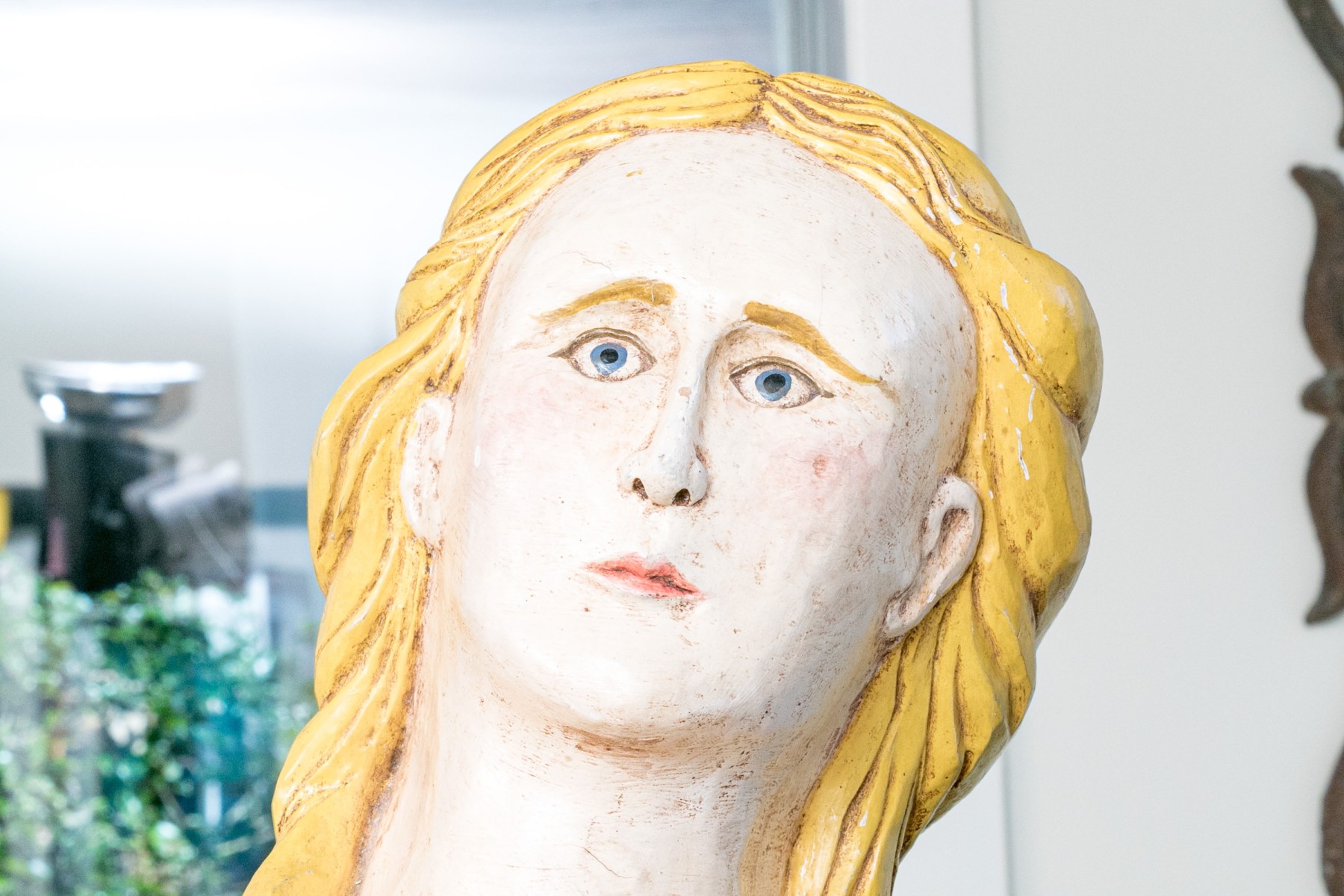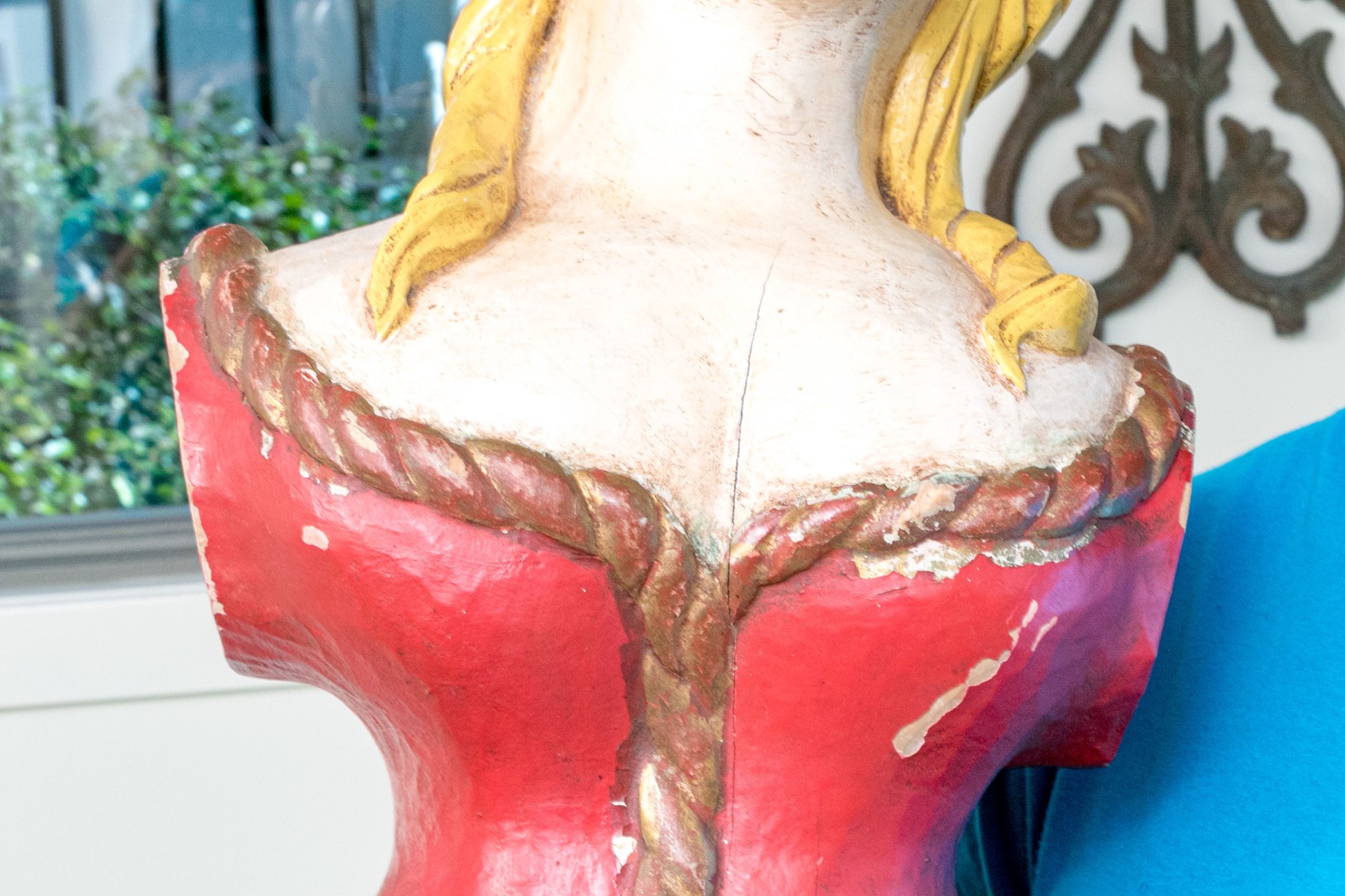 A fantastic carved and painted wood and plaster ship figurehead. In the form of a woman with blonde hair. Mounted on a wood stand.