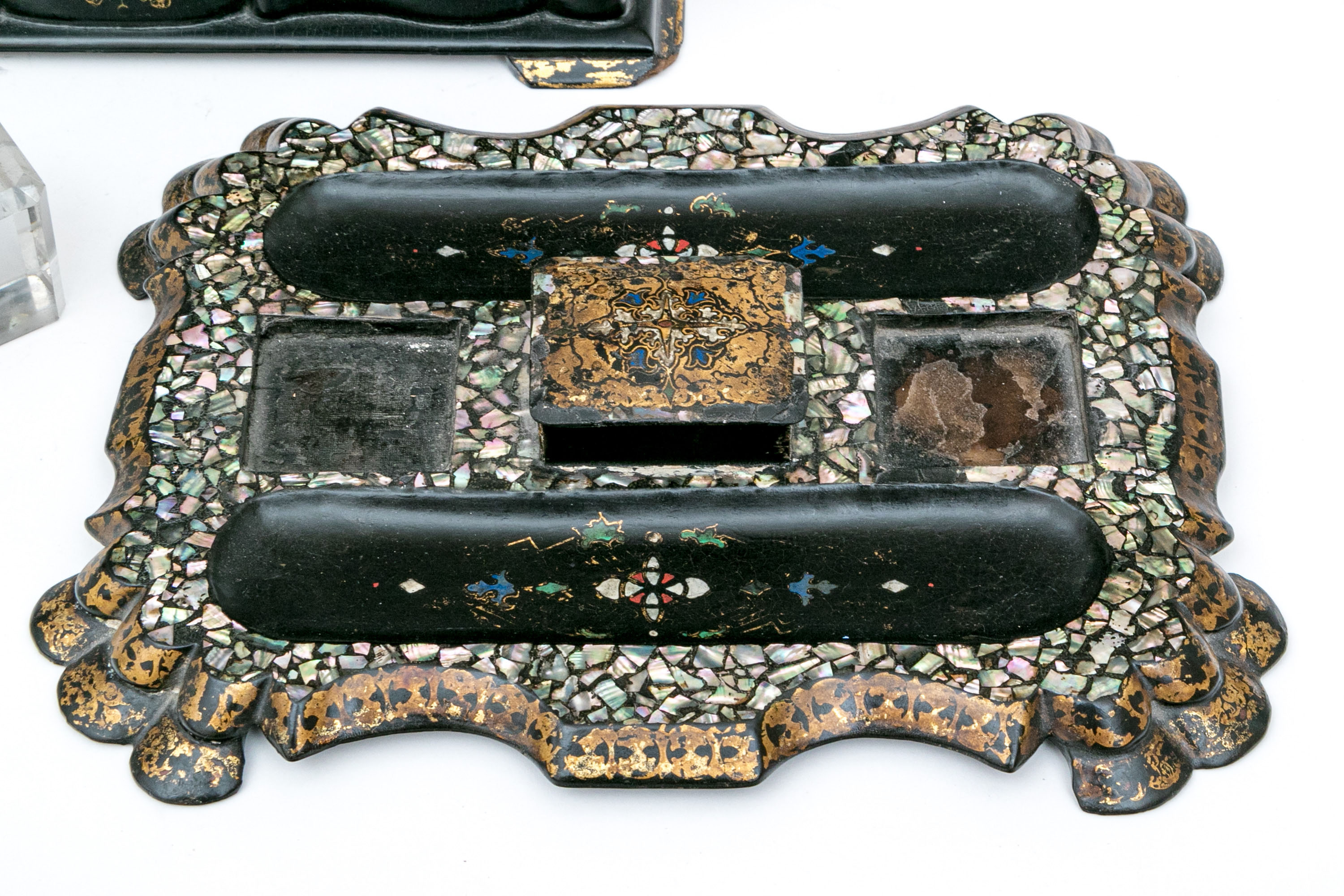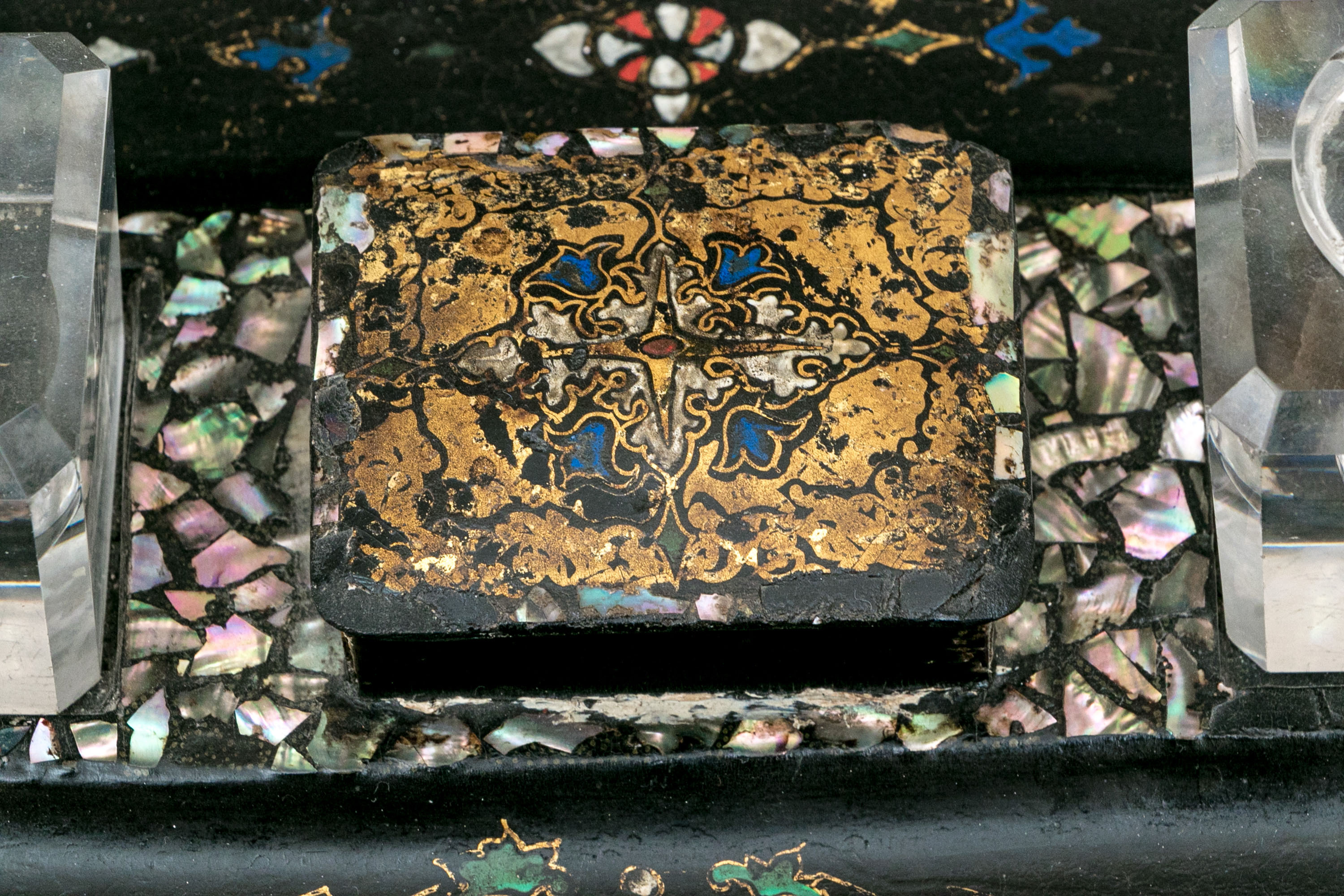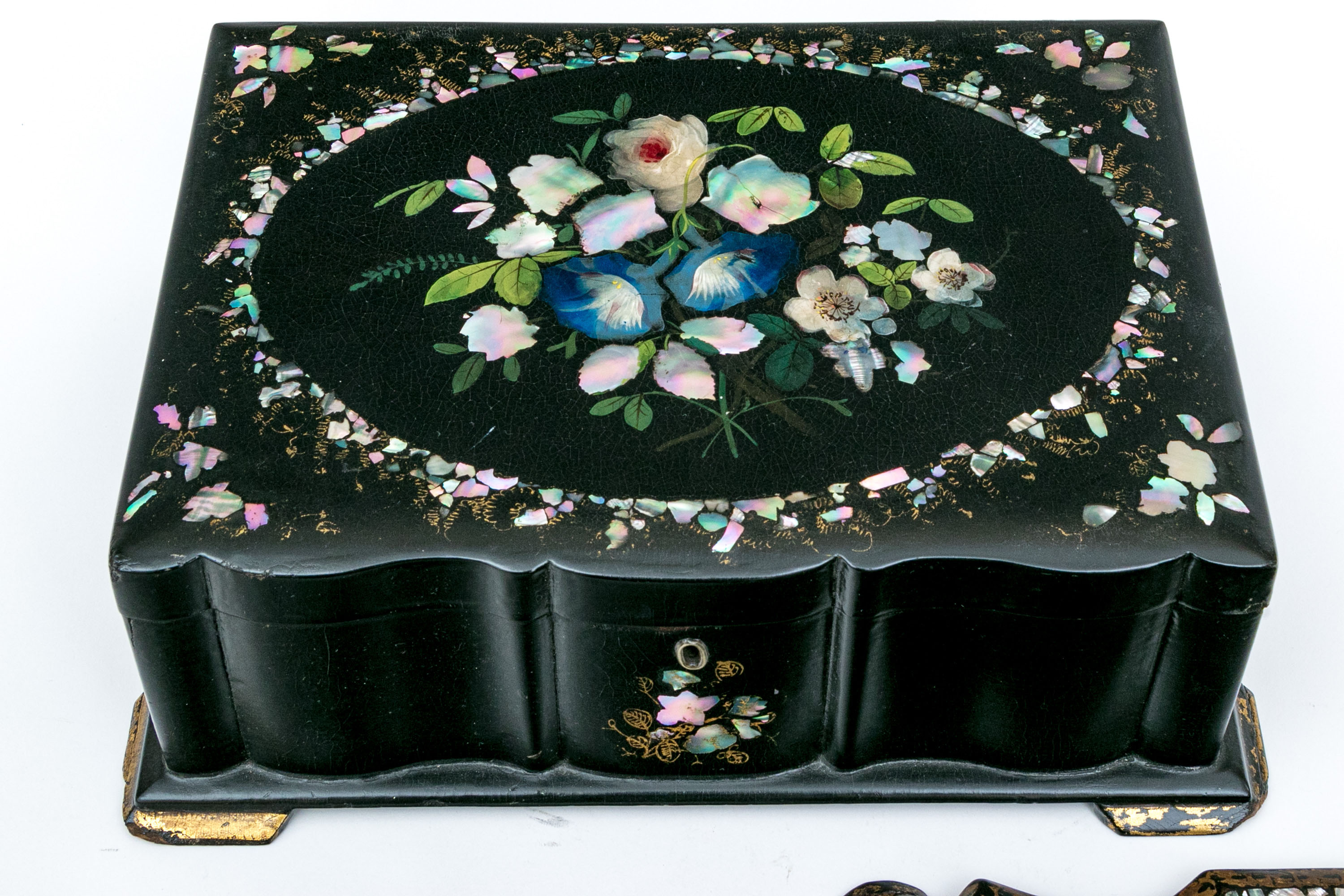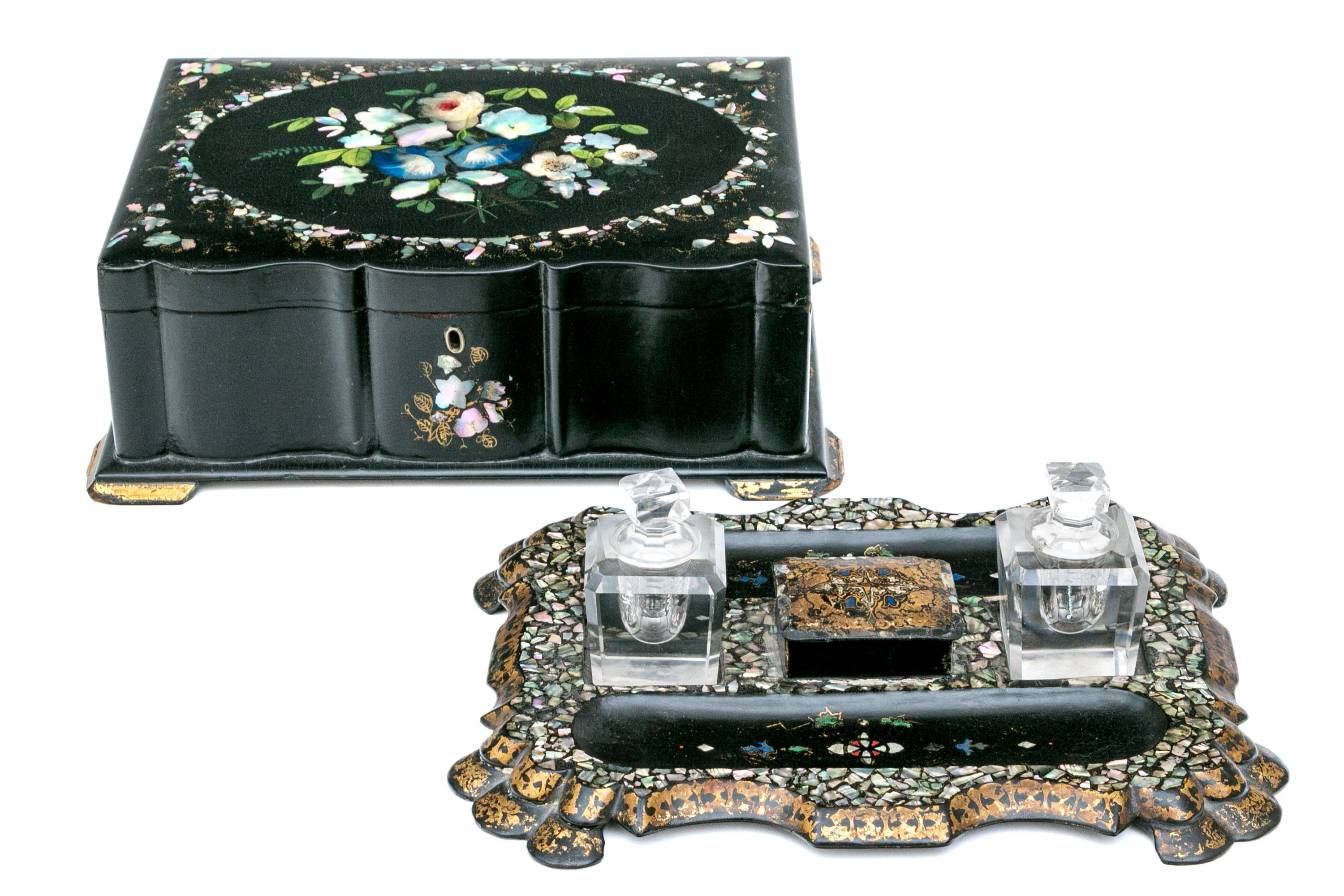 A wonderful antique collection of tabletop pieces including a desk stand with two inkwells and a center lidded box flanked by oval recessions on a mother of pearl mosaic base with scalloped feet. Accompanied by a beautiful black lacquered jewelry box with a floral spray at the center of an oval scene lined with mother of pearl, sporting a serpentine front over stout bracket legs.