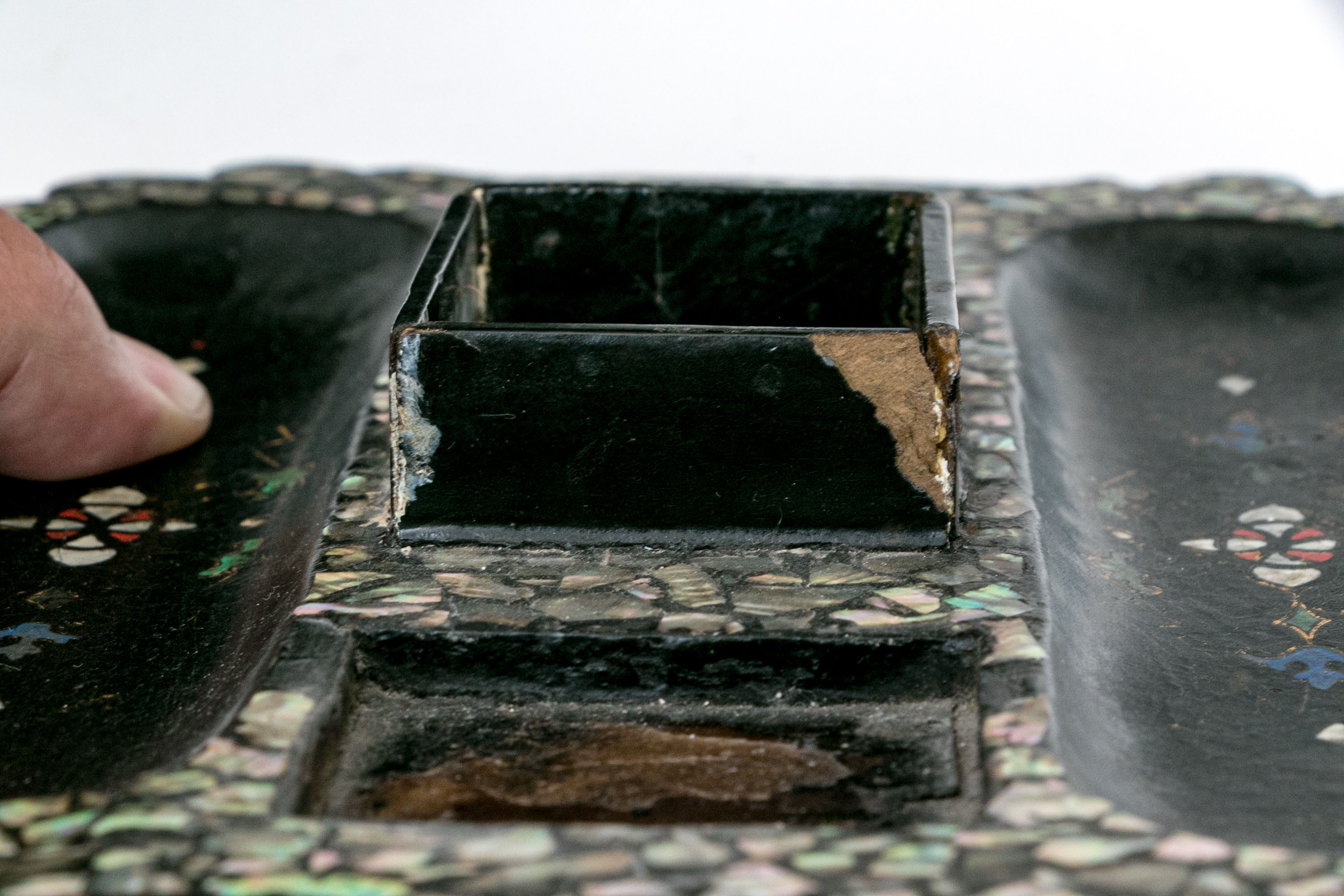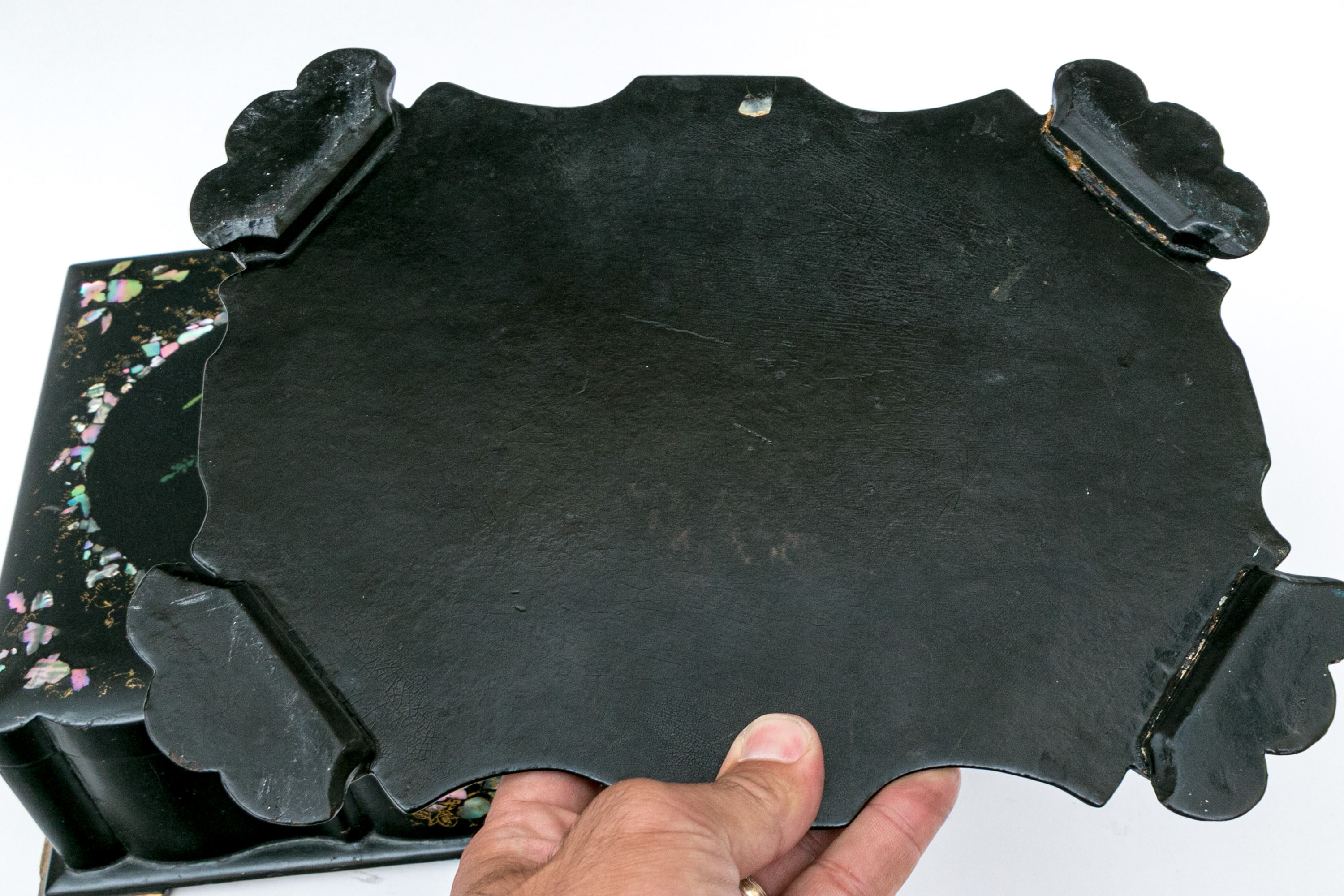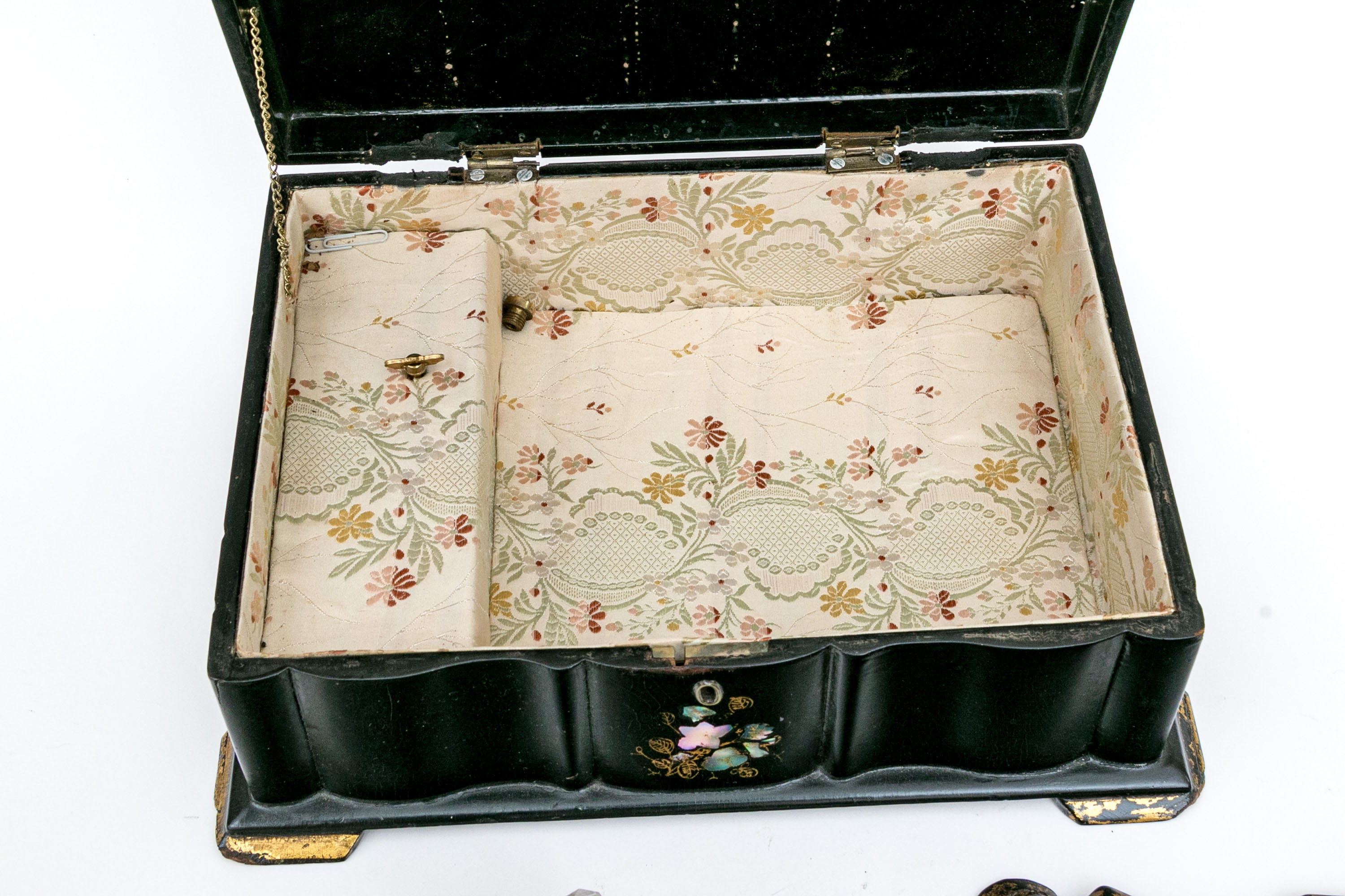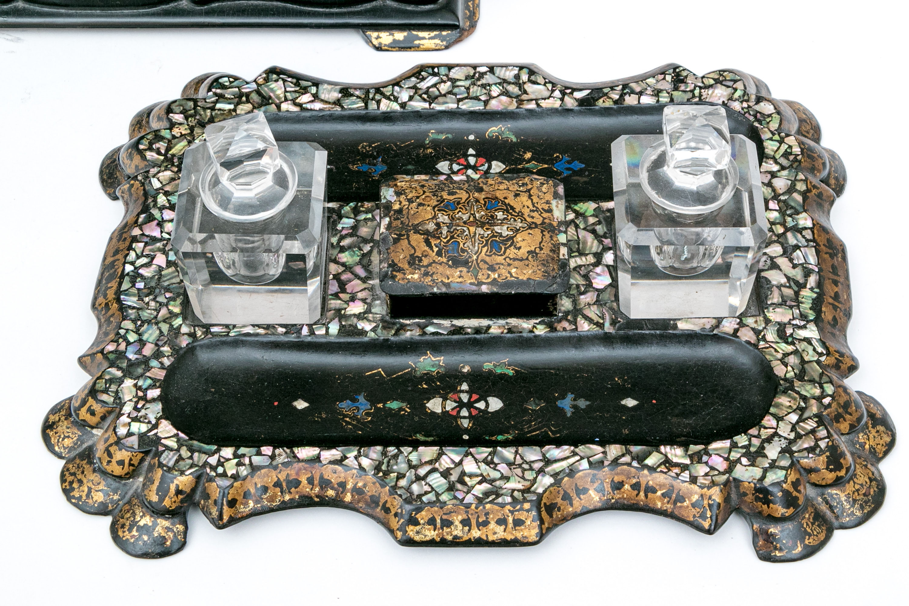 A wonderful antique collection of tabletop pieces including a desk stand with two inkwells and a center lidded box flanked by oval recessions on a mother of pearl mosaic base with scalloped feet. Accompanied by a beautiful black lacquered jewelry box with a floral spray at the center of an oval scene lined with mother of pearl, sporting a serpentine front over stout bracket legs.