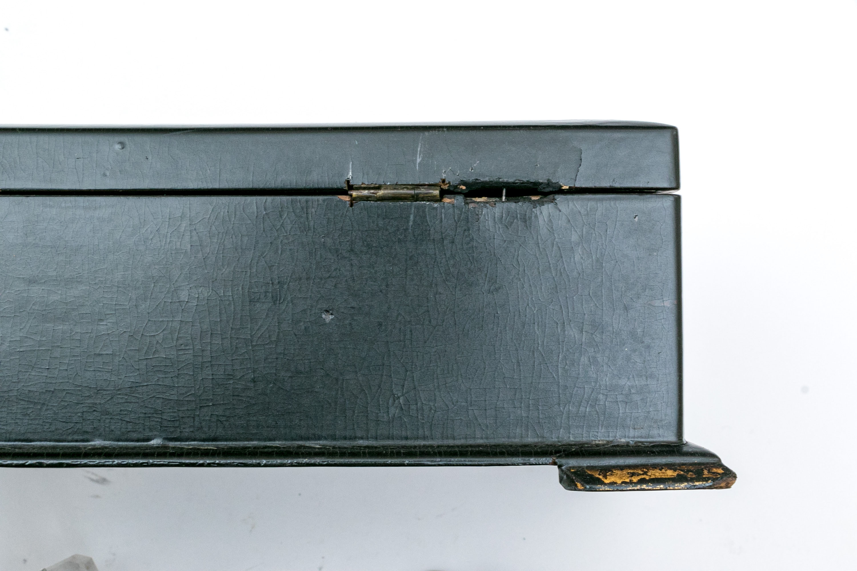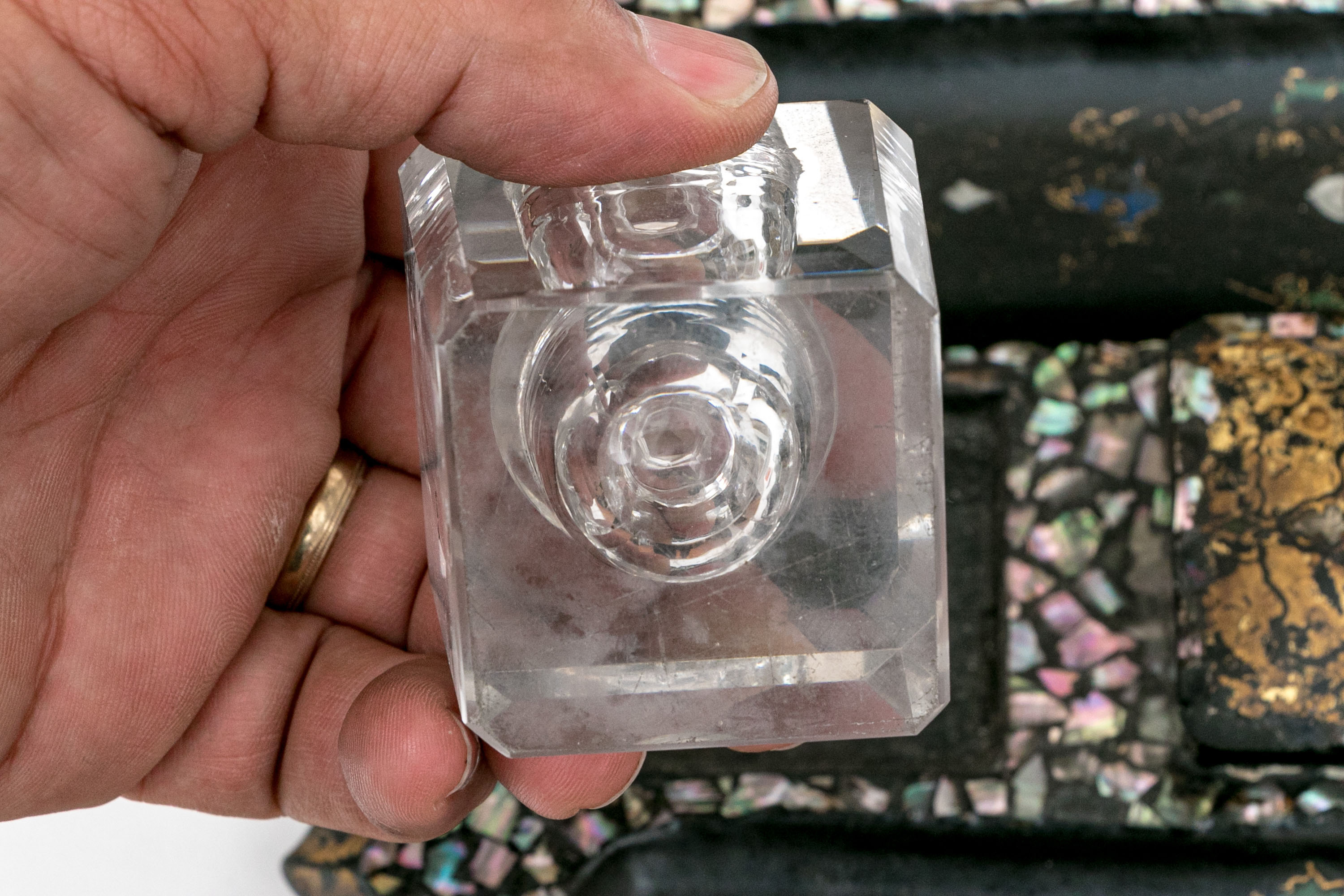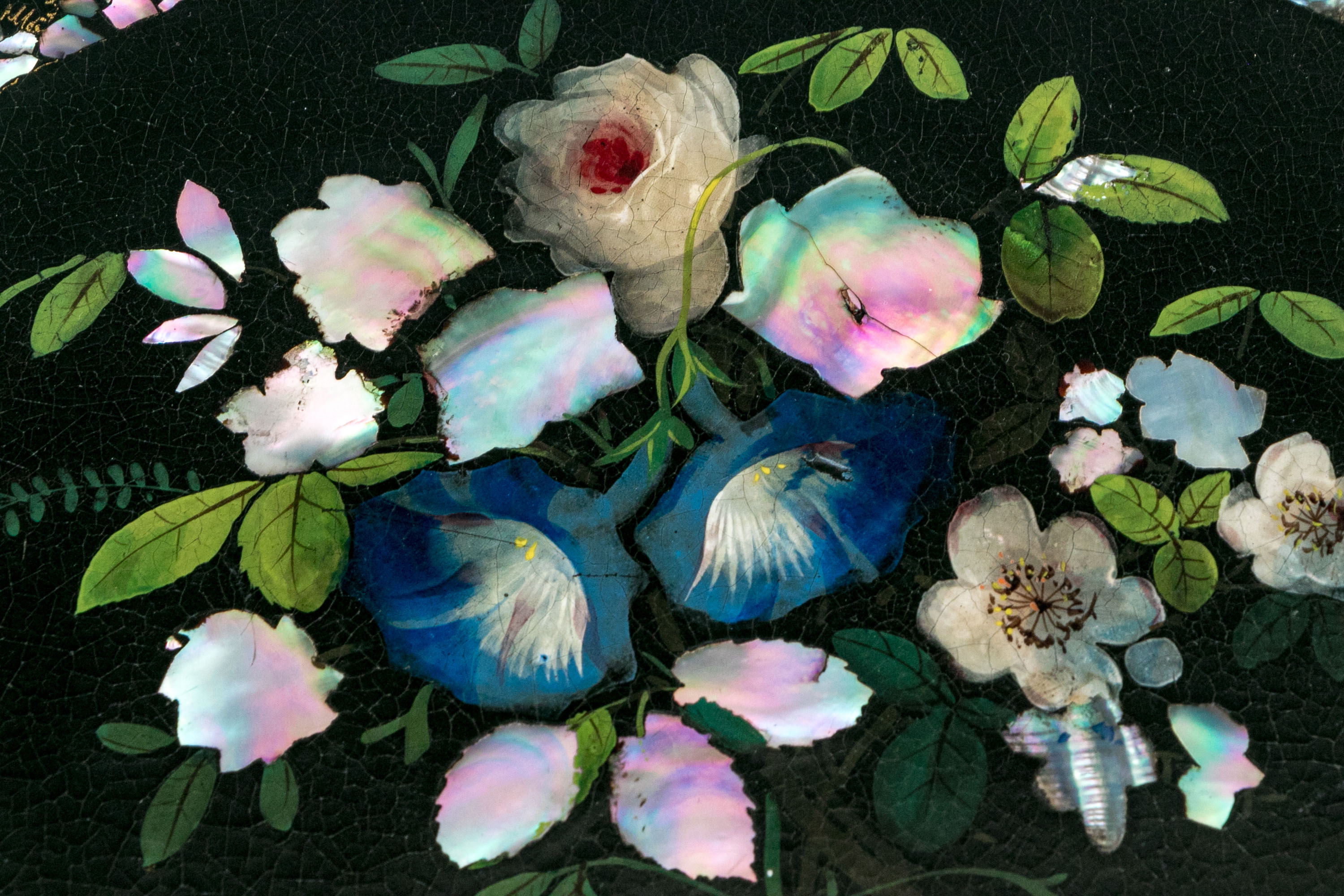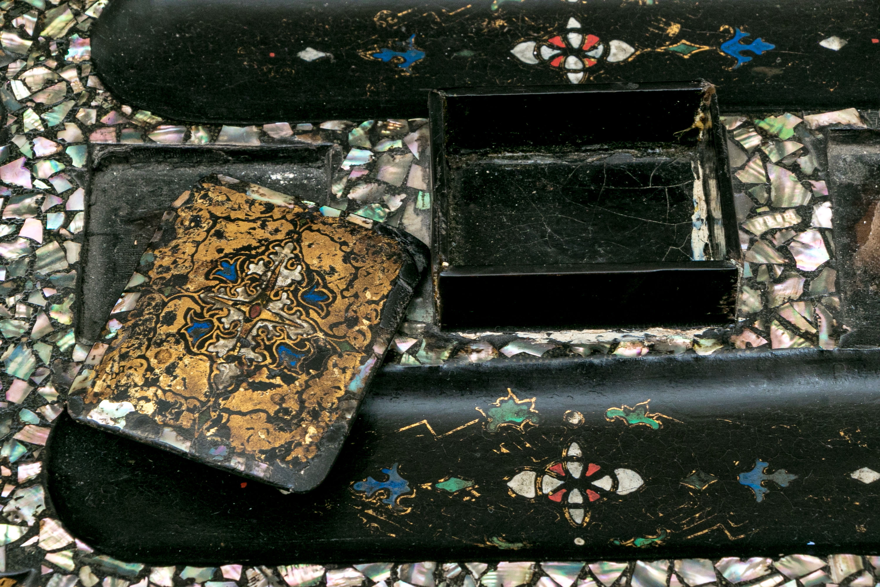 A wonderful antique collection of tabletop pieces including a desk stand with two inkwells and a center lidded box flanked by oval recessions on a mother of pearl mosaic base with scalloped feet. Accompanied by a beautiful black lacquered jewelry box with a floral spray at the center of an oval scene lined with mother of pearl, sporting a serpentine front over stout bracket legs.