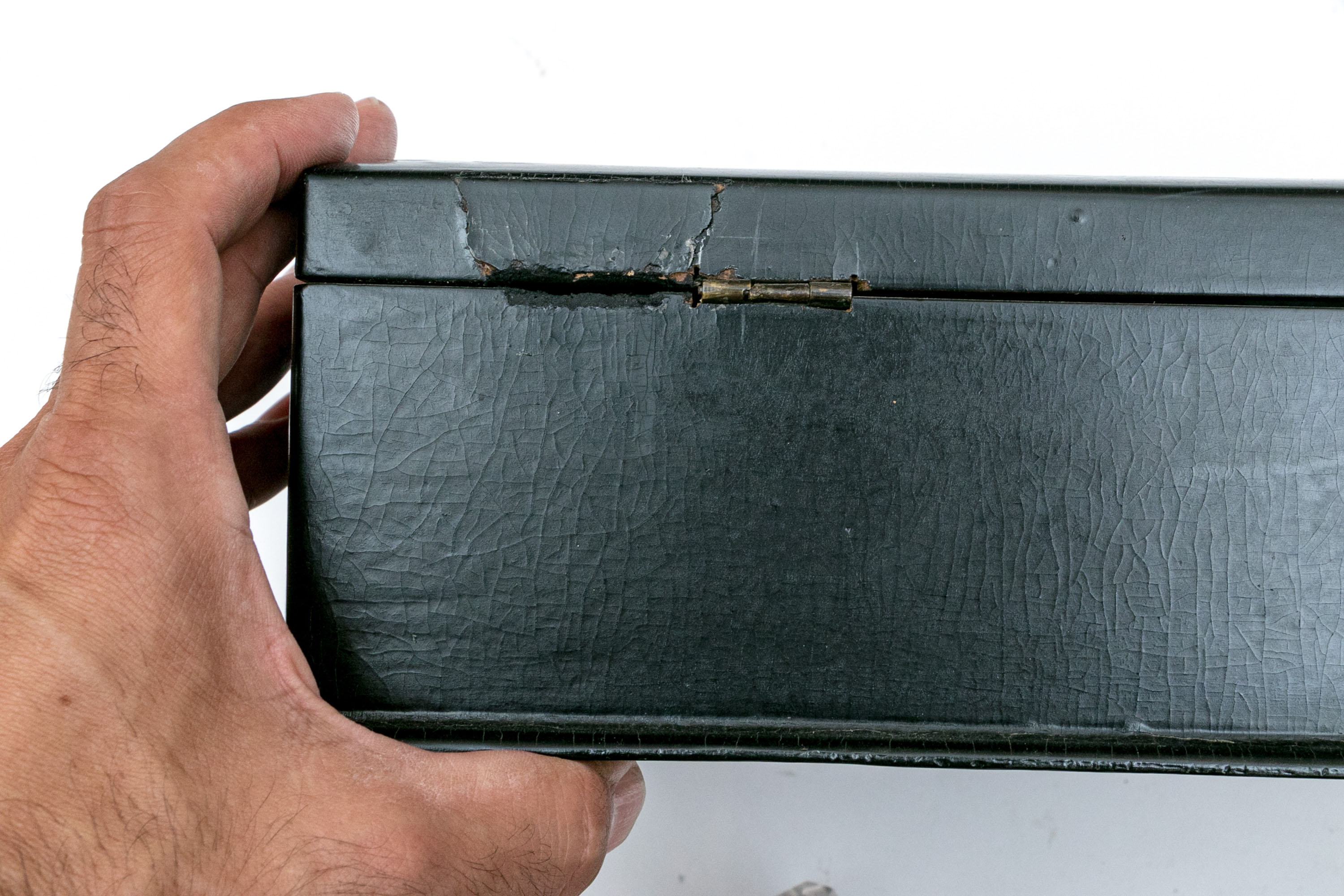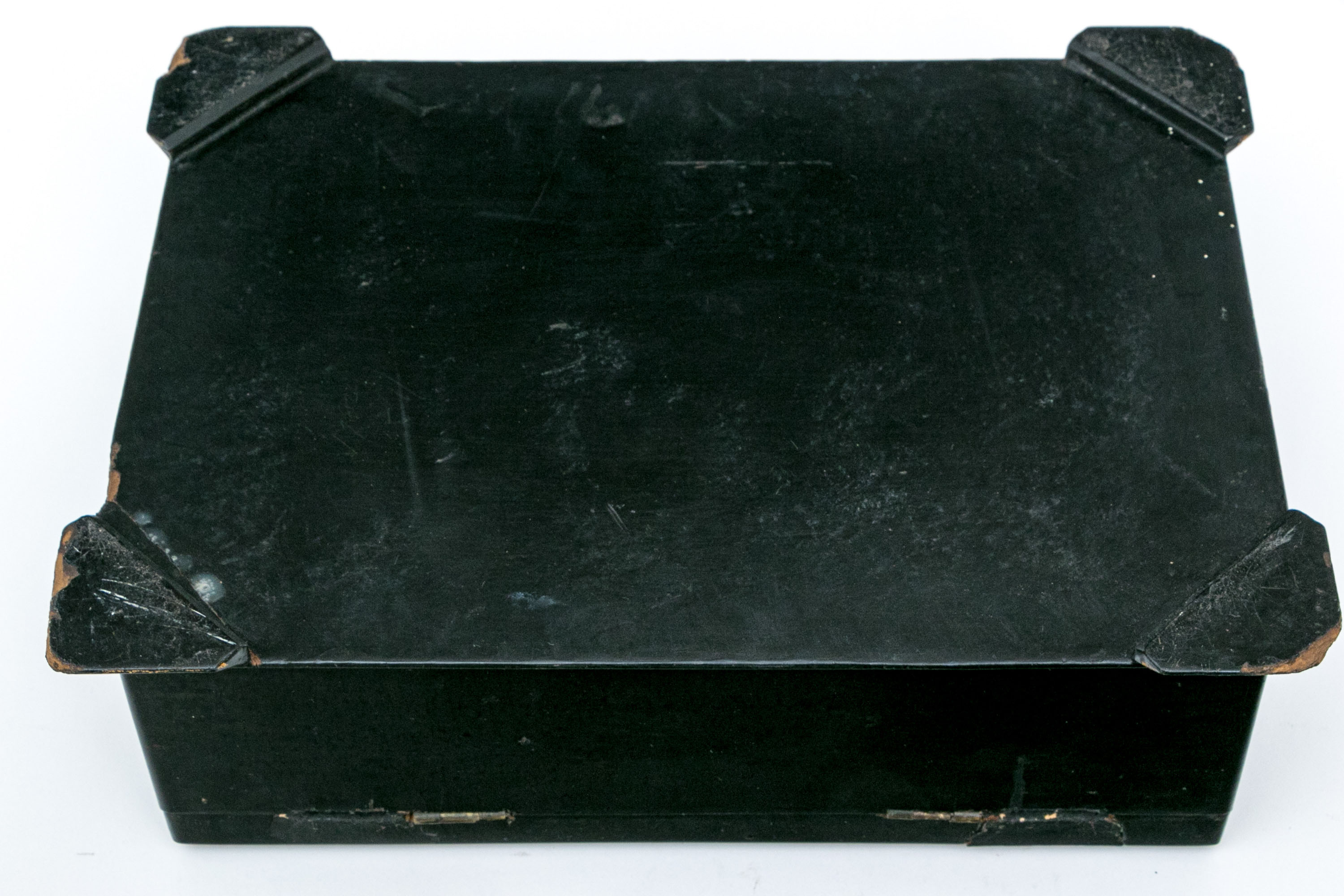 Wear commensurate with age and use. Past repair to the jewelry box hinges. Finish loss to the center lidded compartment of the desk stand. Please review the pictures as they are a part of the condition report.