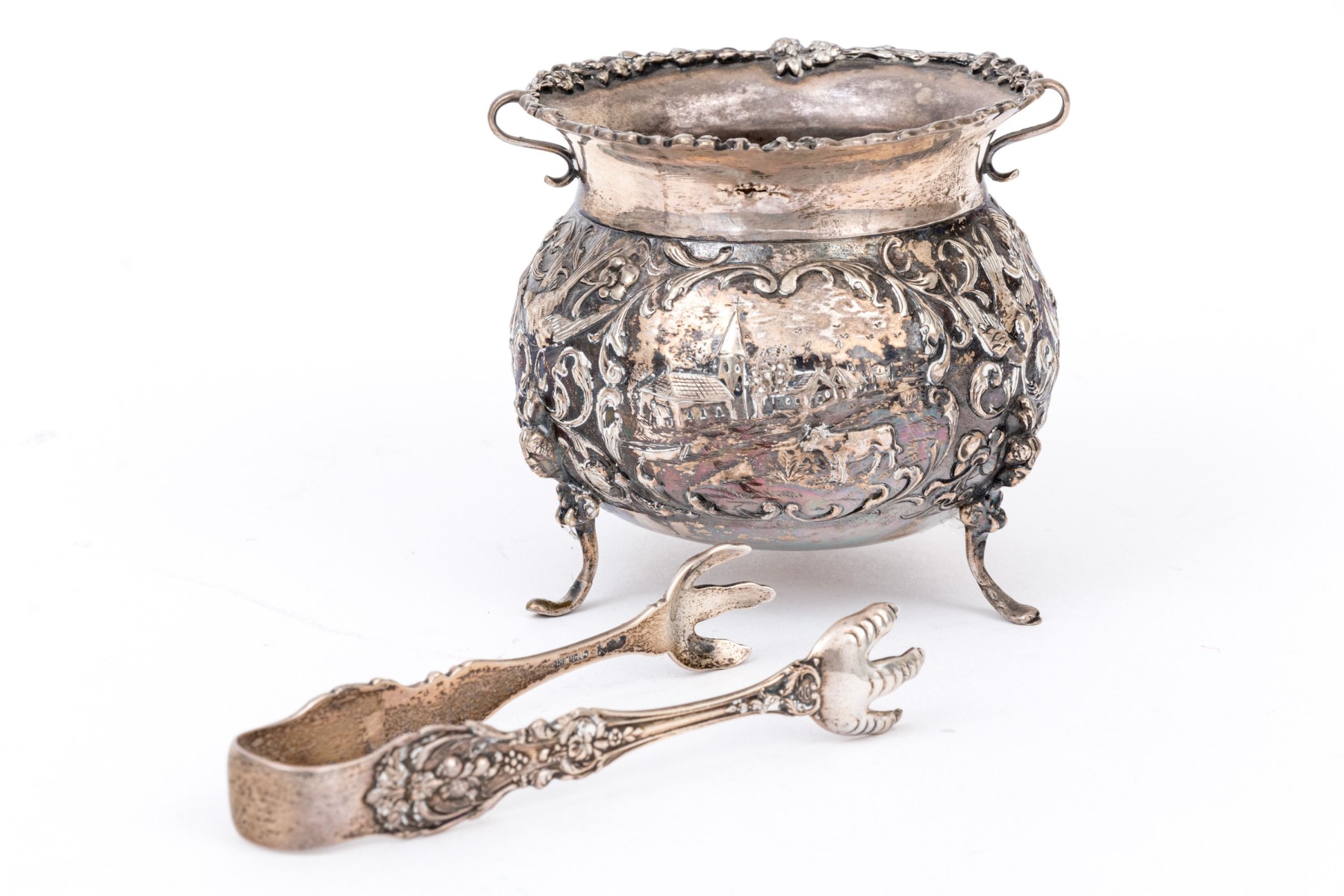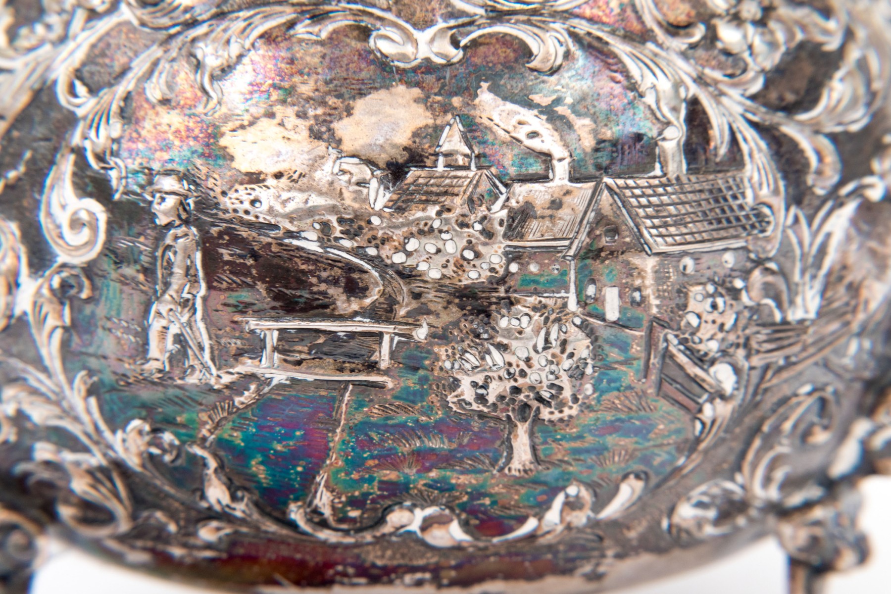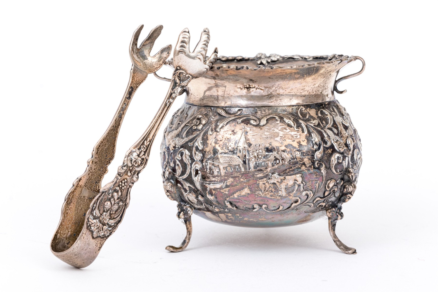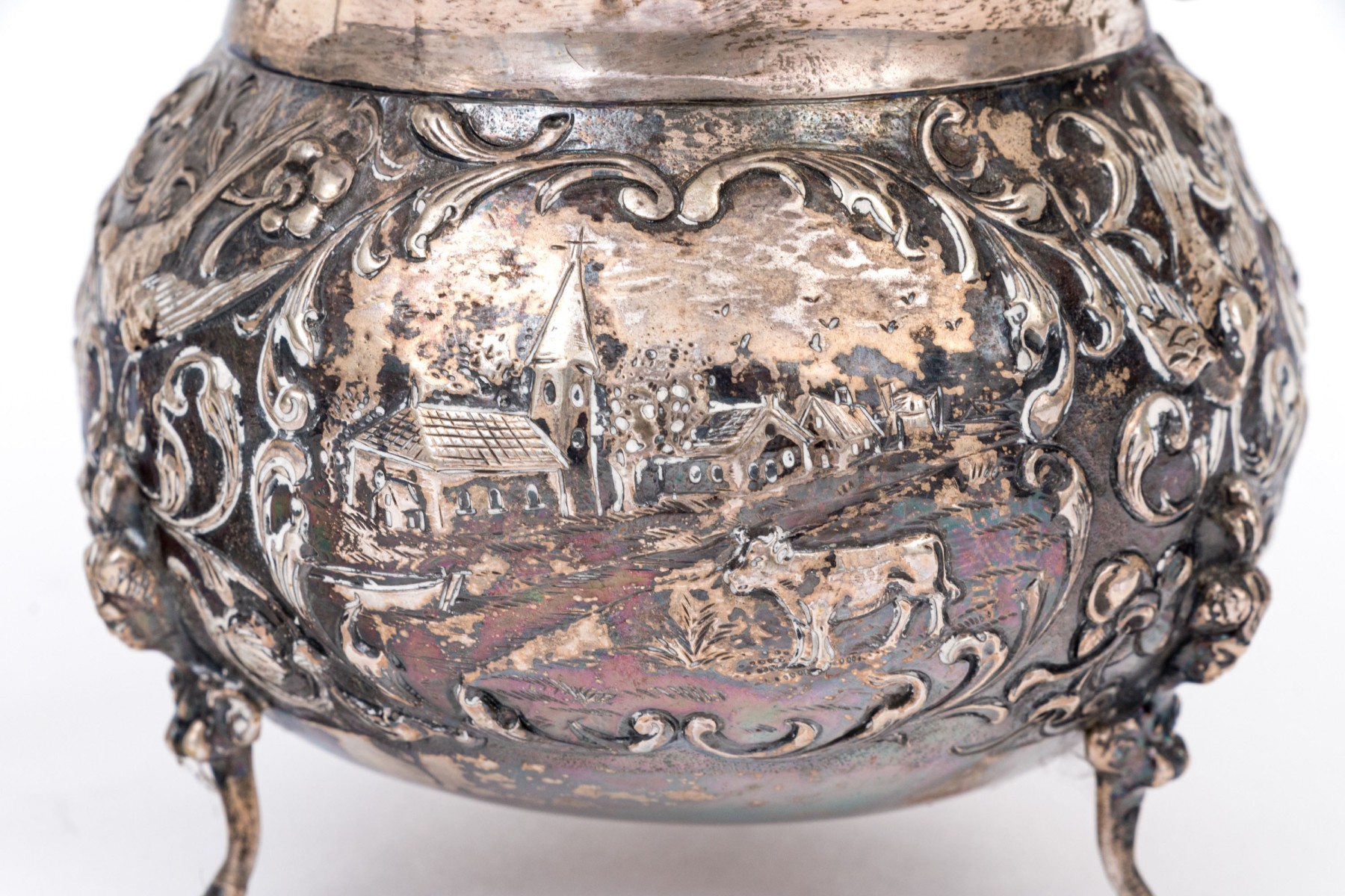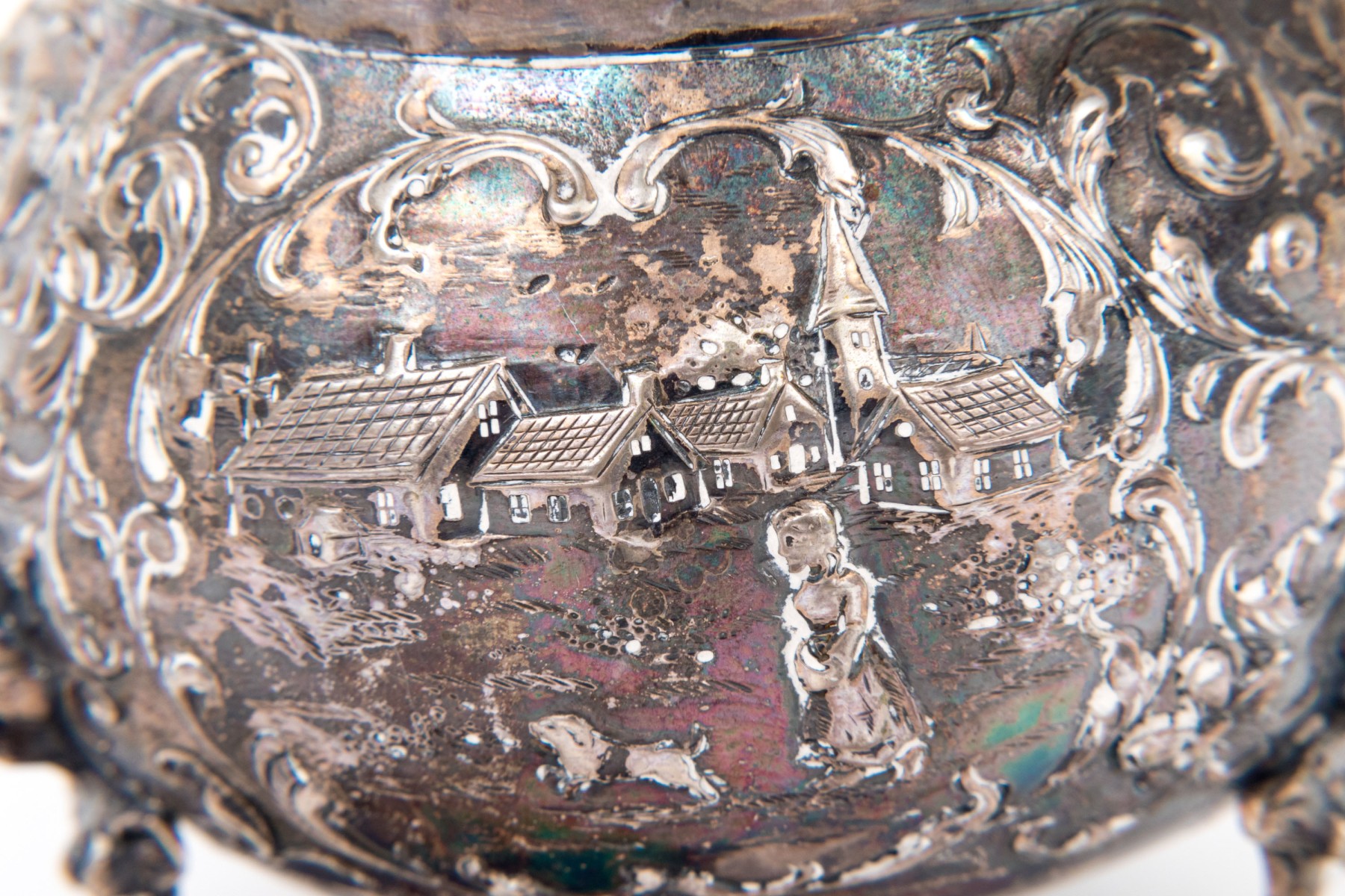 Ca. 1913. The bulbous sugar bowl with repousse scenes of village houses, churches and figures. With a raised floral decorated rim and tiny delicate handles on the neck. Raised on three scrolled feet with female busts.