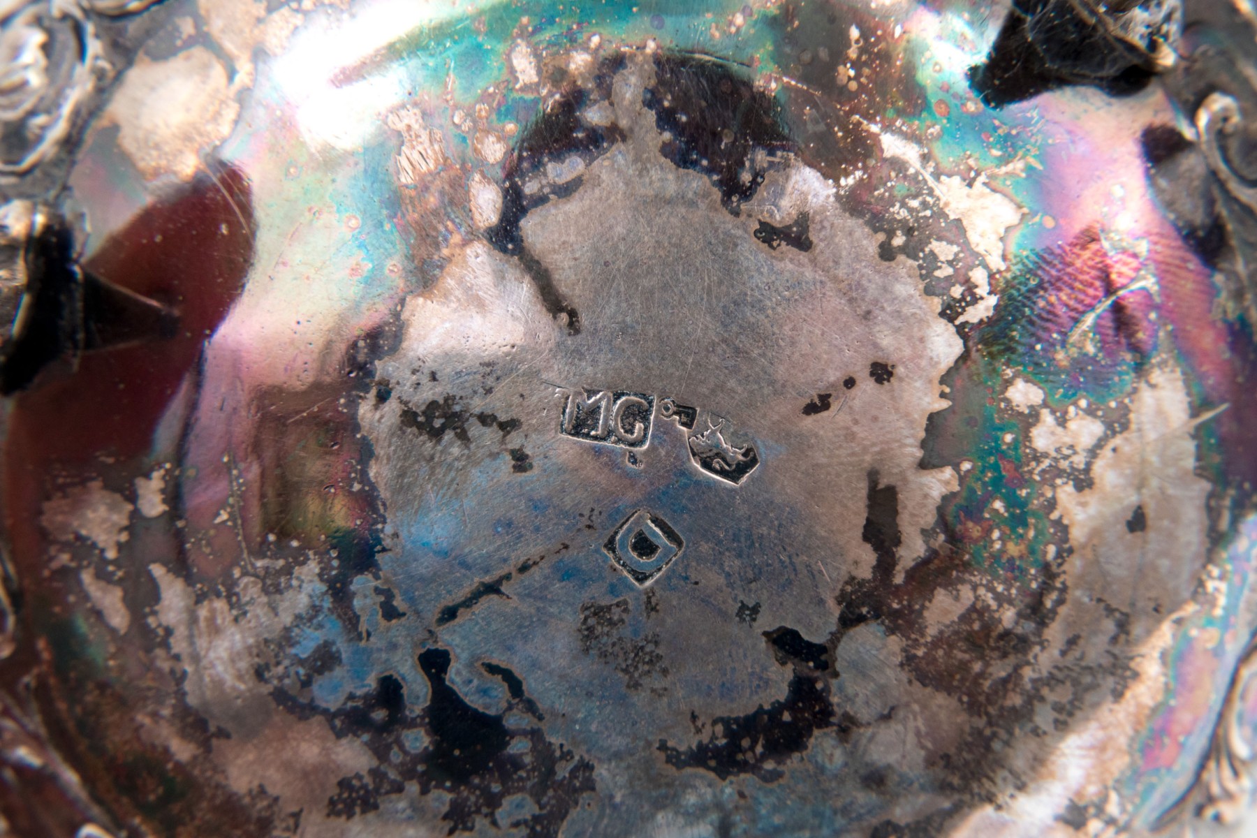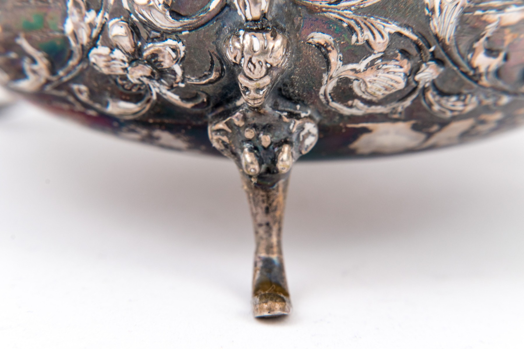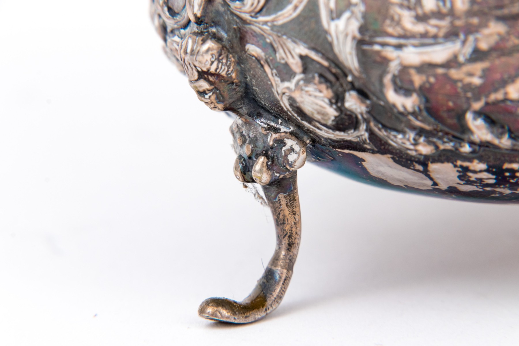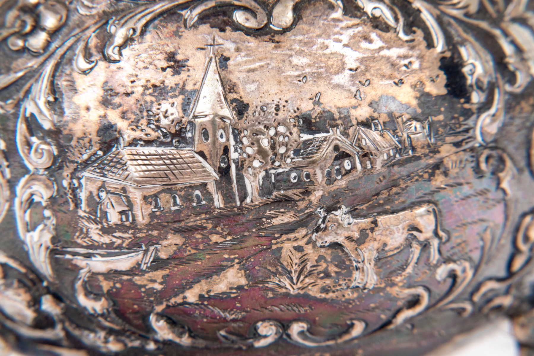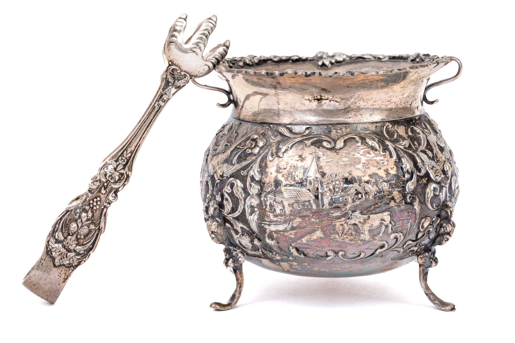 Ca. 1913. The bulbous sugar bowl with repousse scenes of village houses, churches and figures. With a raised floral decorated rim and tiny delicate handles on the neck. Raised on three scrolled feet with female busts.