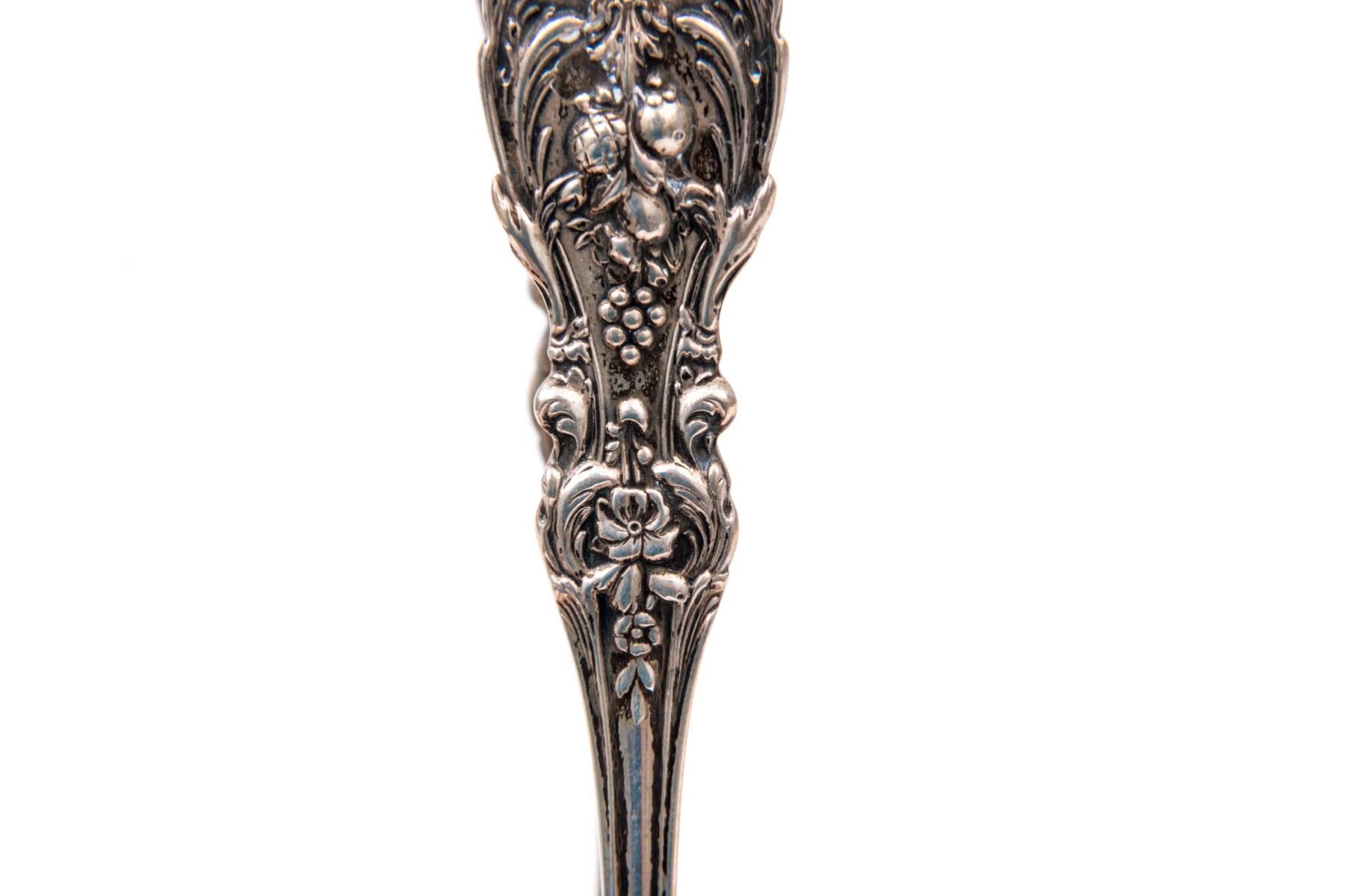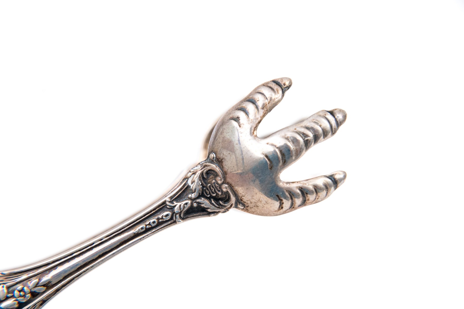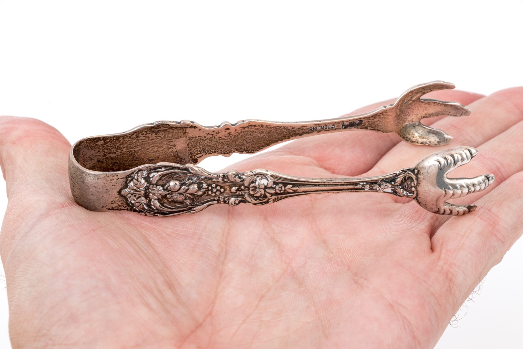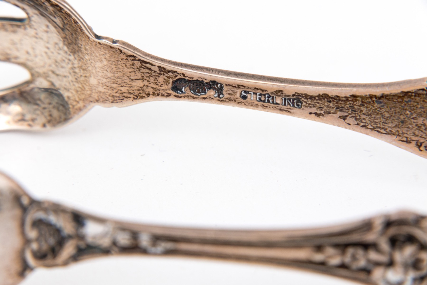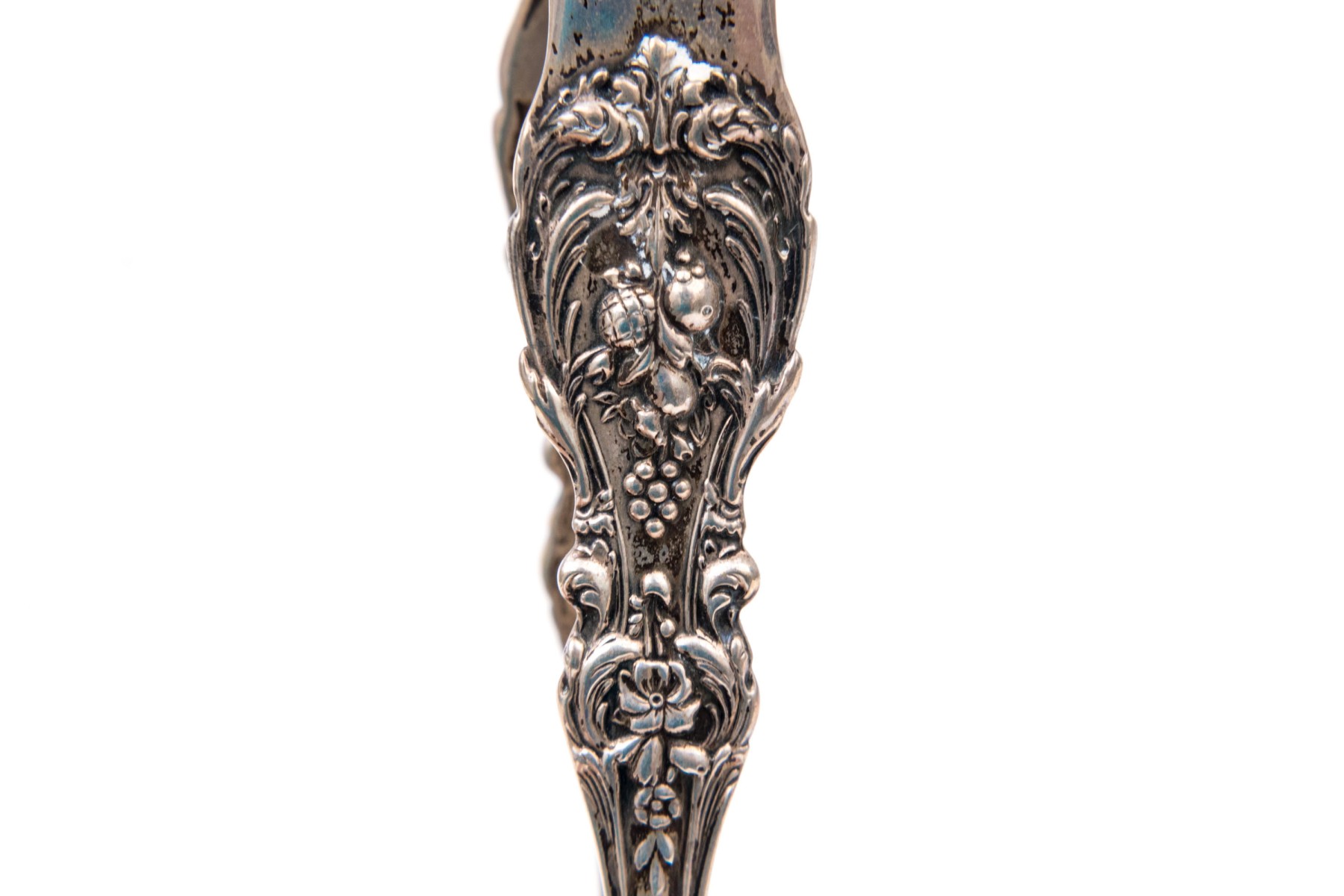 Along with Reed & Barton Francis I sterling silver tongs with bird claw ends and pendant fruit decorated scrolled handles.