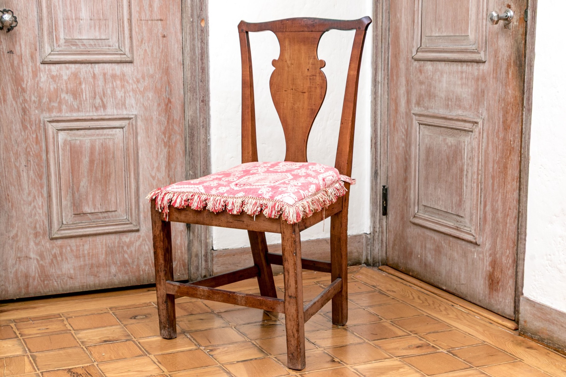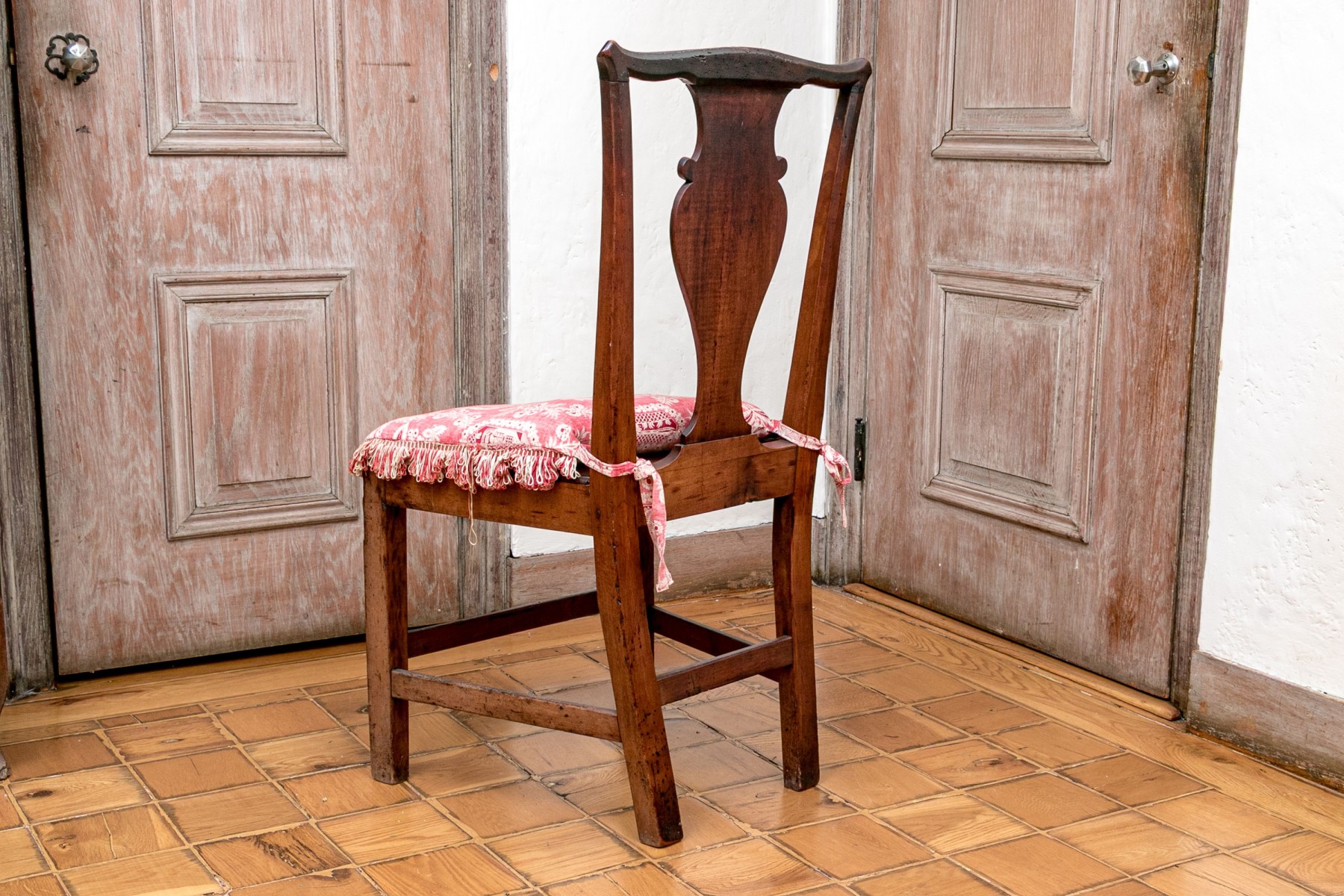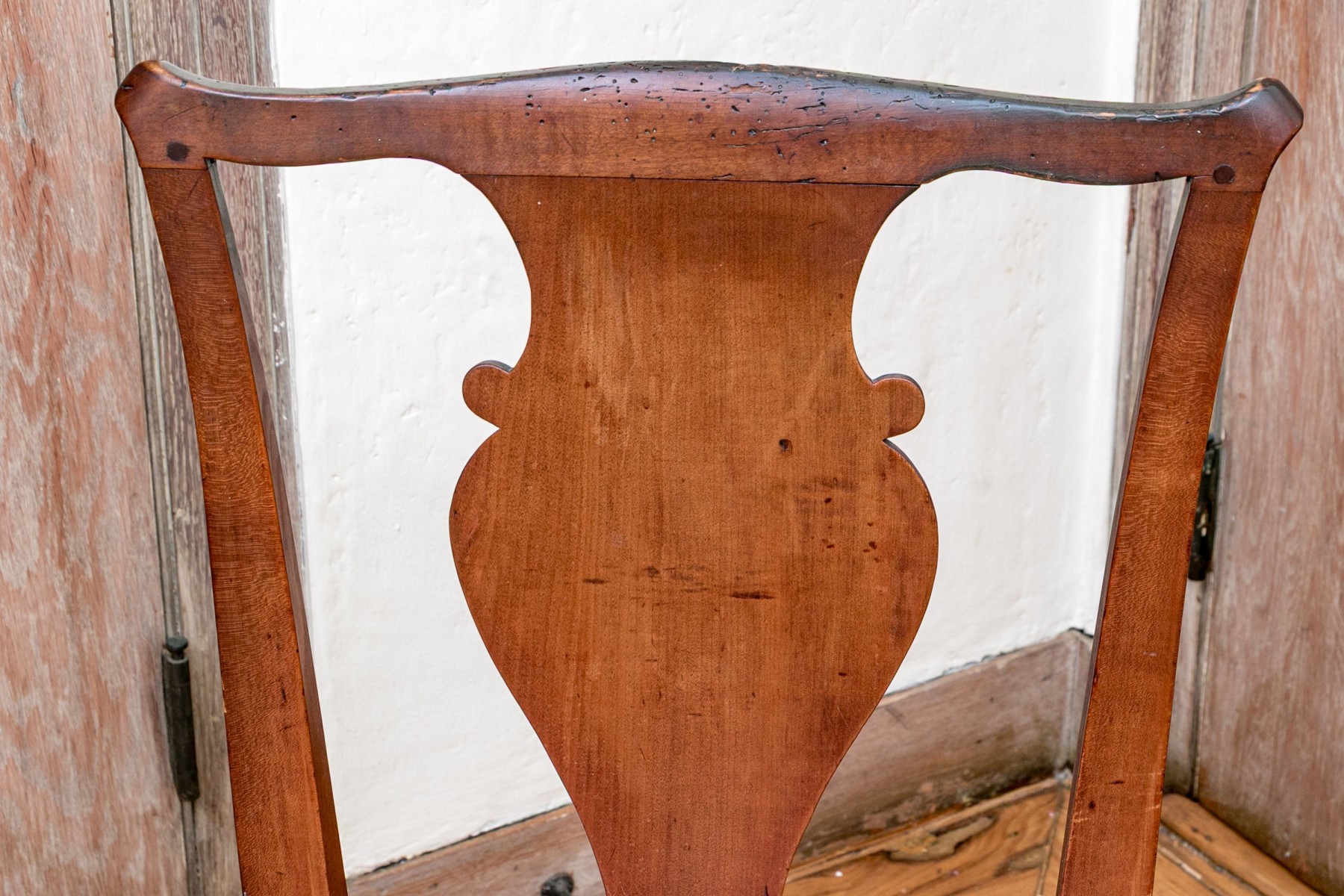A fabulous antique New England side chair circa 1760-80. The chair is detailed with a gently curved top rail with flared ears and a vase form splat in a warm-toned medium brown finish, with posts tapering out to a solid seat topped with a loose seat cushion in red and white with decorate fringed trims. Raised over simple, straight rectangular front legs and subtly inward-bent back legs with a box stretcher.