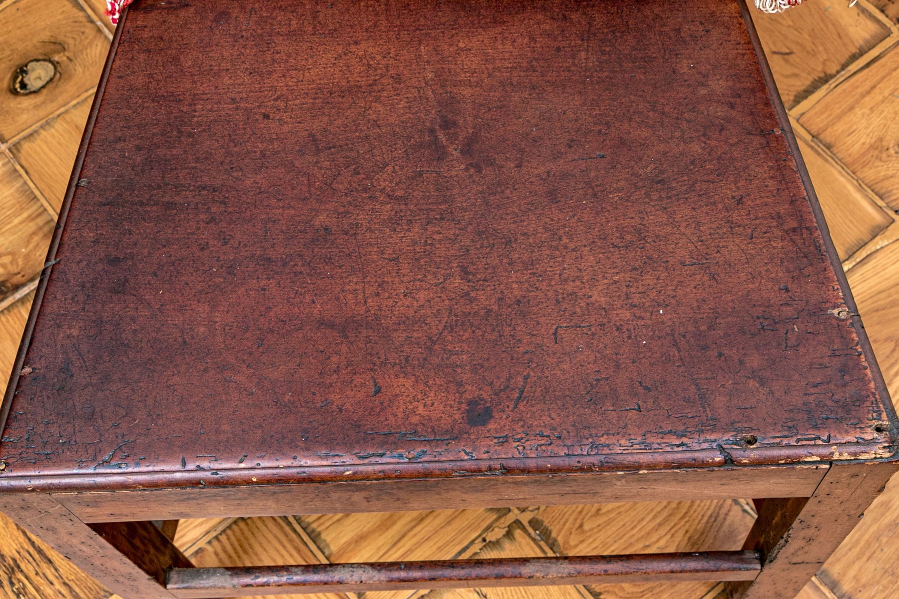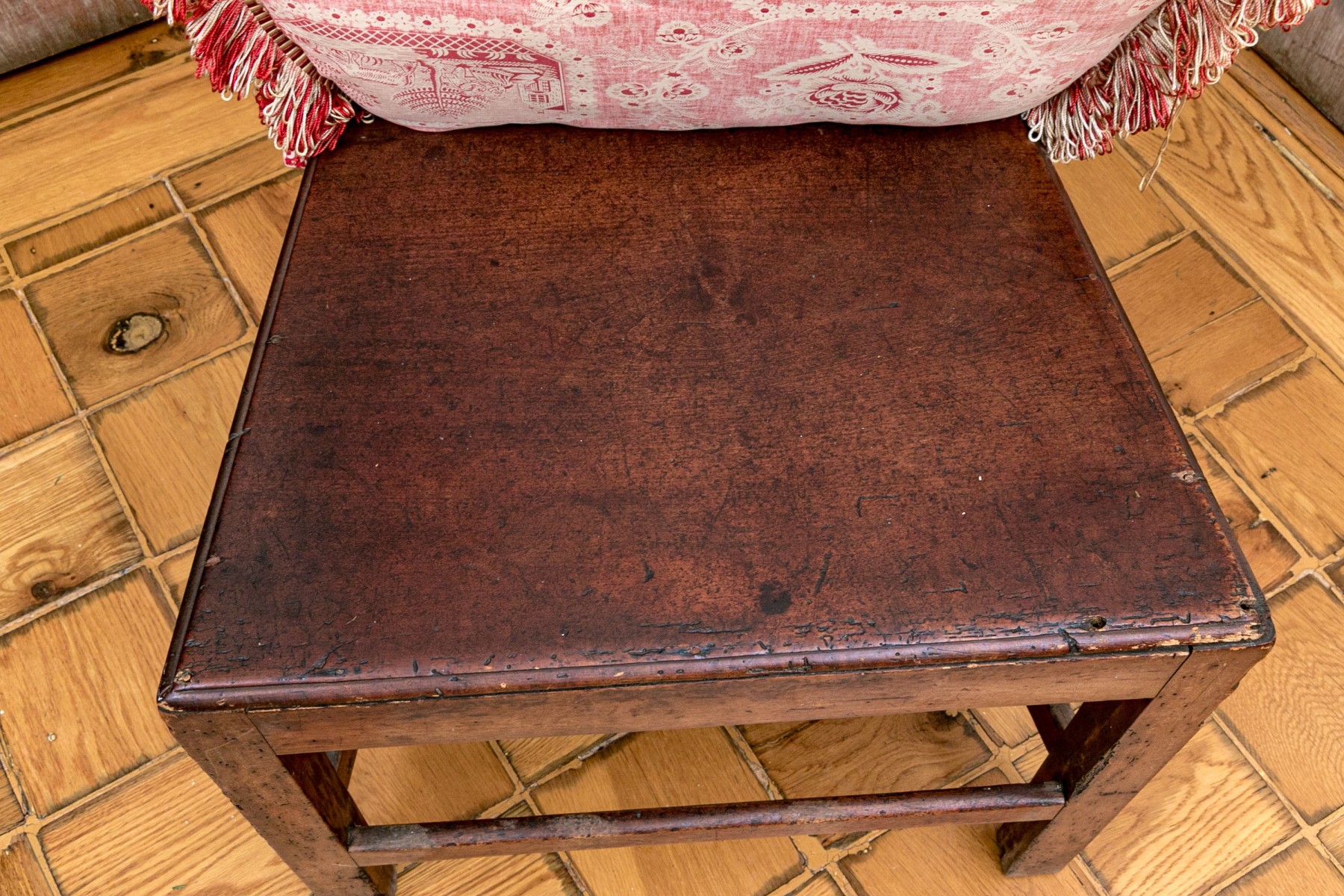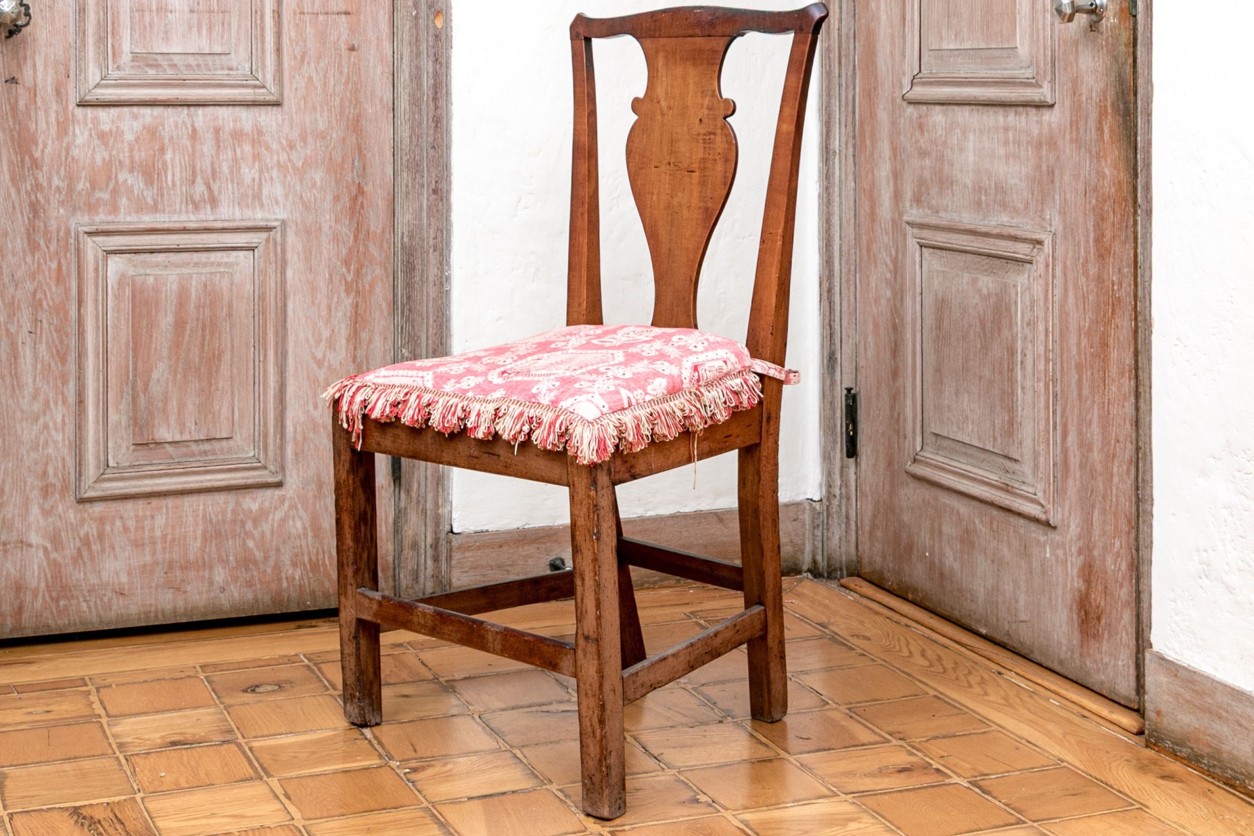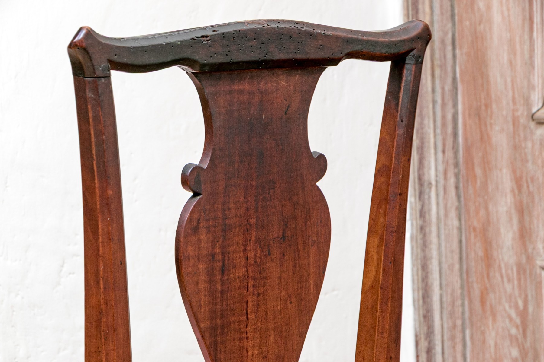 A fabulous antique New England side chair circa 1760-80. The chair is detailed with a gently curved top rail with flared ears and a vase form splat in a warm-toned medium brown finish, with posts tapering out to a solid seat topped with a loose seat cushion in red and white with decorate fringed trims. Raised over simple, straight rectangular front legs and subtly inward-bent back legs with a box stretcher.