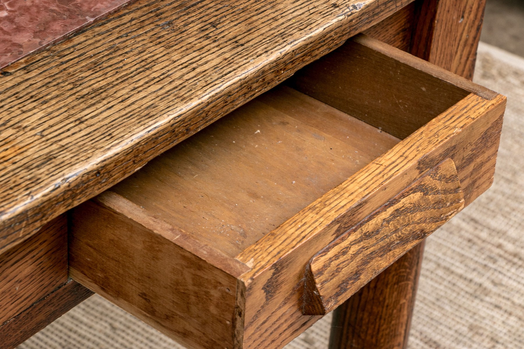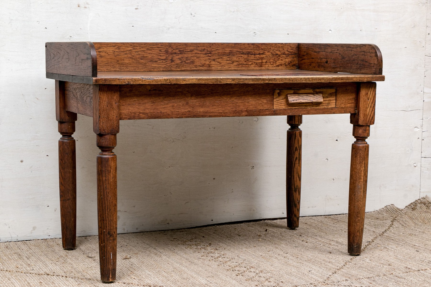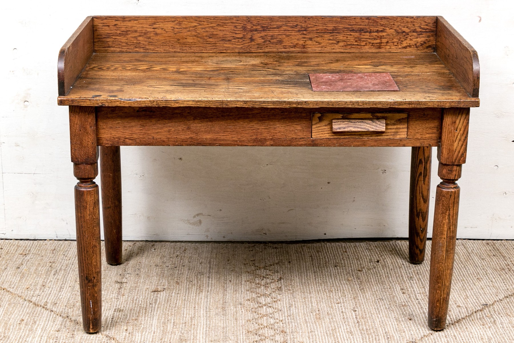 A desk with a tall 3/4 gallery and an inset red marble plaque on the top at the right. The frieze with a small drawer on the right. Raised on heavy cylindrical legs with turned tops.