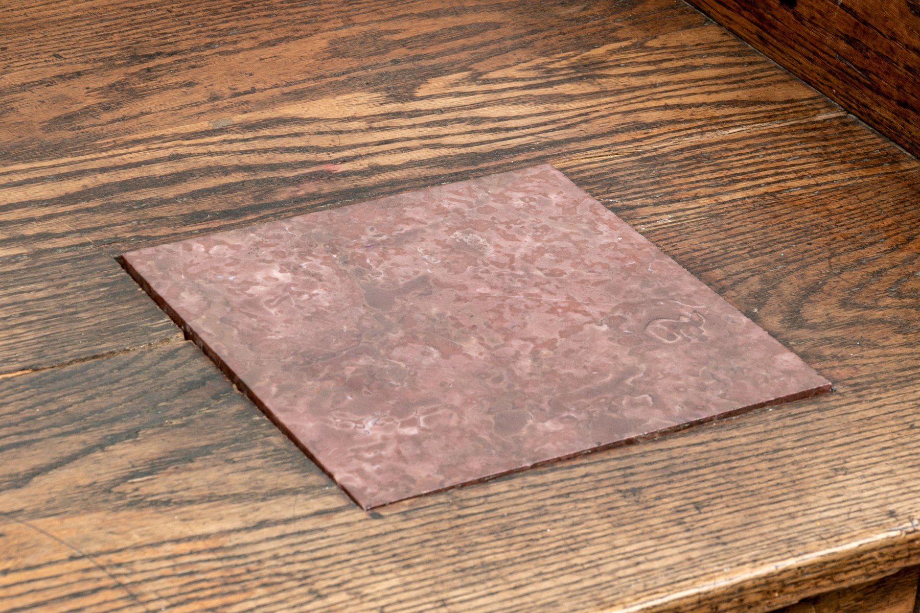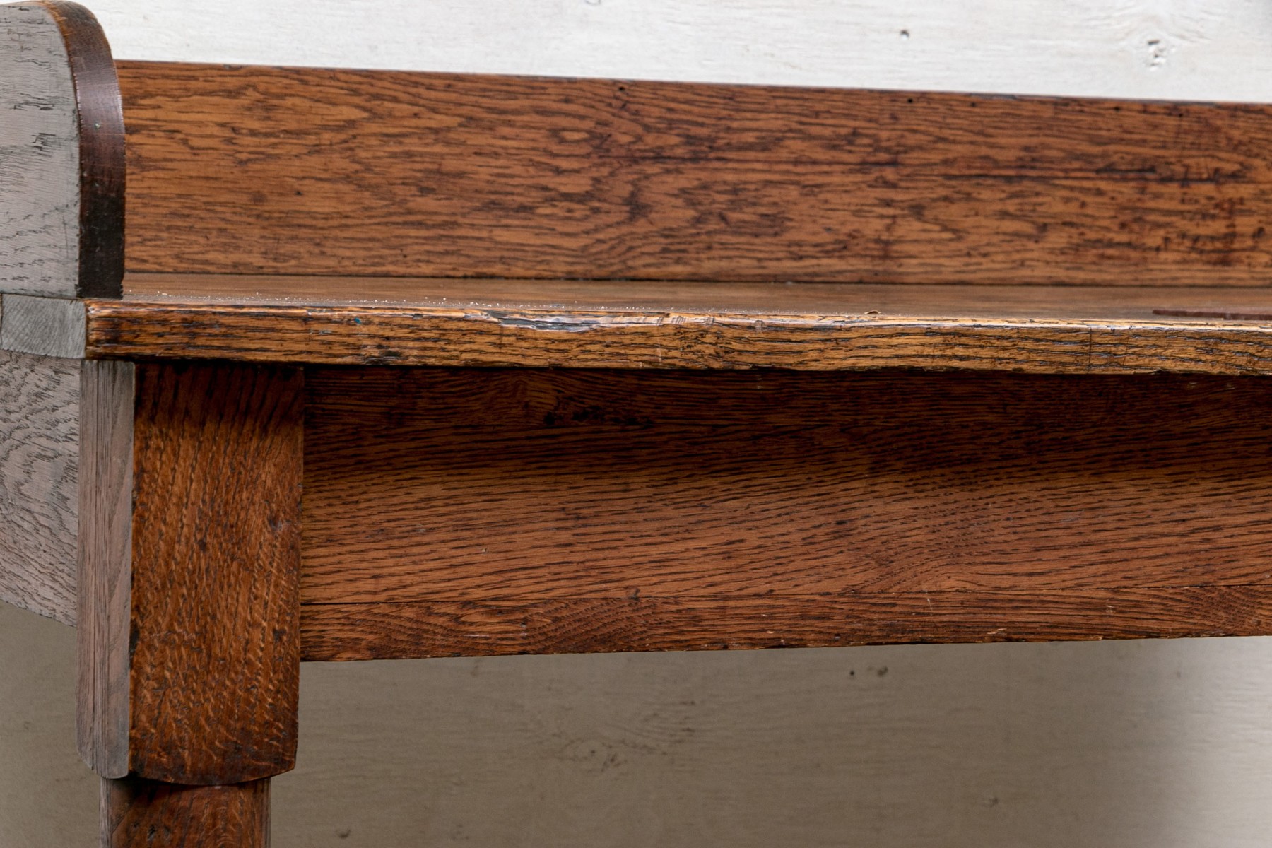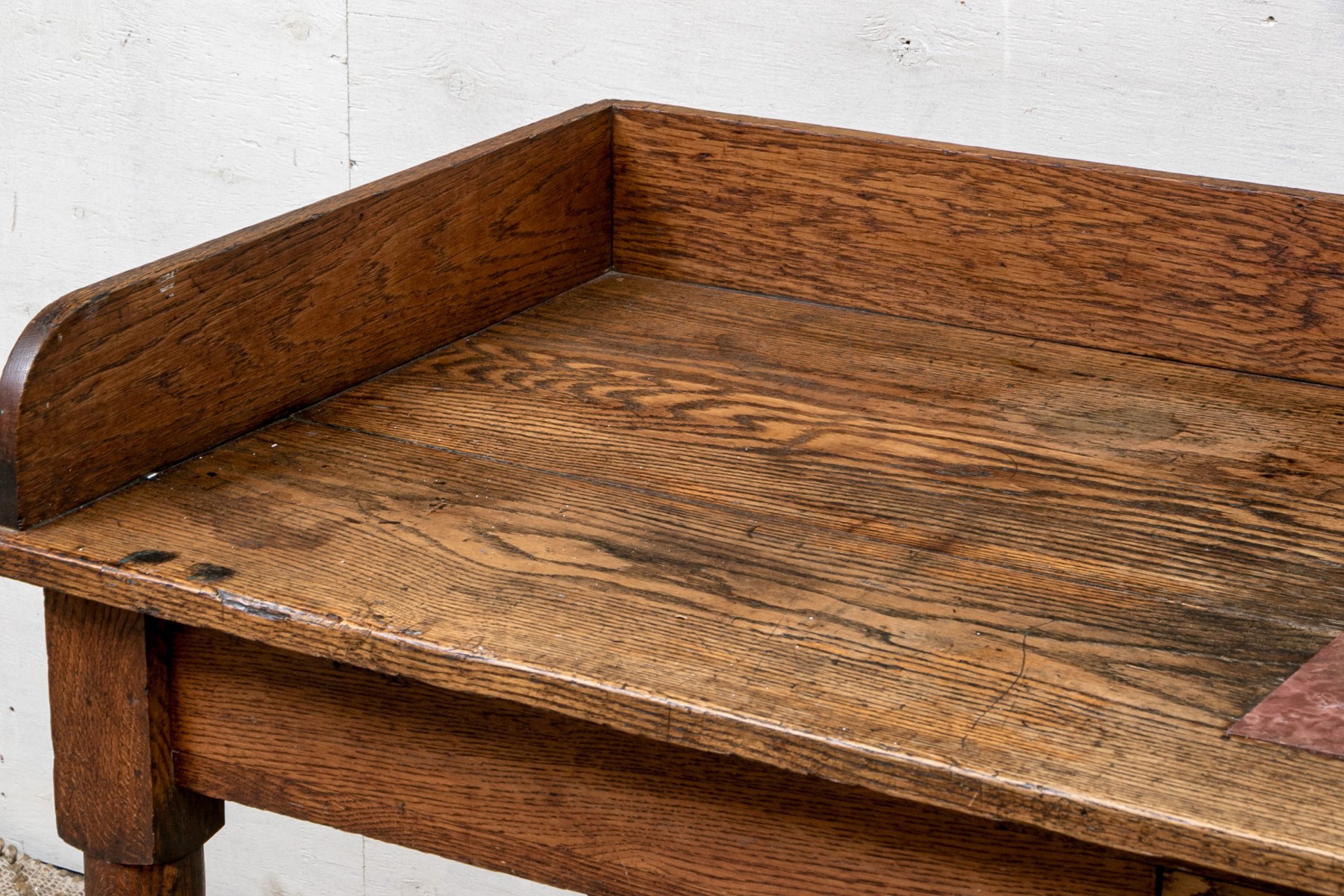 A desk with a tall 3/4 gallery and an inset red marble plaque on the top at the right. The frieze with a small drawer on the right. Raised on heavy cylindrical legs with turned tops.