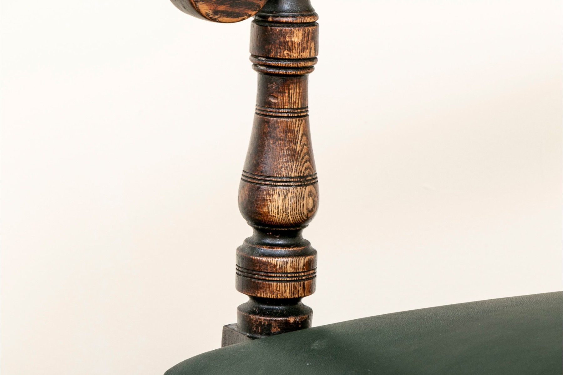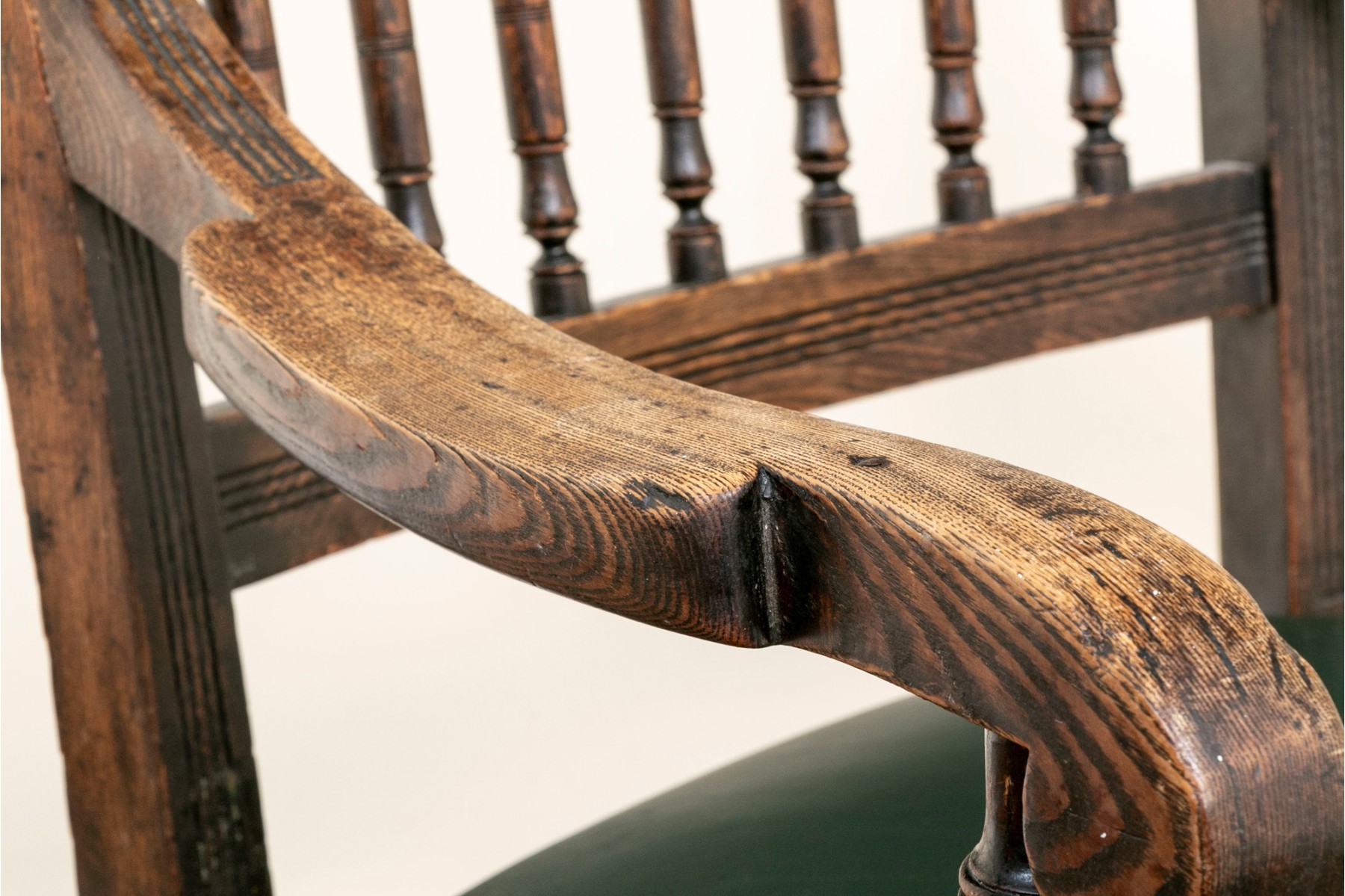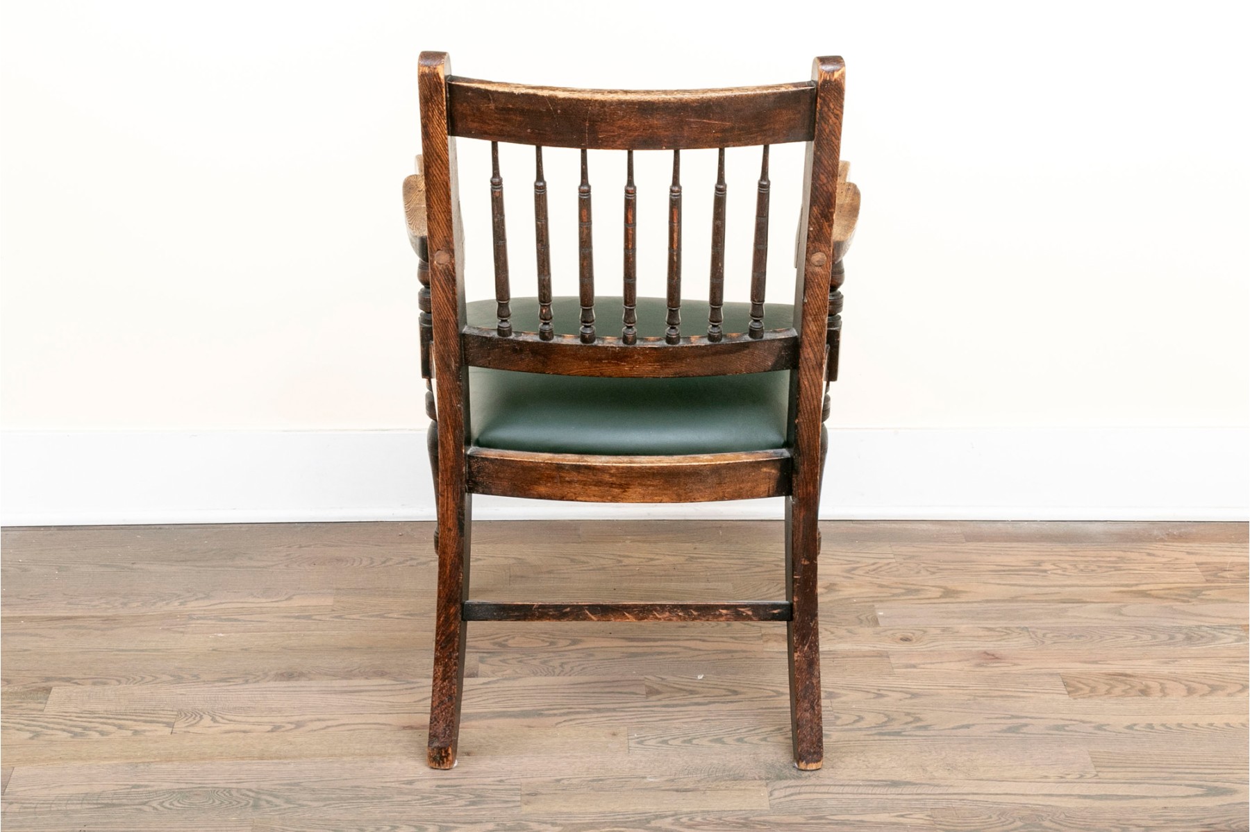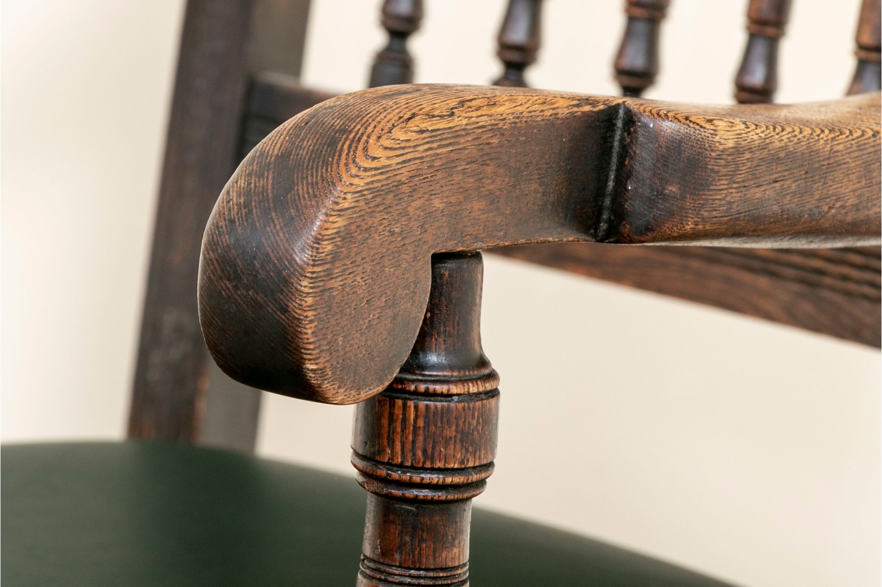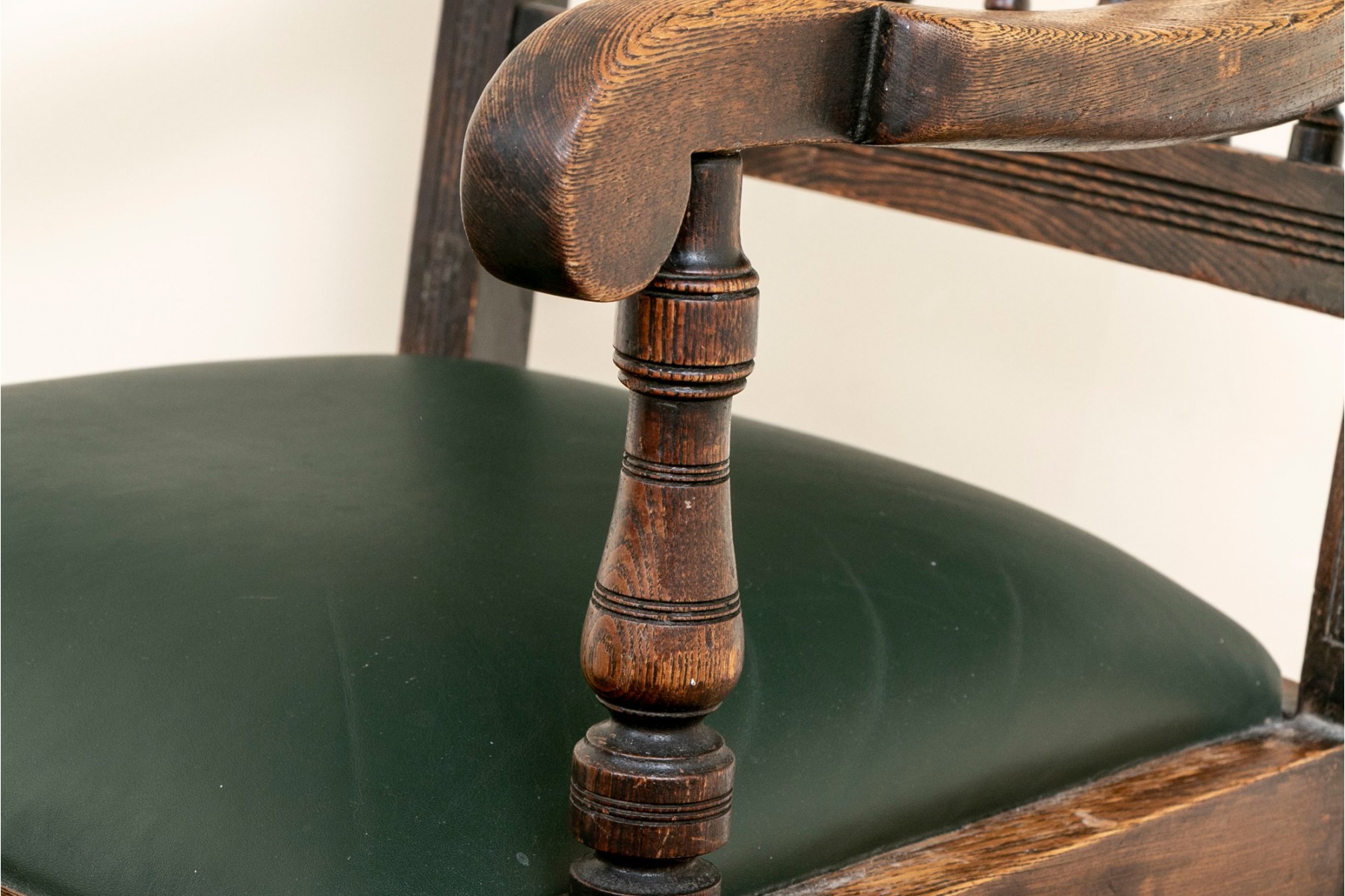 A vintage oak spindle-back chair featuring tasteful leather upholstery and well crafted oak frame.