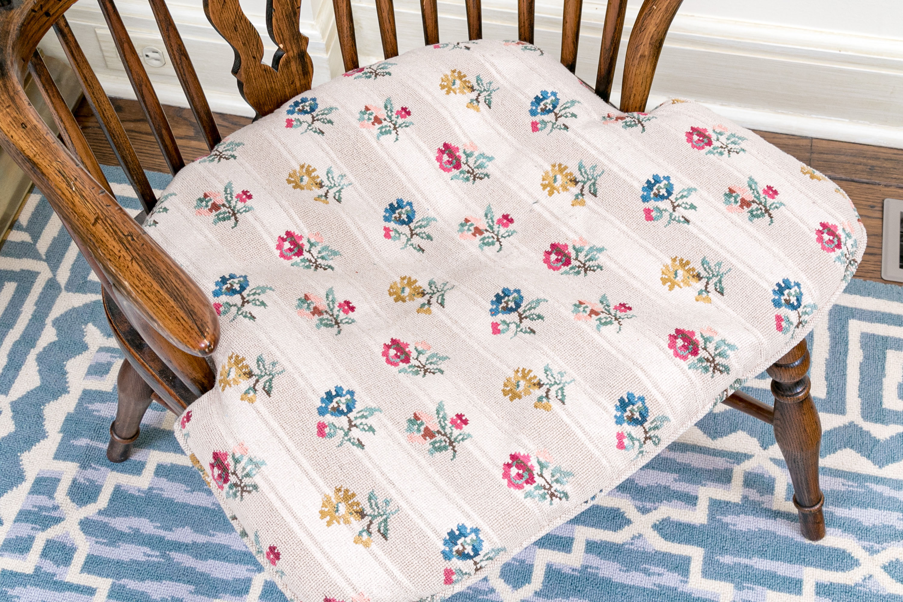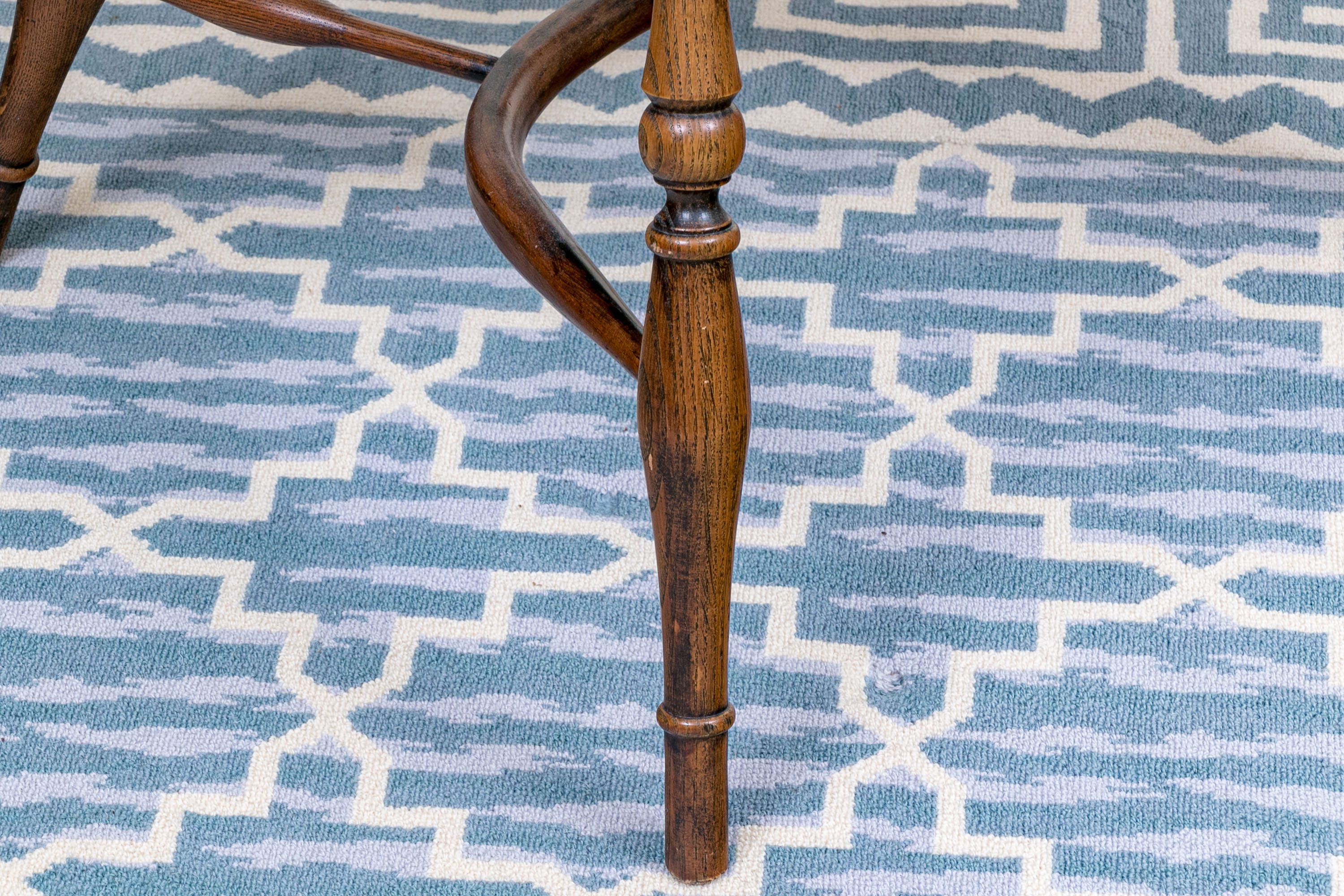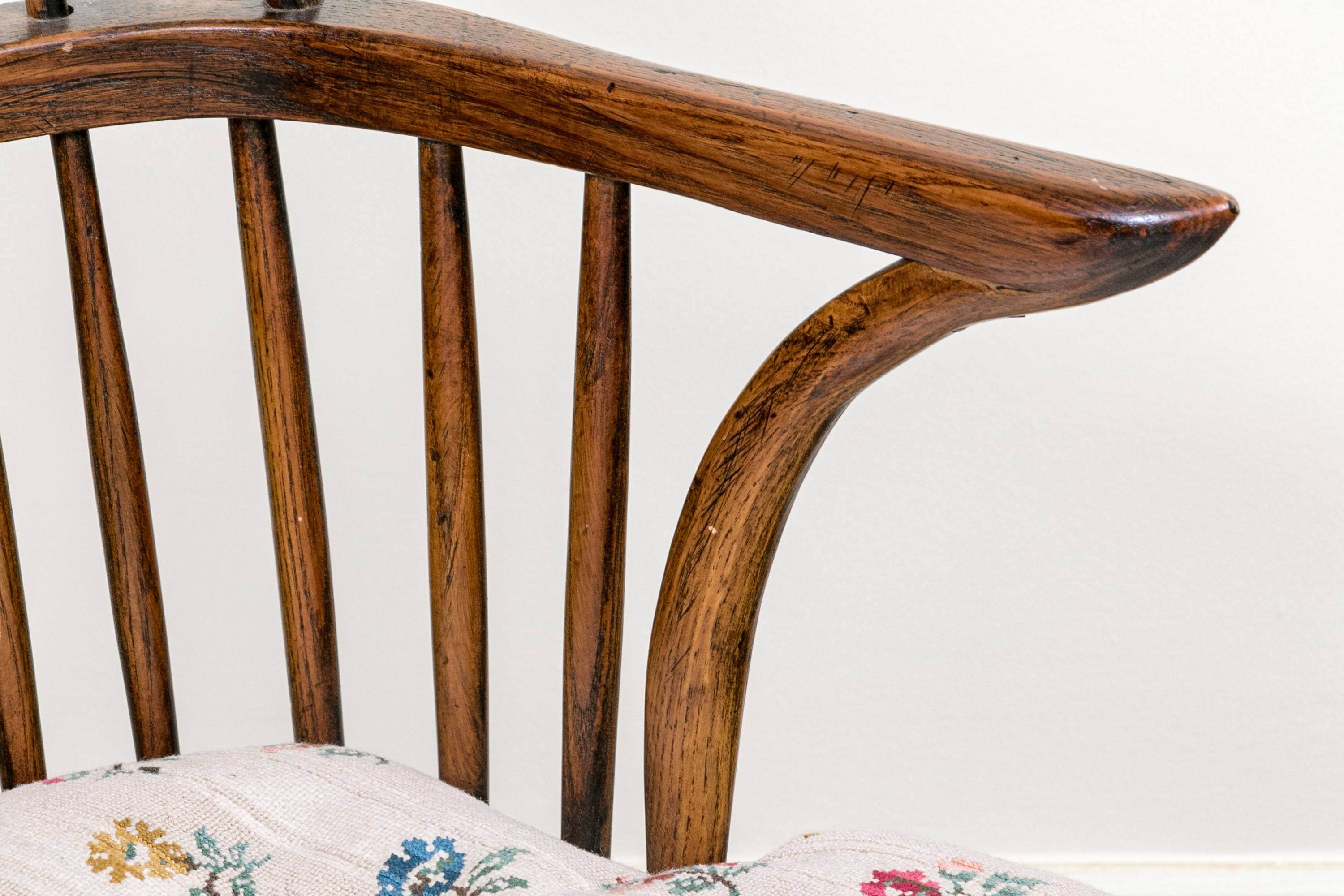On well carved legs with arched support and spindle back with arms wrapped around and sindles above to the arched top rail. Carved central back splat with loose needlepoint upholstered seat pad.