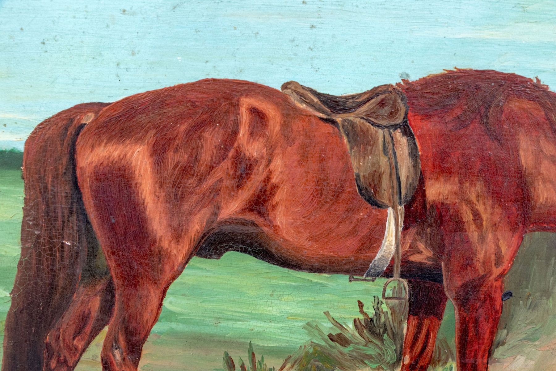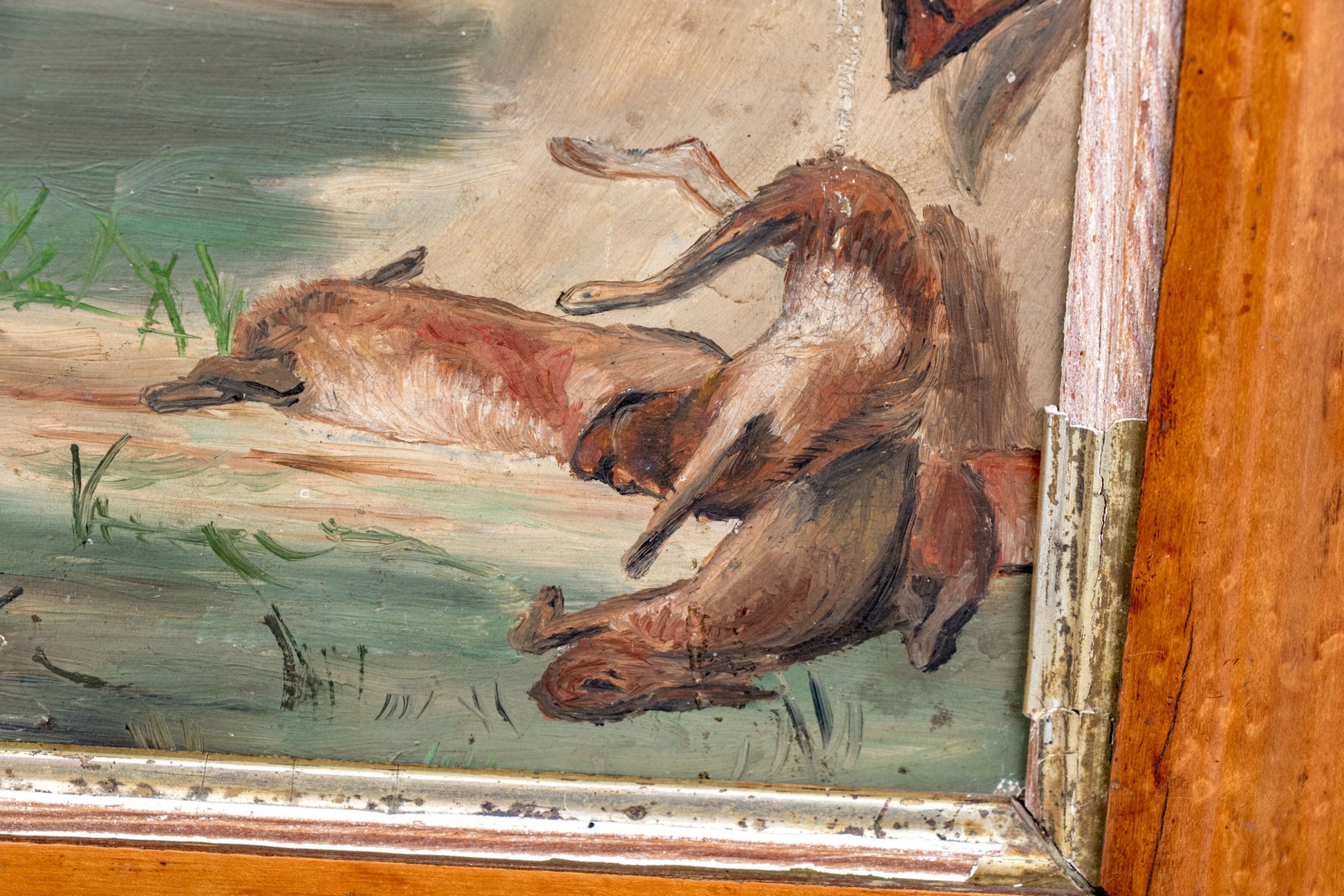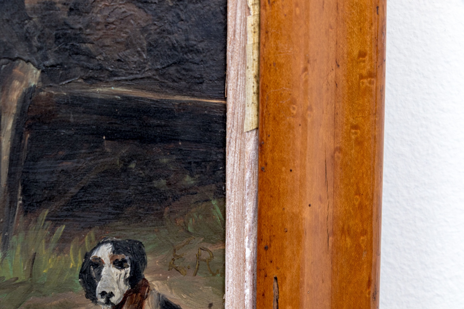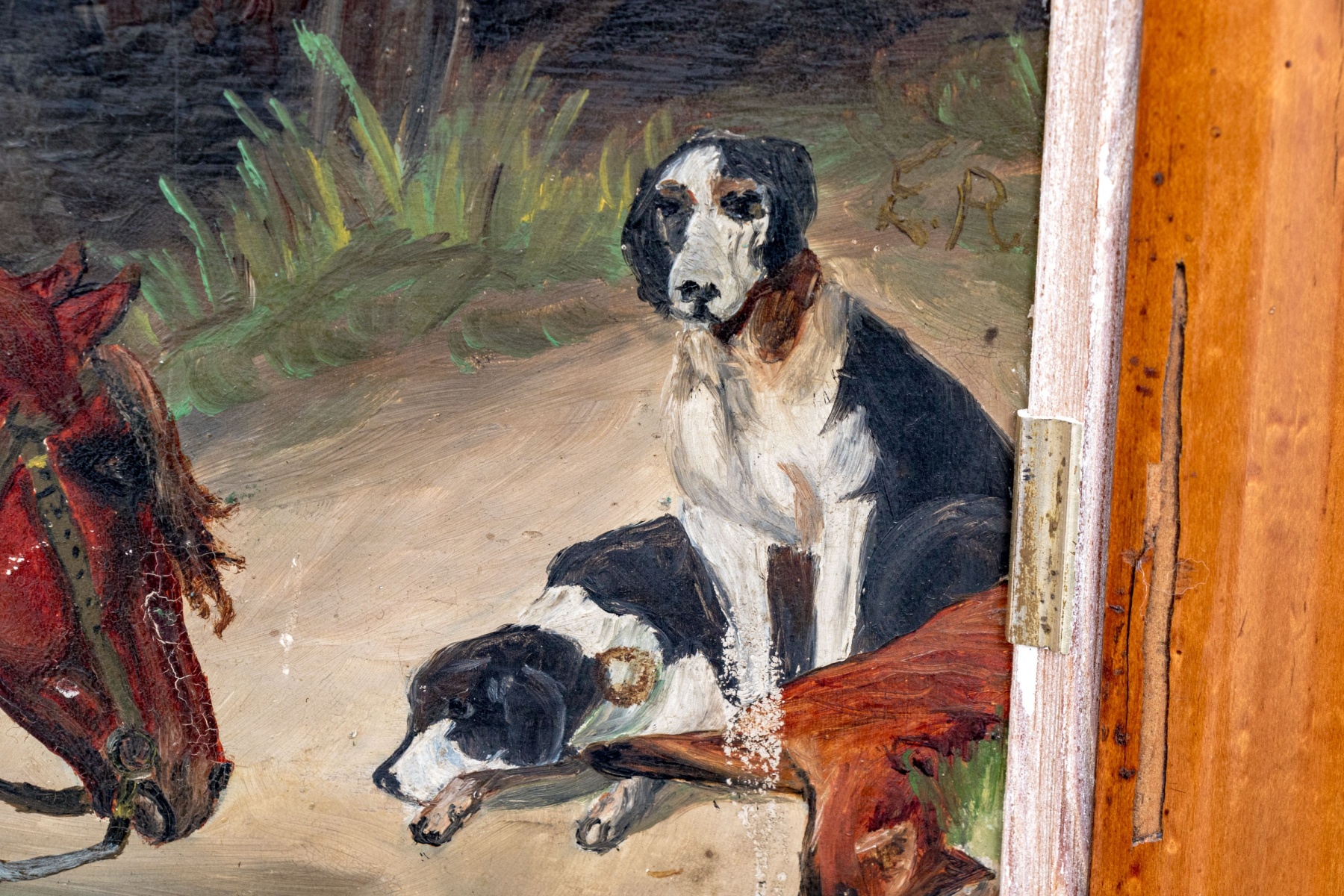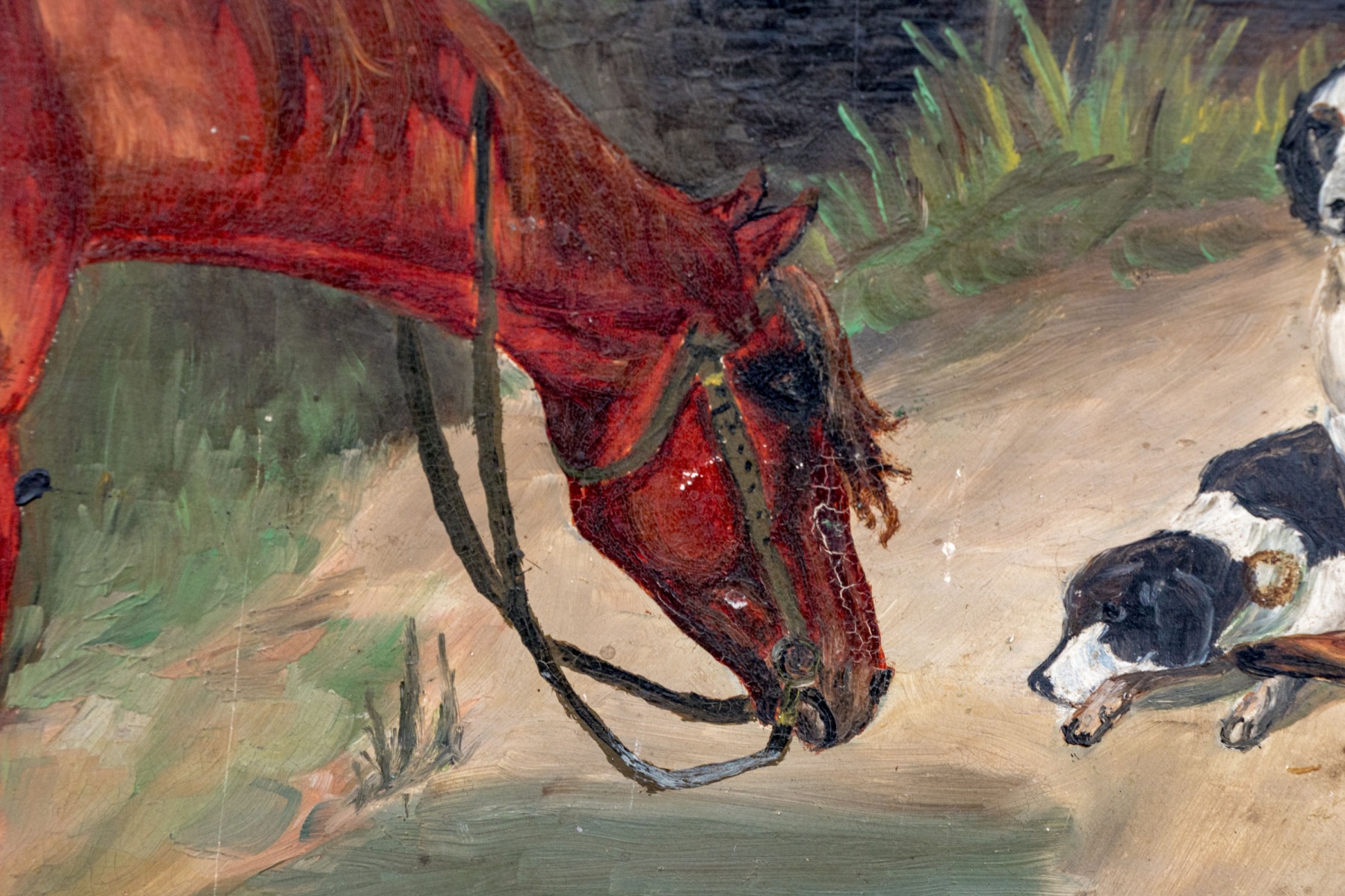 A charming antique oil painting on board depicting a beautifully detailed horse curiously approaching a group of dogs relaxing along a sloping dirt path with a hunted fox, a fence and foliage drawing the eye towards a vast green field in the background beneath a blue sky. Appears to be unsigned.