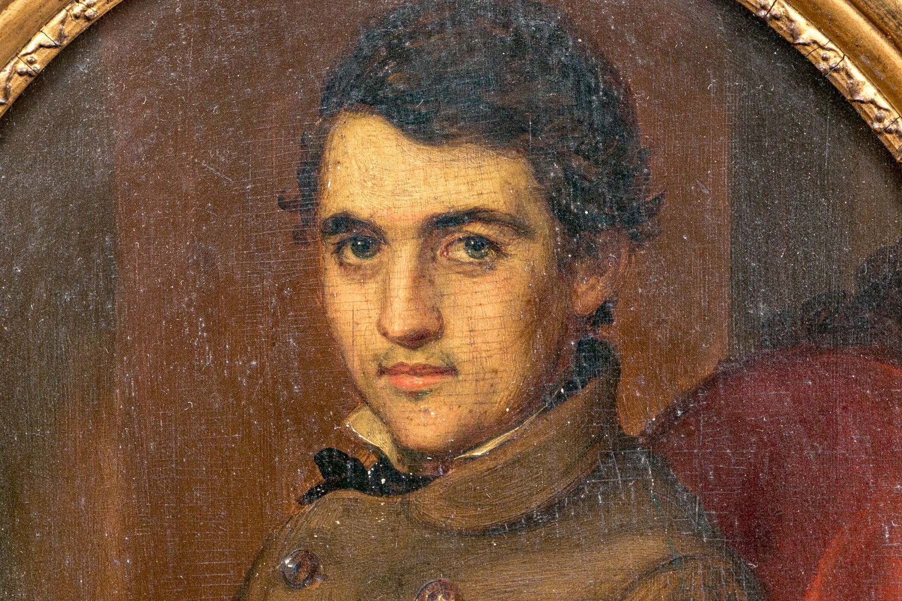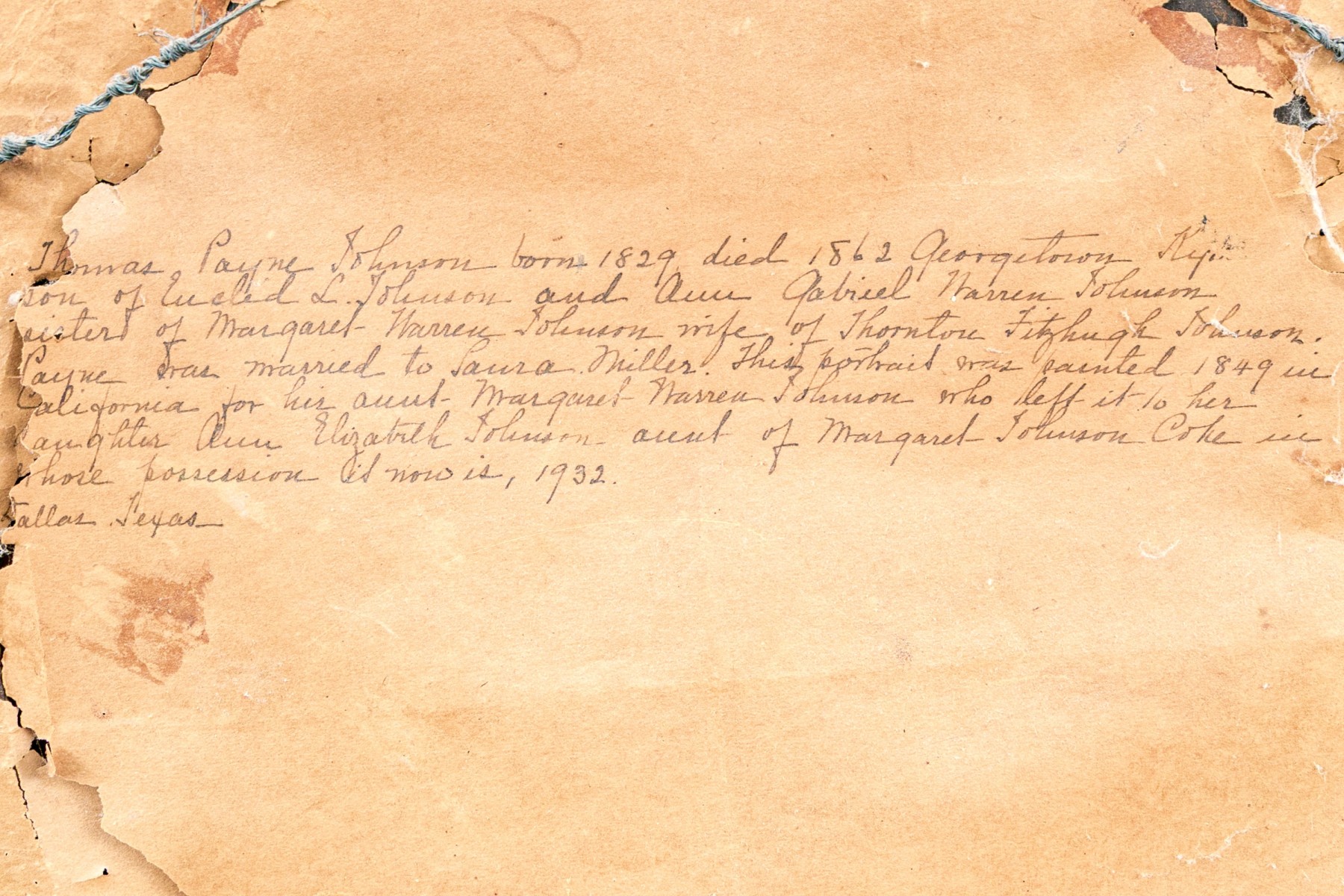 "Thomas Payne Johnson born 1829 died 1862 Georgetown KY. Son of Euclid L. Johnson and Anne Gabriel Narreu Johnson, sister of Margaret Warren Johnson, wife of Thornton Fitzhugh Johnson. Payne was married to Laura Miller. This portrait was painted 1849 in California for his aunt Margaret Warren who left it to her daughter Ann Elizabeth Johnson aunt of Margaret Johnson Cole in whose possession it now is, 1932. Dallas Texas."