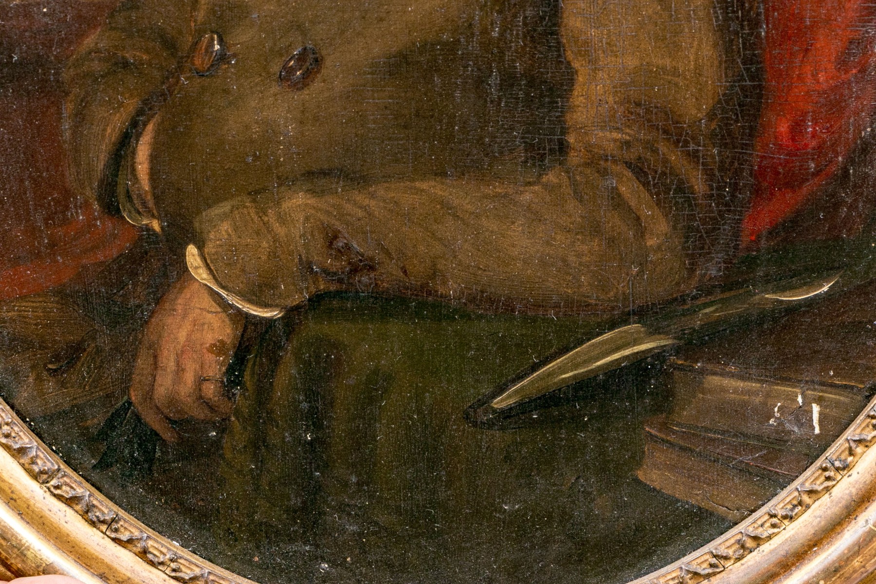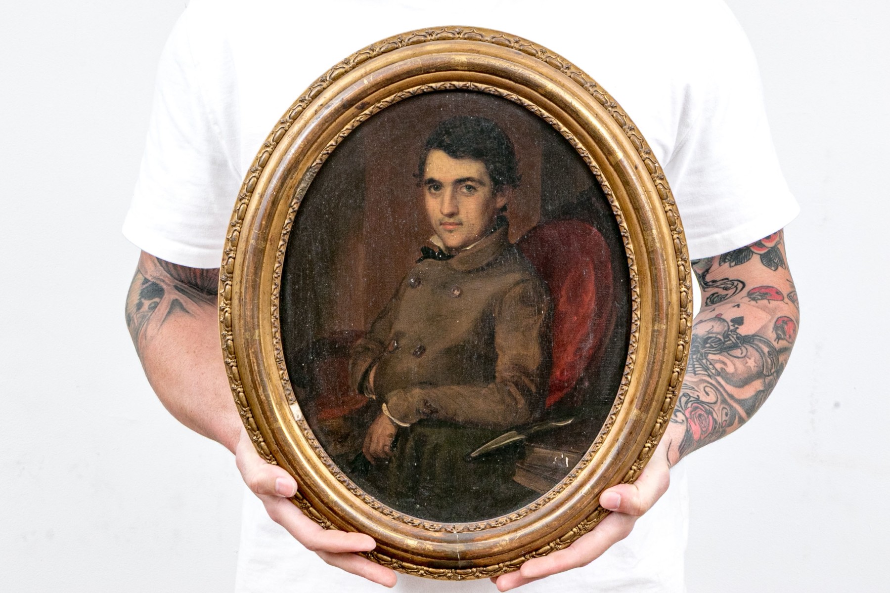 An antique oil painting on board circa 1849 depicting the gentleman Thomas Payne Johnson (American, 1829-1862) at twenty years old, seen with short, dark hair wearing a dark brown double-breasted coat while seated in a red upholstered chair with one hand resting on the inside of his jacket.