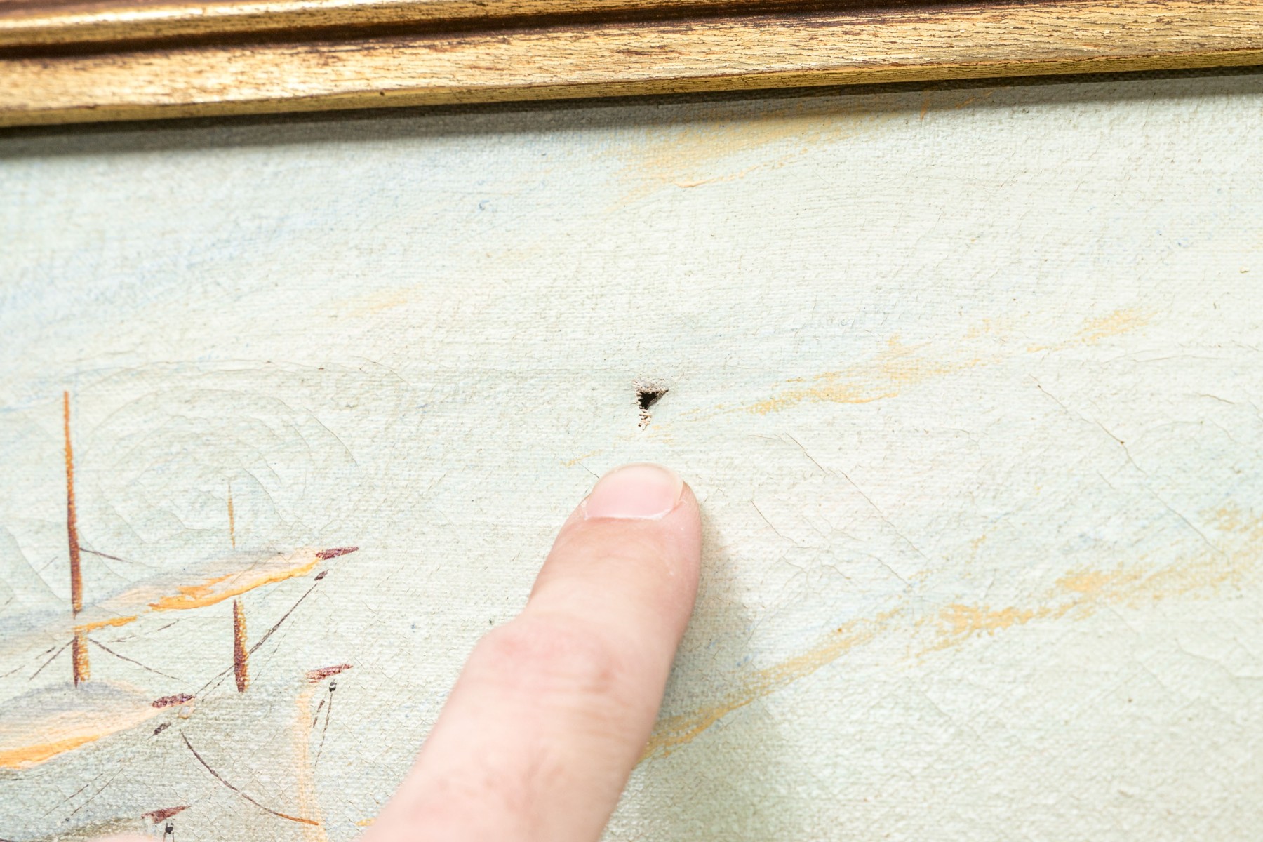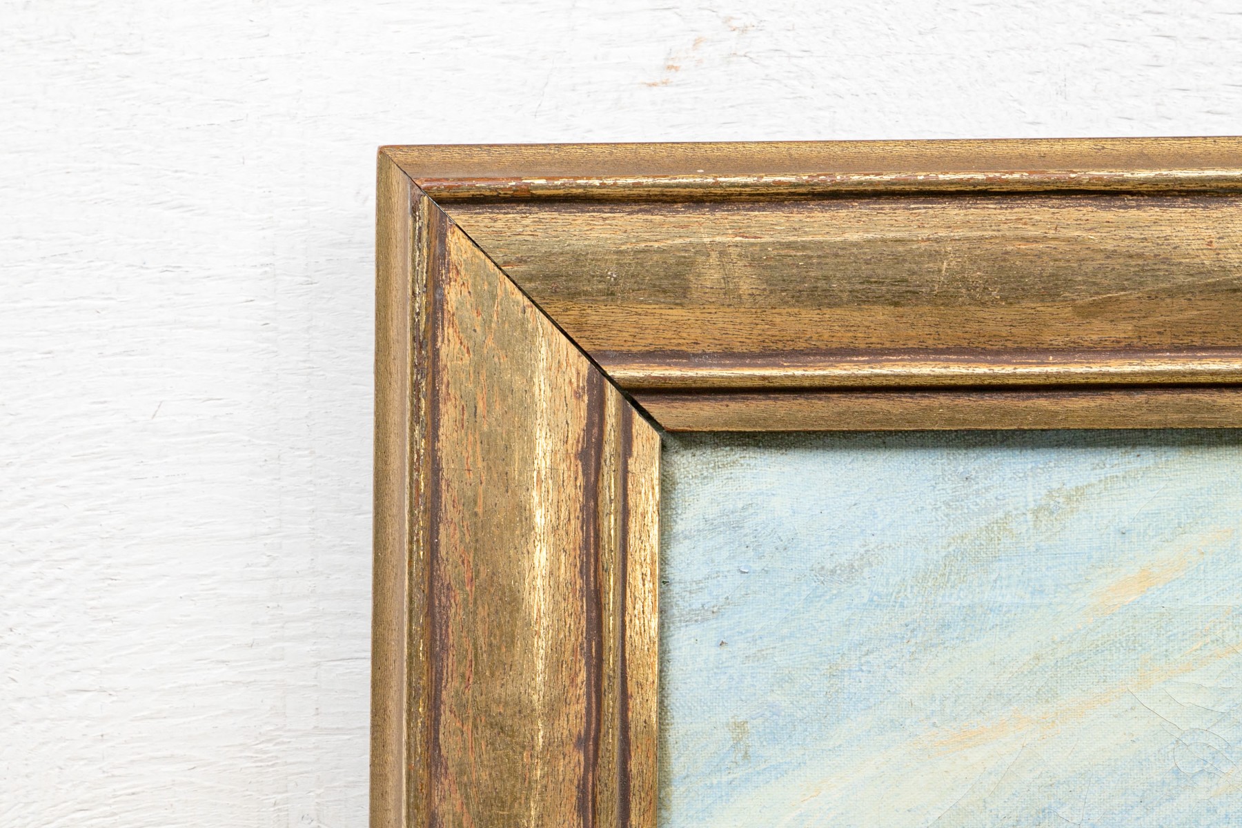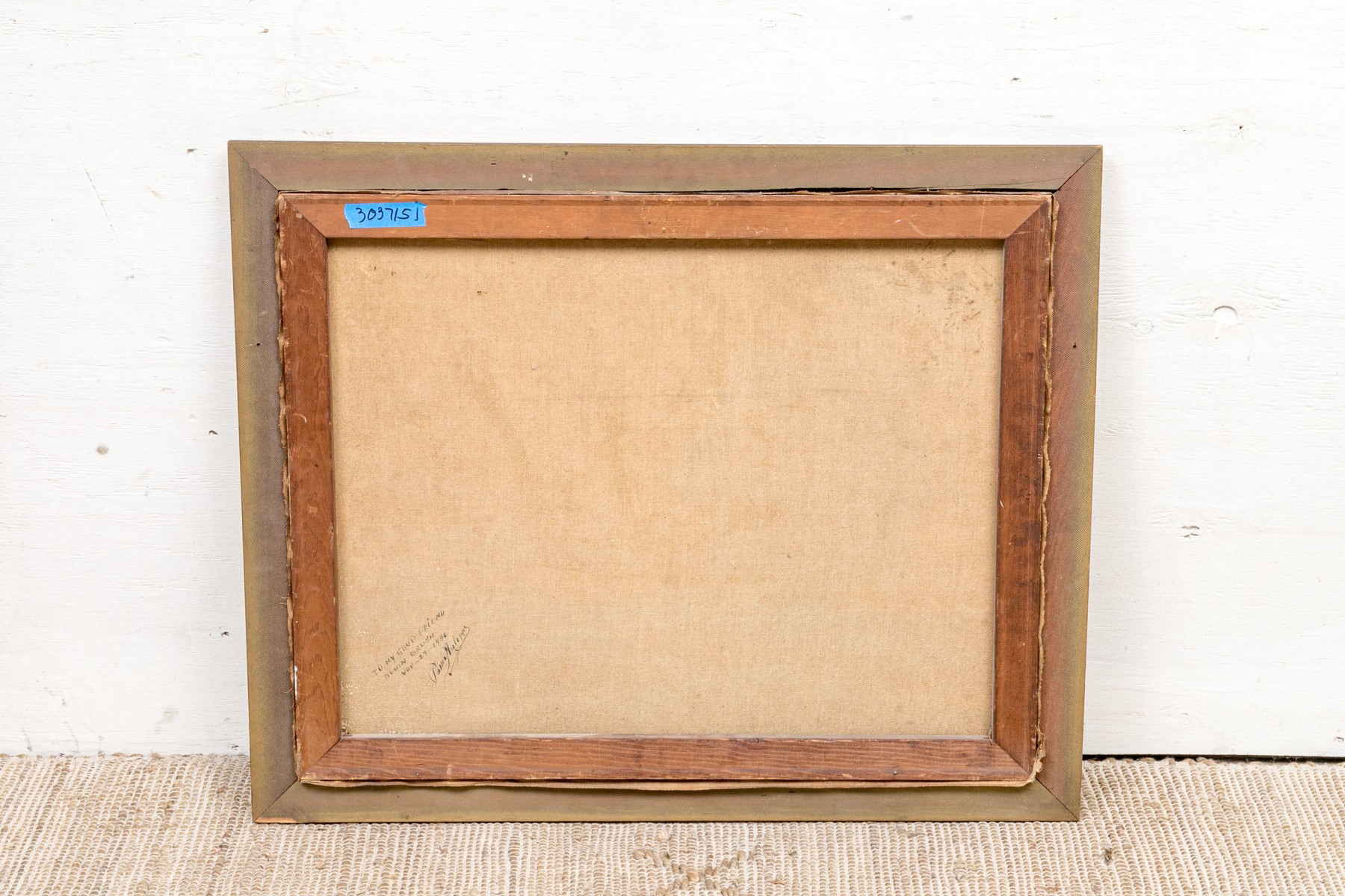 Condition: a tear and a ding to the sky, some stable cracquelure above, slight scrapes to the frame edges but minor. Please review the photos as they are part of the condition report.