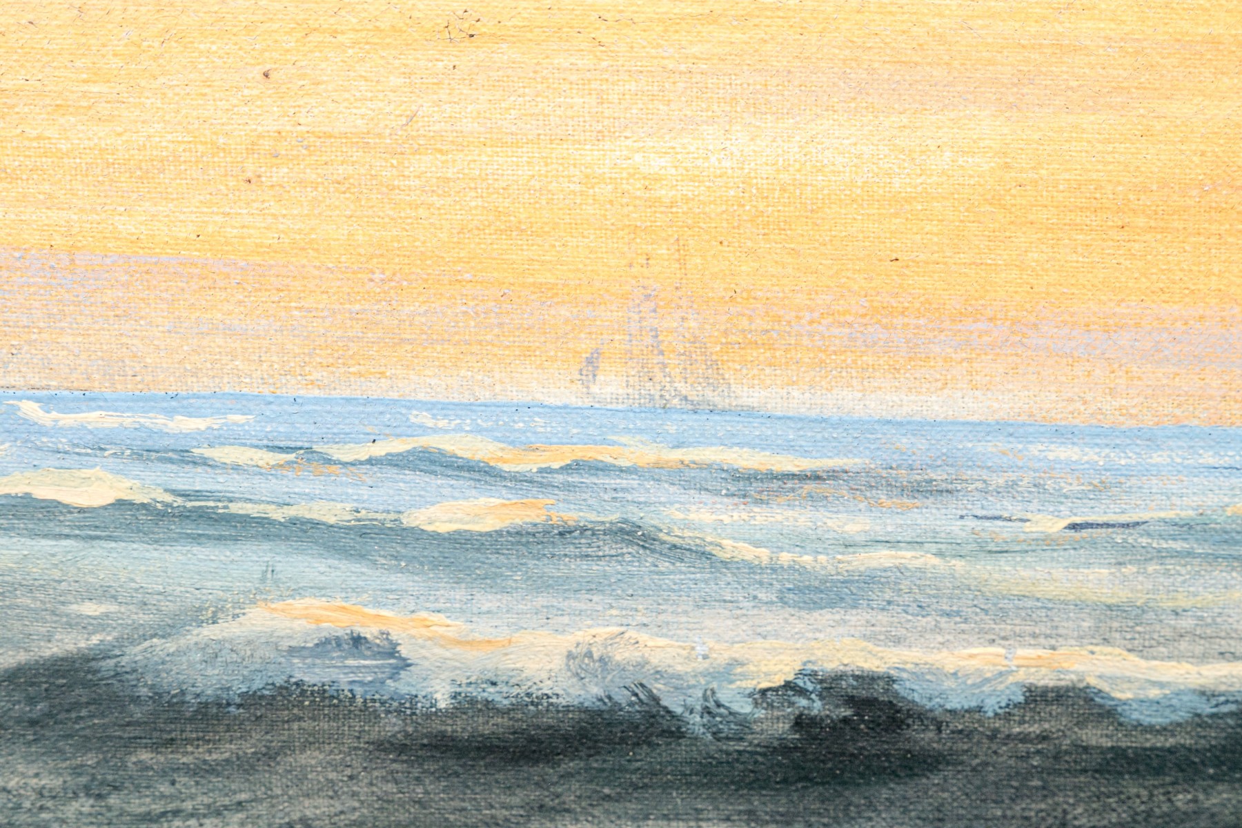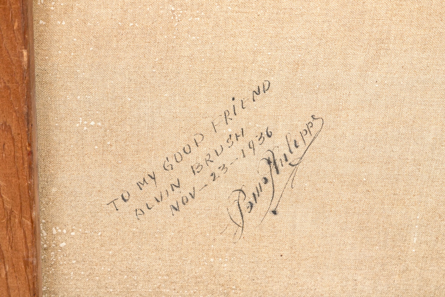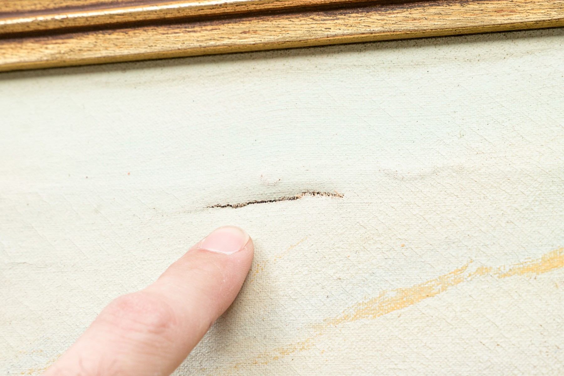 Condition: a tear and a ding to the sky, some stable cracquelure above, slight scrapes to the frame edges but minor. Please review the photos as they are part of the condition report.