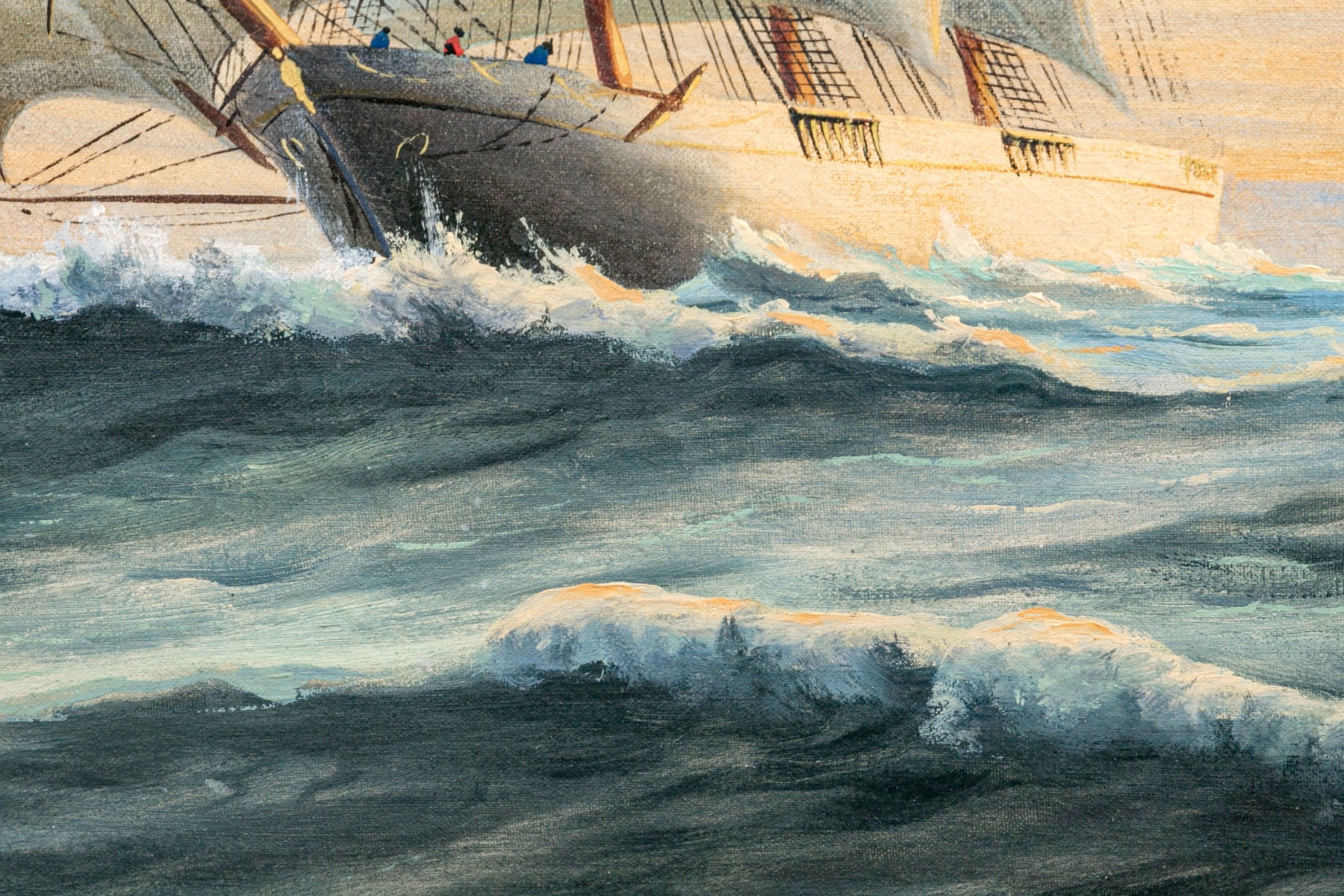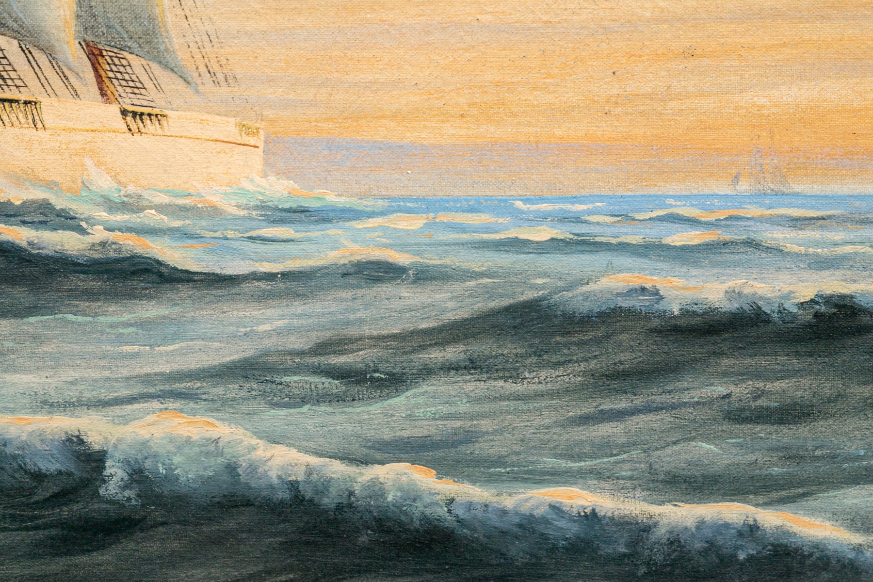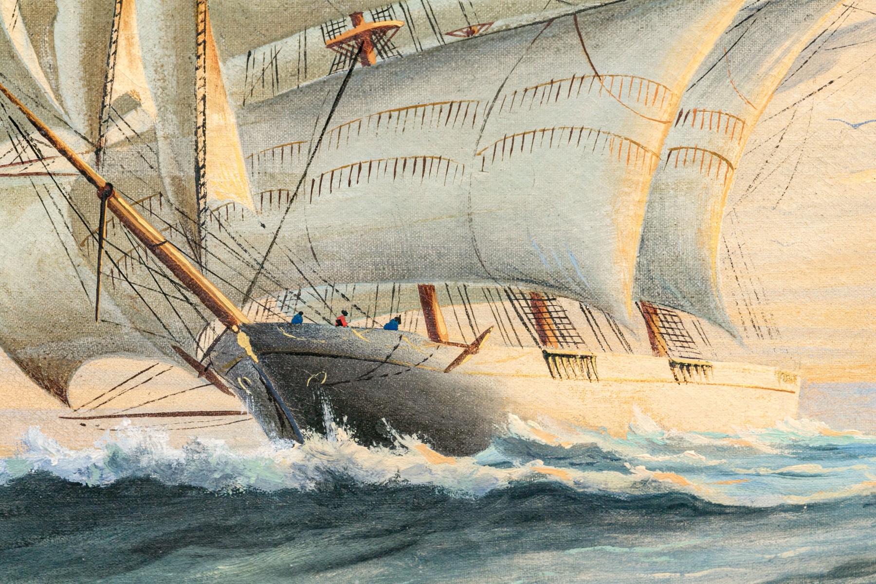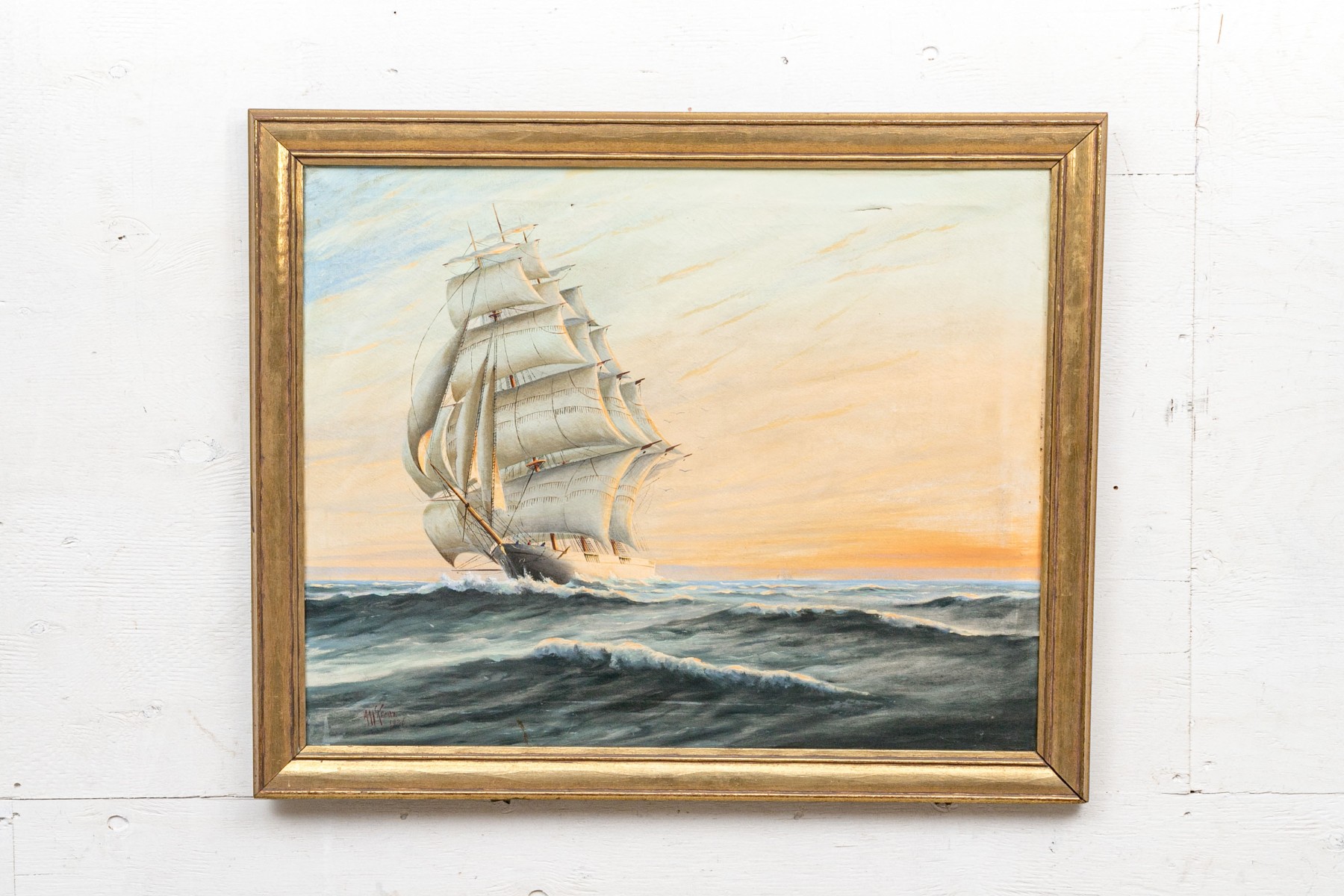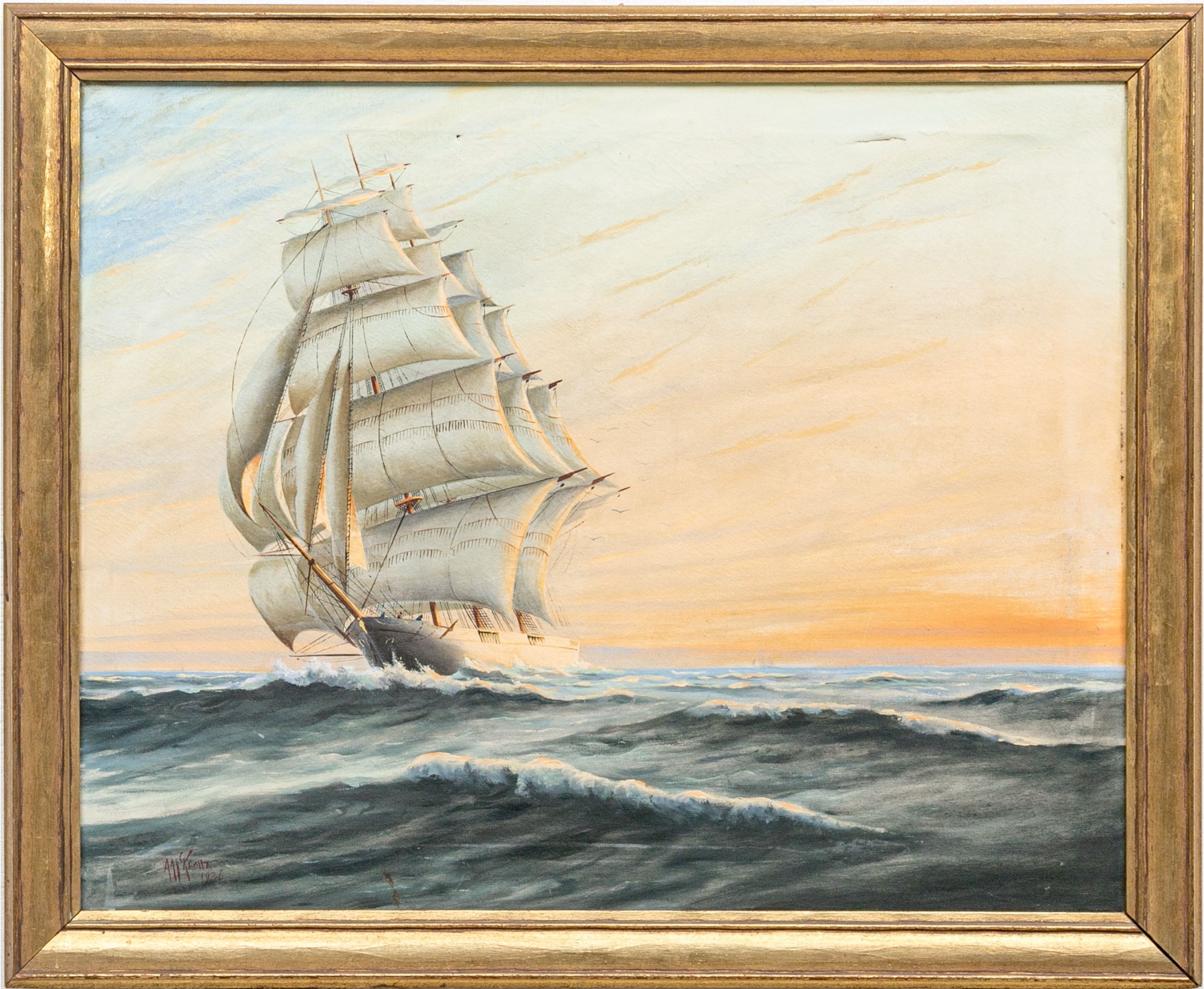 Signed in distinctly lower left and dated 1936, inscription on verso. A clipper ship under full sail on the high seas heeling in the wind at dawn. Presented in a gilt frame.
