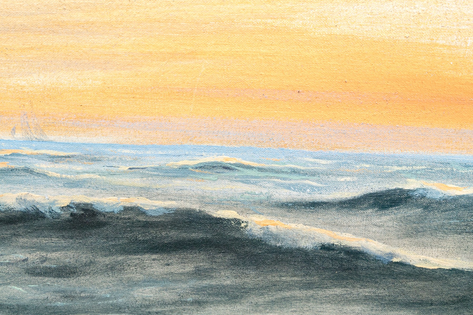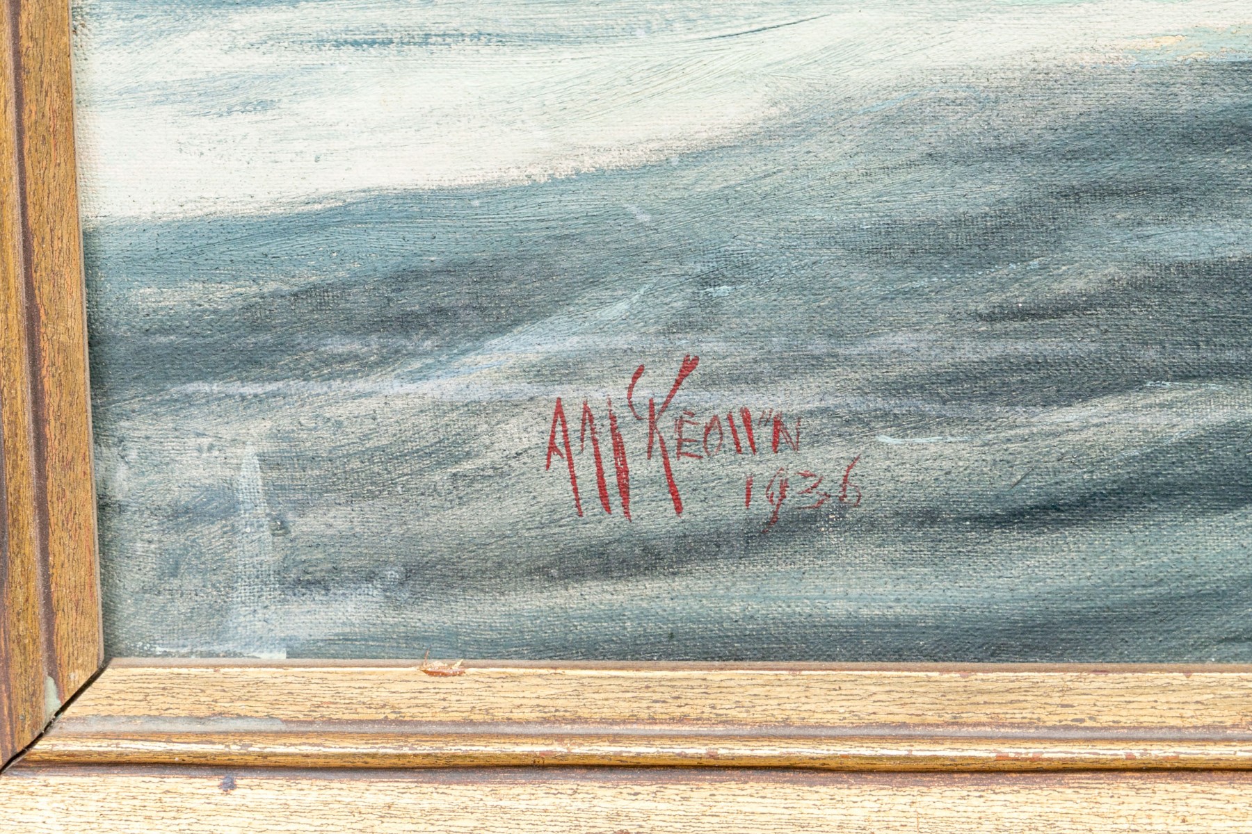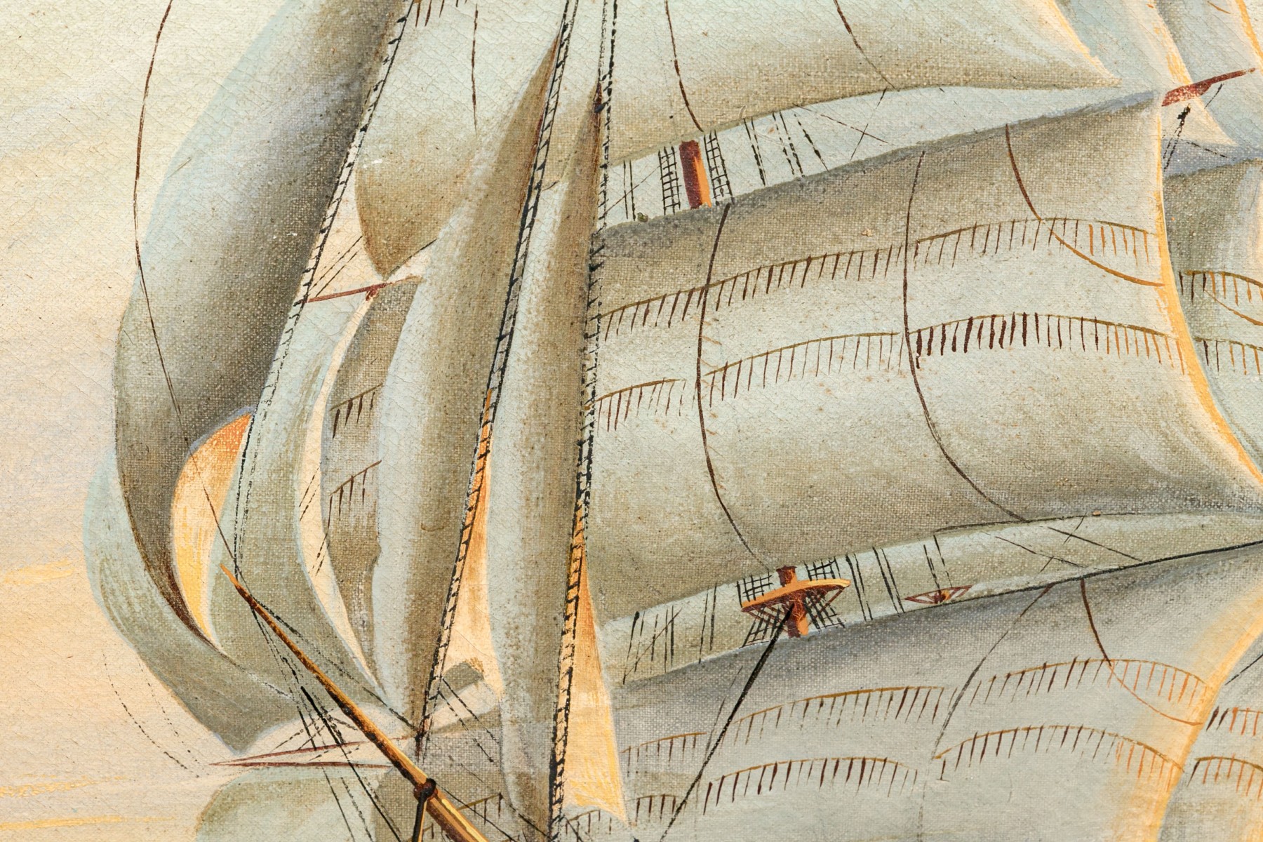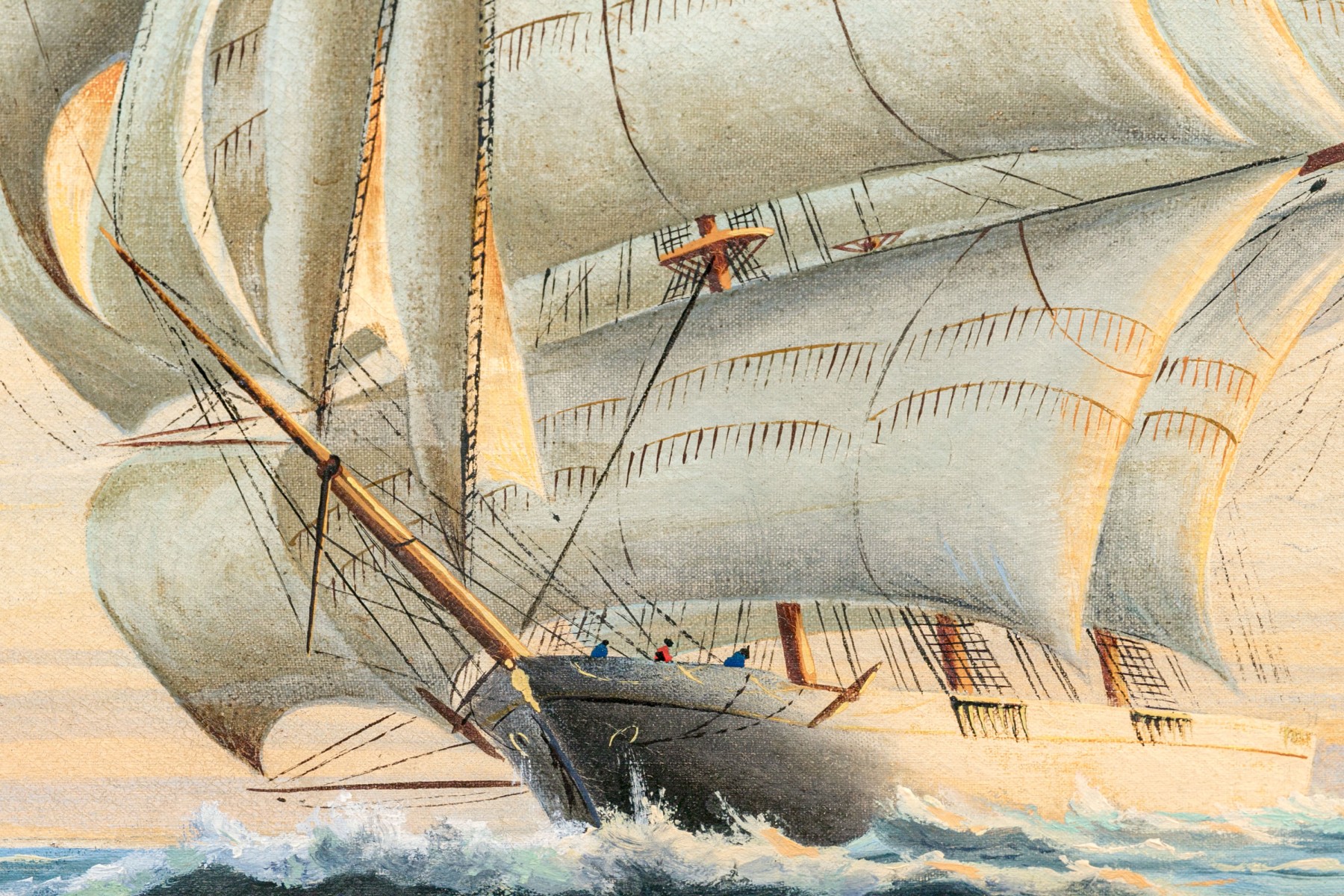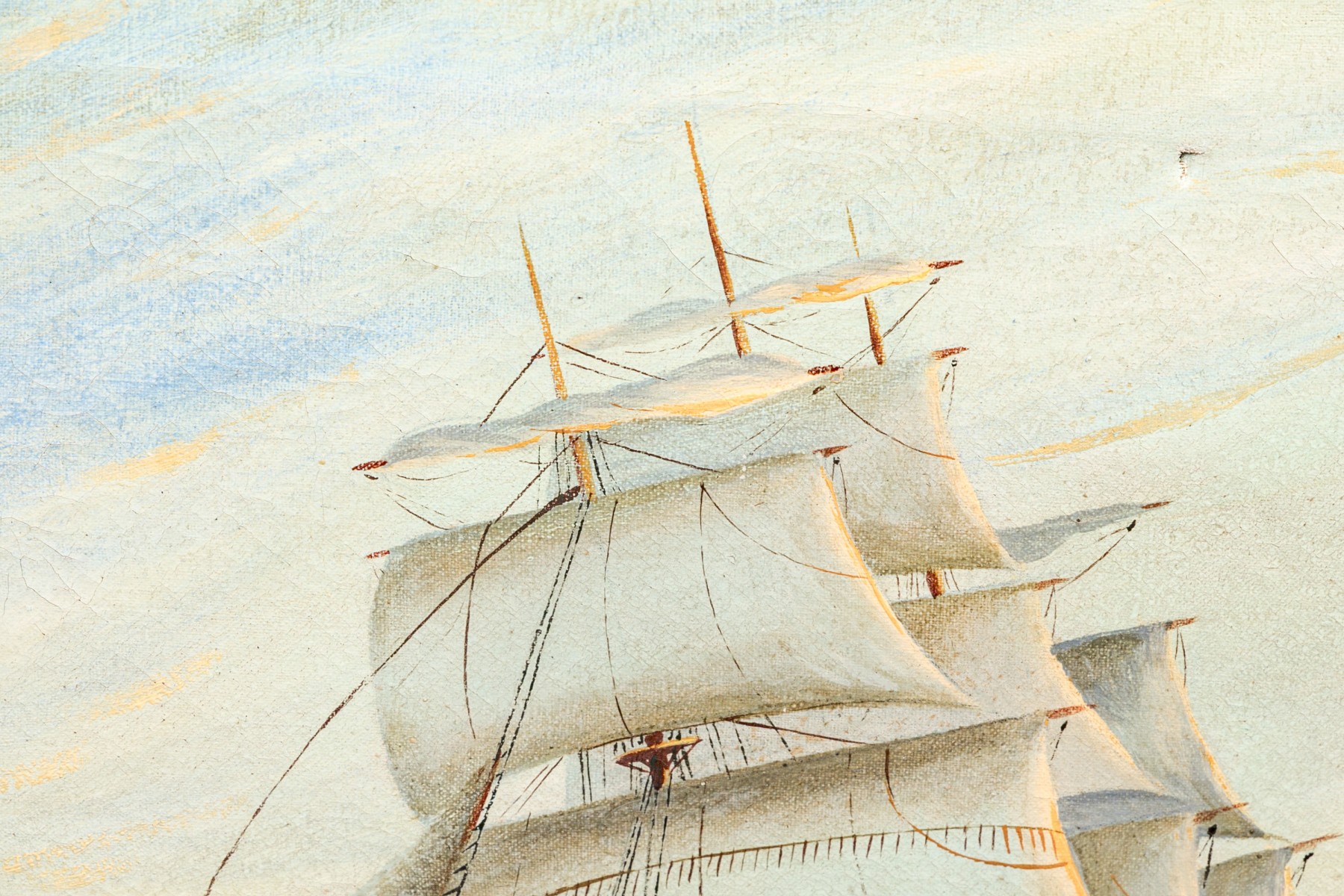 Signed in distinctly lower left and dated 1936, inscription on verso. A clipper ship under full sail on the high seas heeling in the wind at dawn. Presented in a gilt frame.