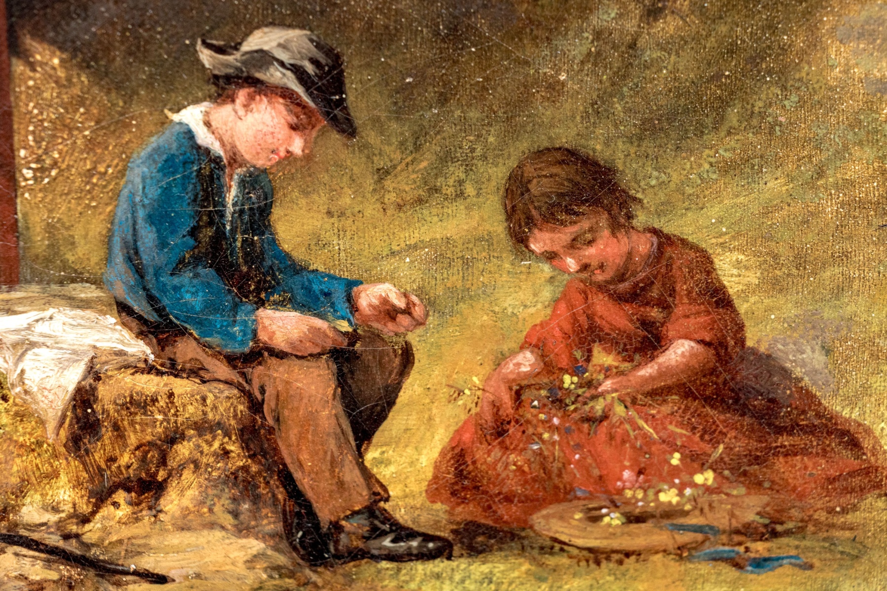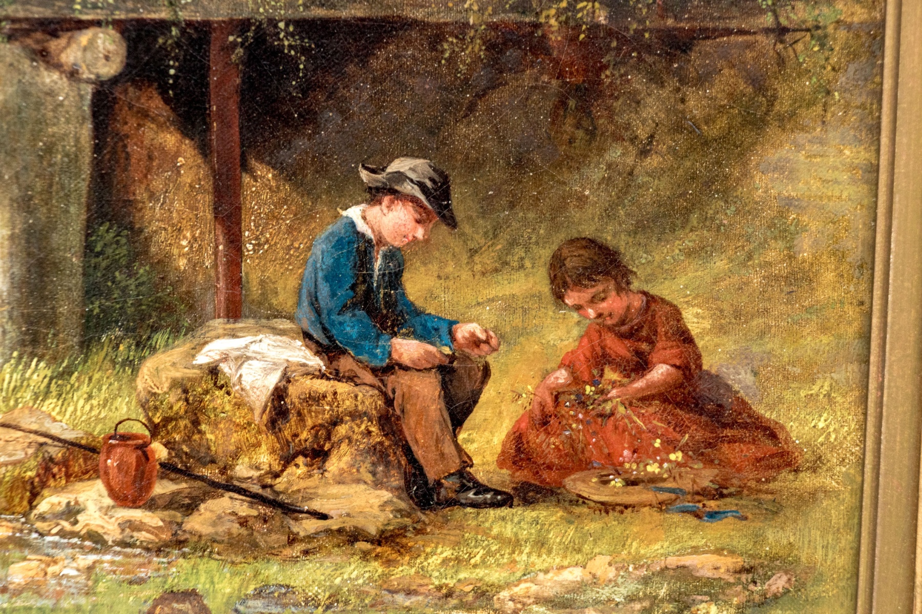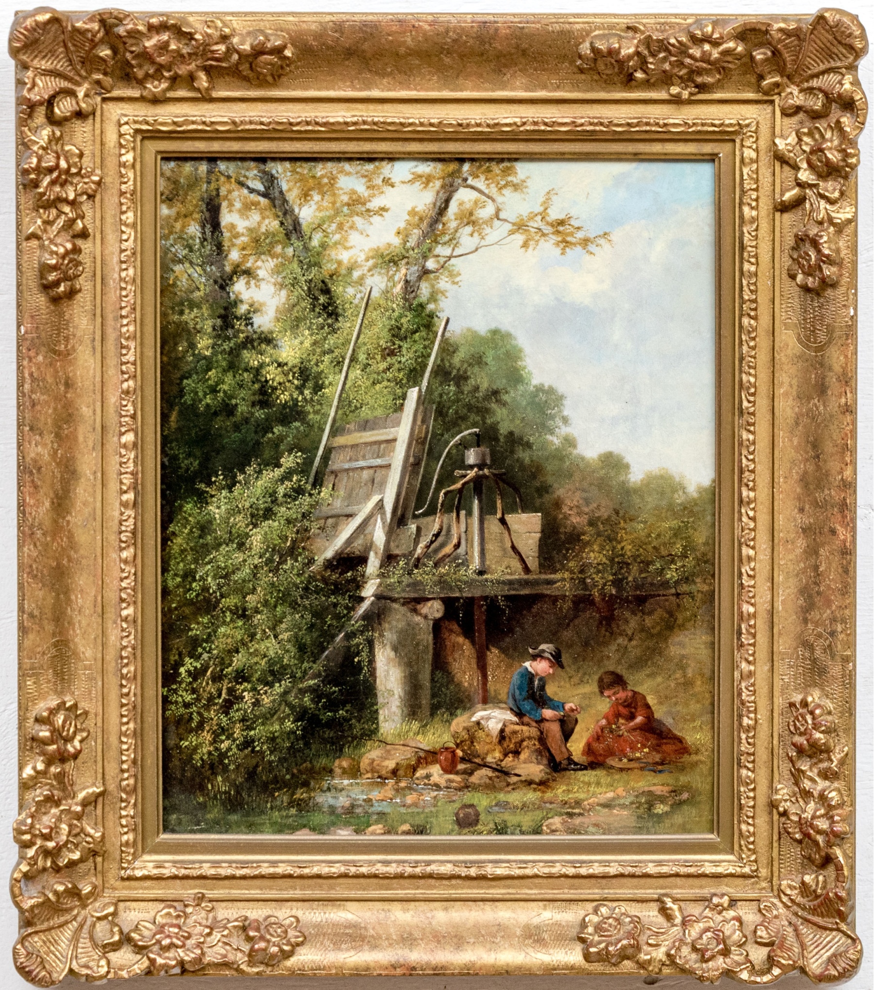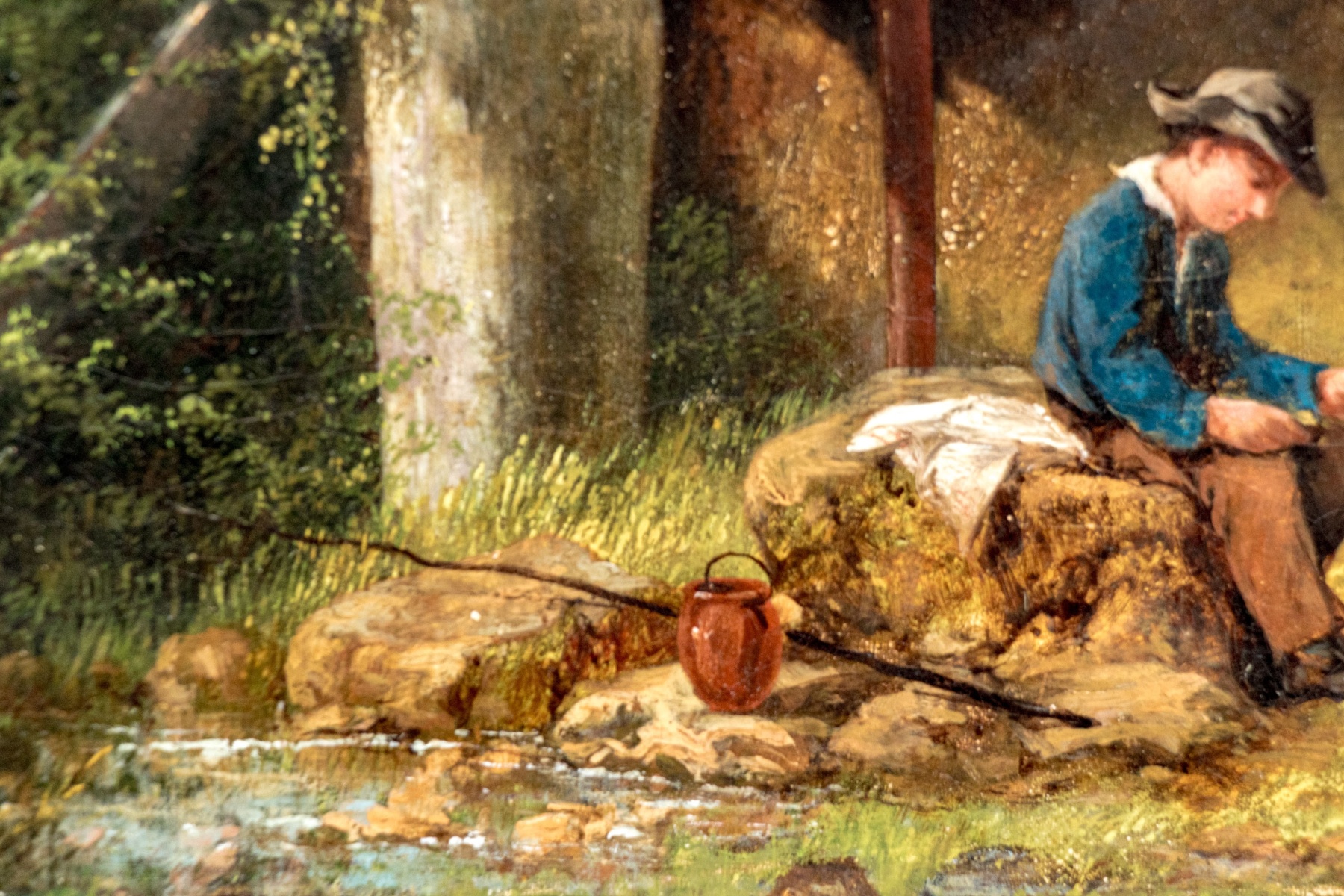 A wonderfully painted oil on canvas, depicting a genre style scene with a man and woman, seated on the rocks near a stream with fishing rod and bucket. Green trees with a man-made wooden architectural element just behind the couple. Apparently unsigned.