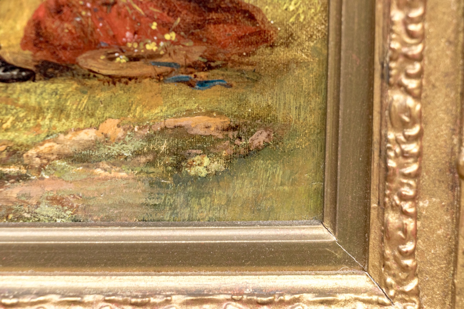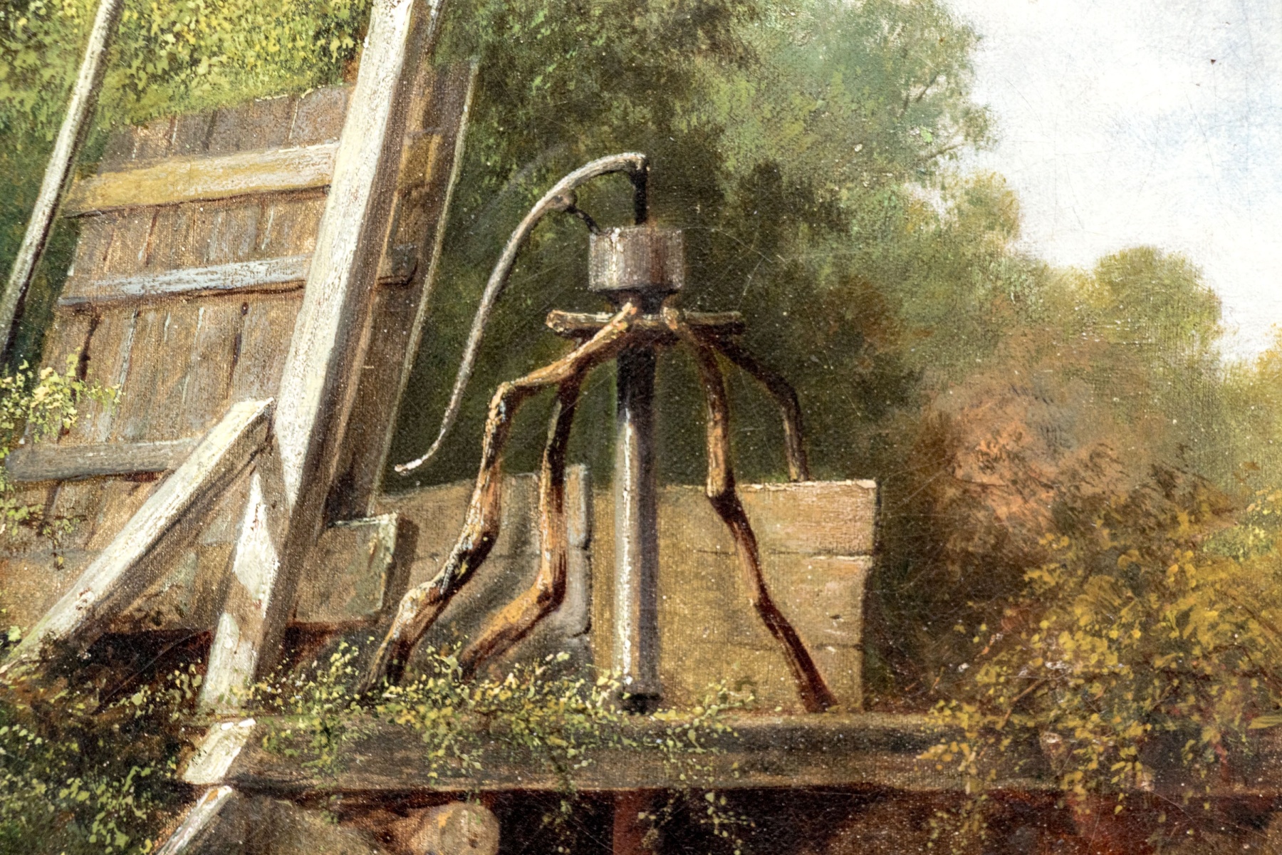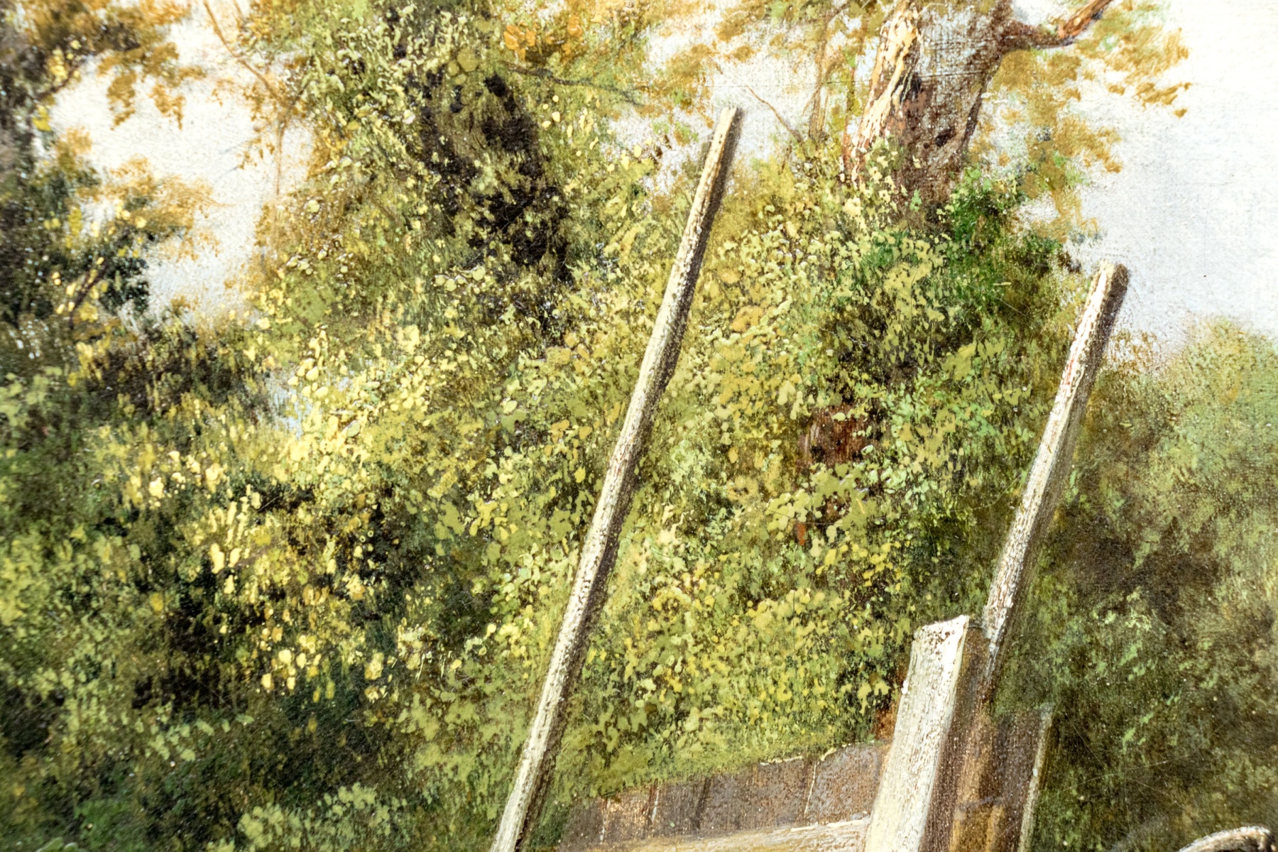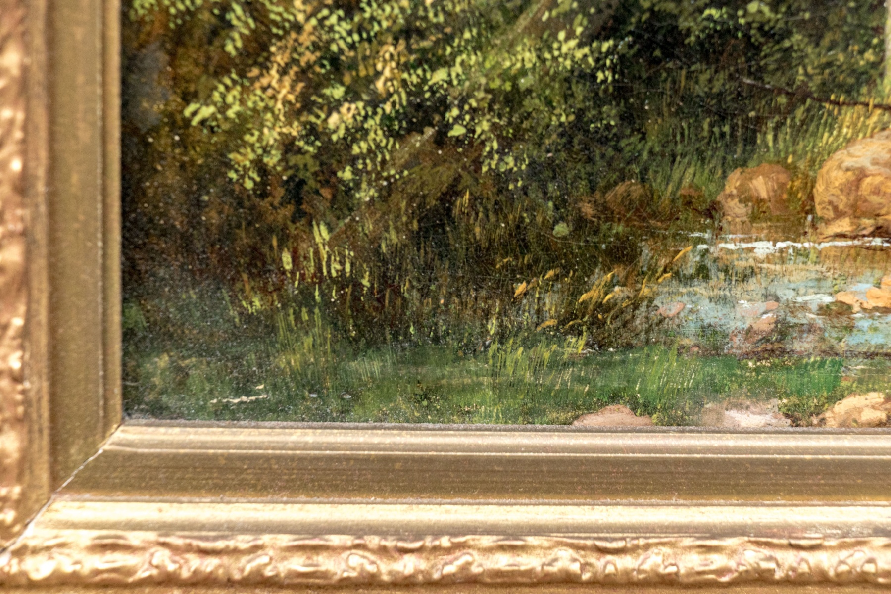 A wonderfully painted oil on canvas, depicting a genre style scene with a man and woman, seated on the rocks near a stream with fishing rod and bucket. Green trees with a man-made wooden architectural element just behind the couple. Apparently unsigned.