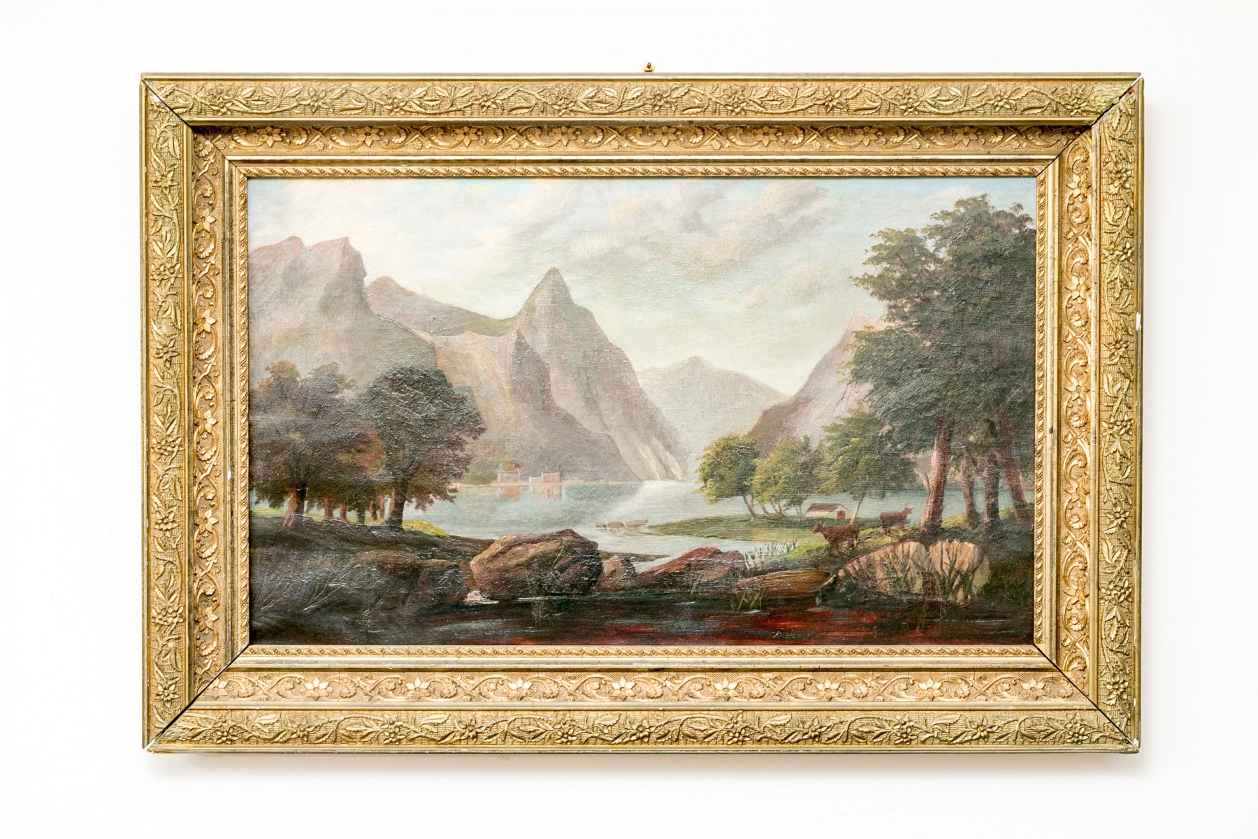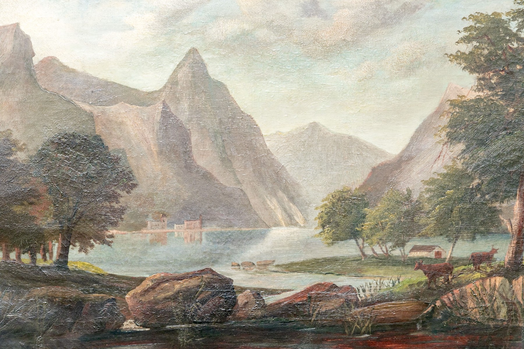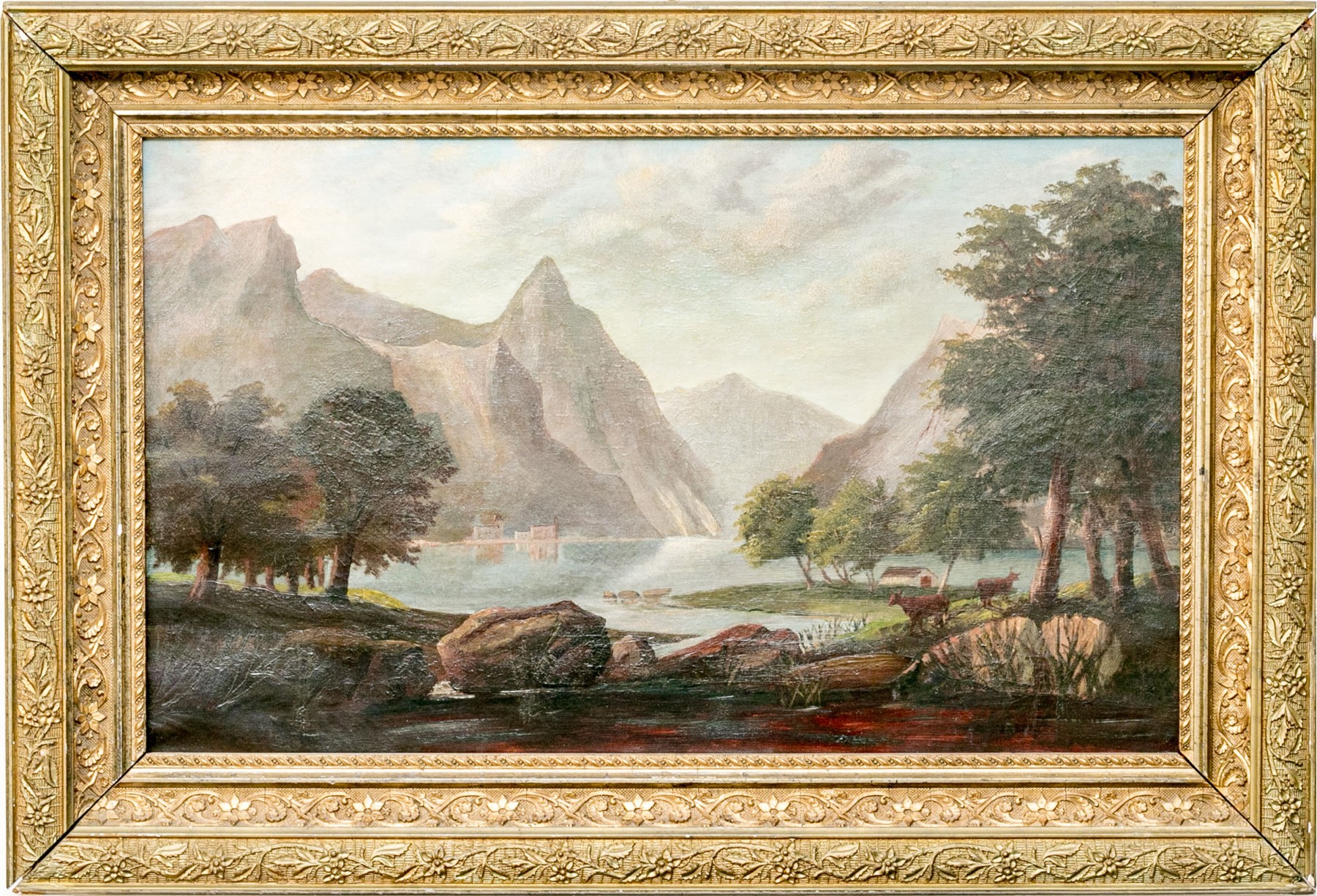 Wonderfully painted in the Naturalistic manner. Depicting a fabulous mountainous landscape with towering mountains in the distance with a body of water in the mid ground. A small outcrop of land shelters a small cabin with two cows grazing.
