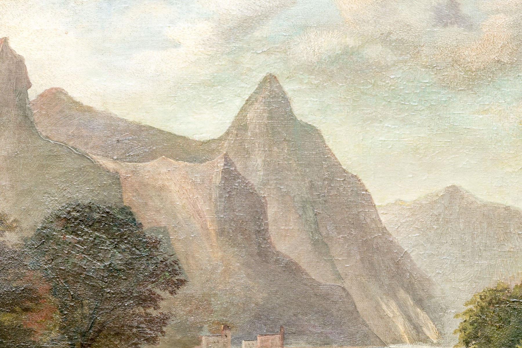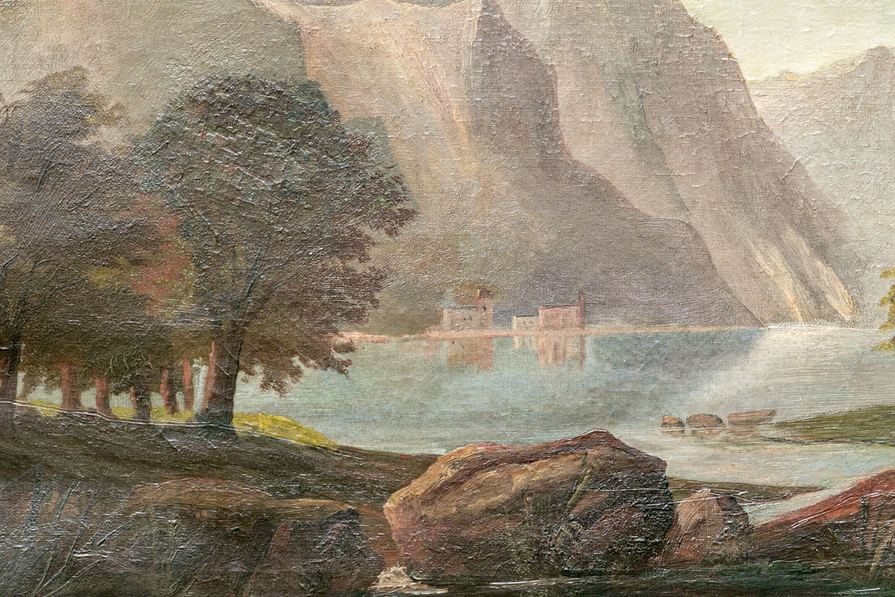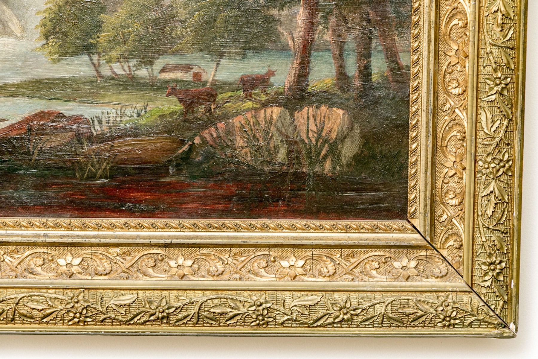 Wonderfully painted in the Naturalistic manner. Depicting a fabulous mountainous landscape with towering mountains in the distance with a body of water in the mid ground. A small outcrop of land shelters a small cabin with two cows grazing.