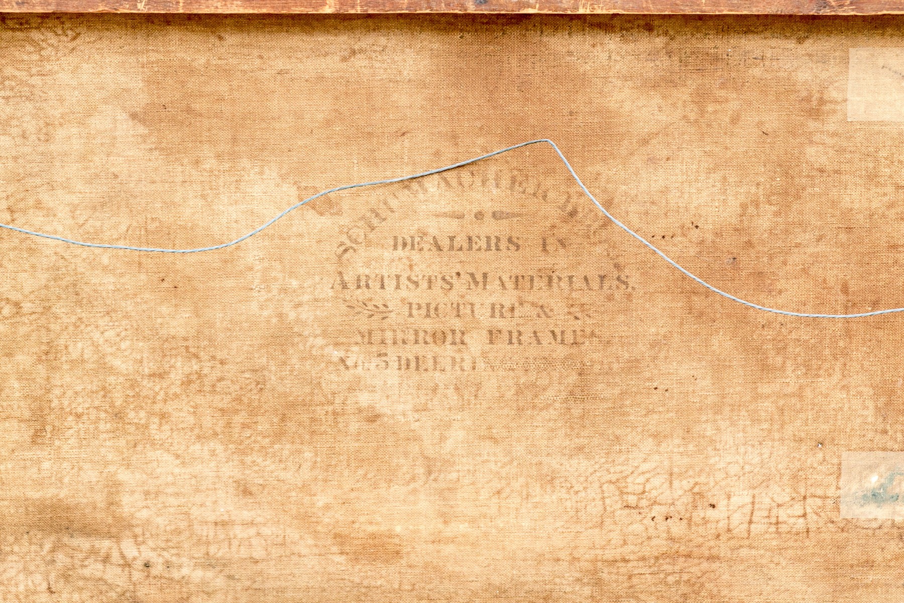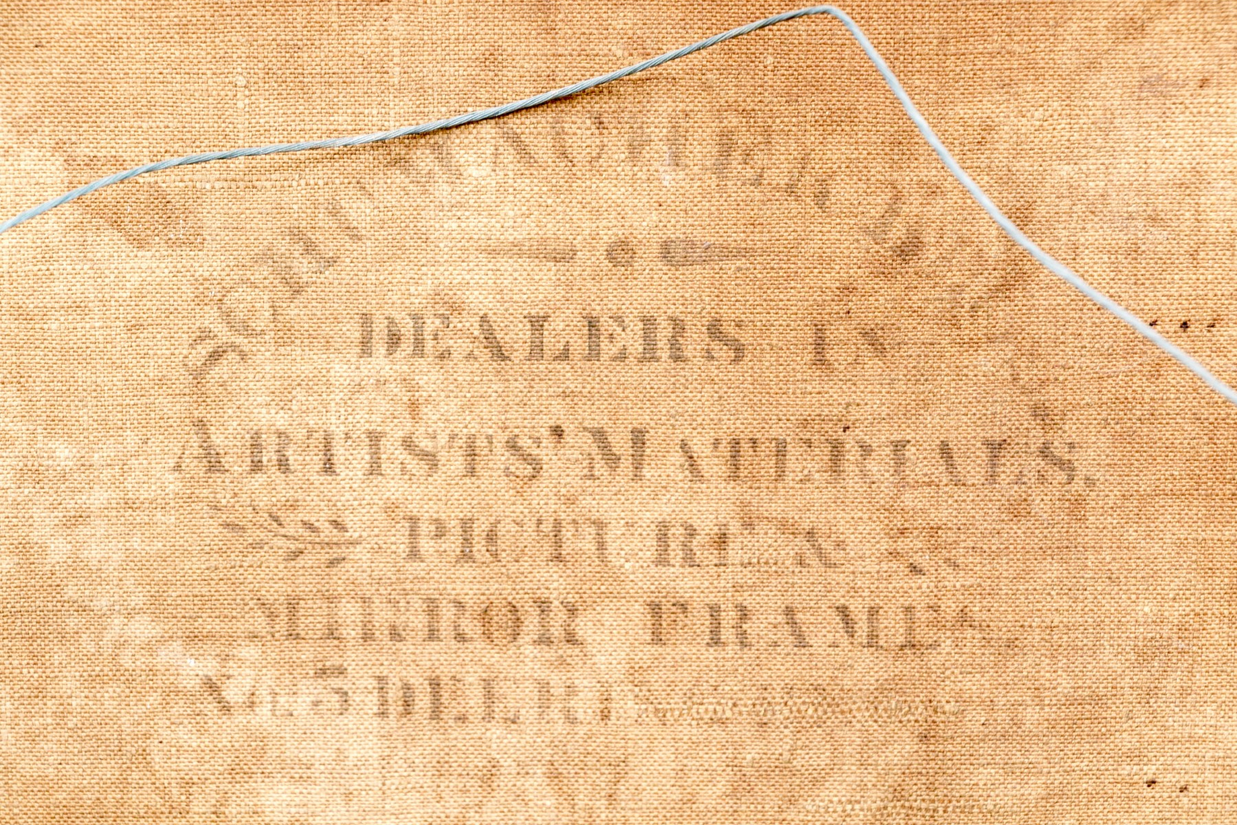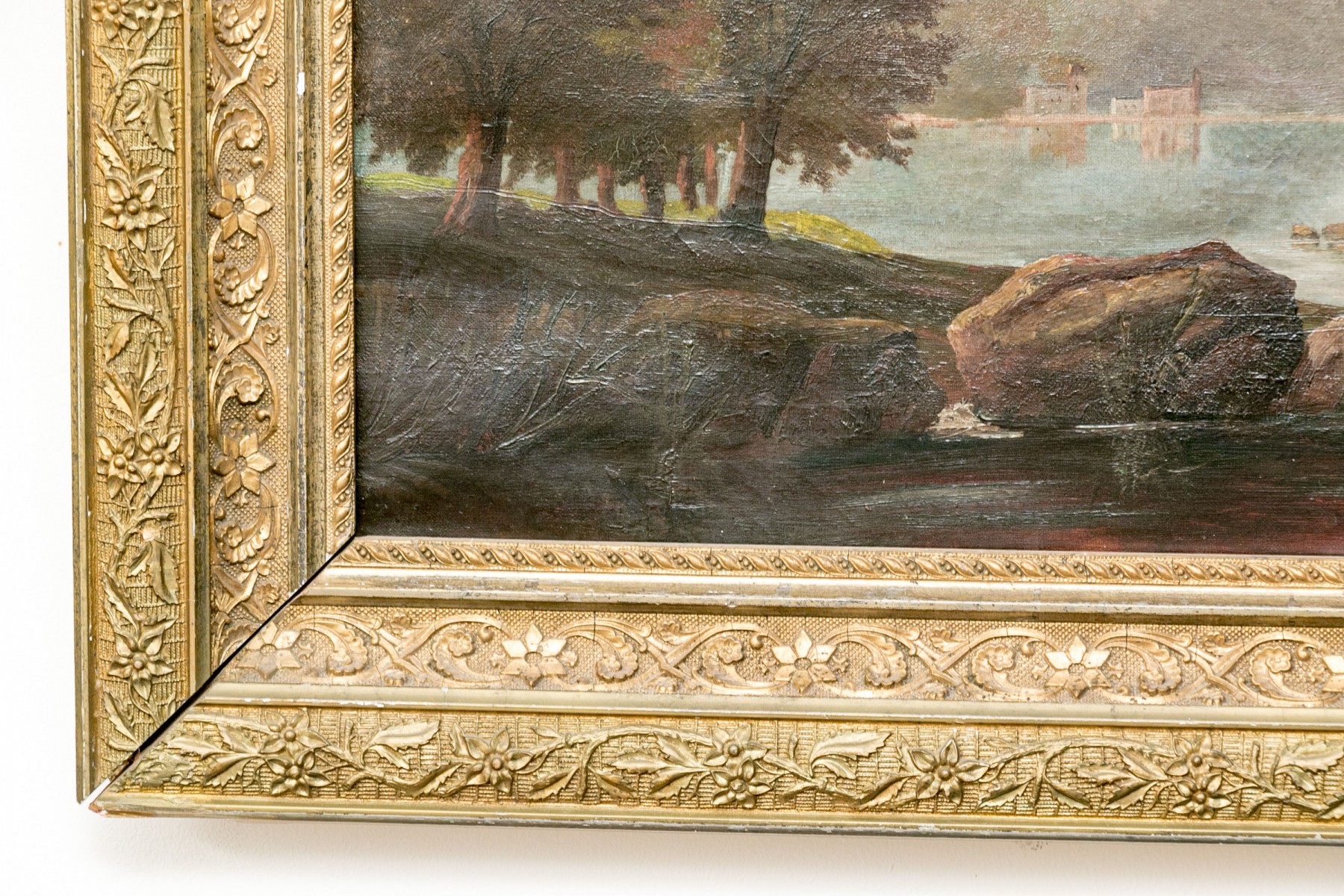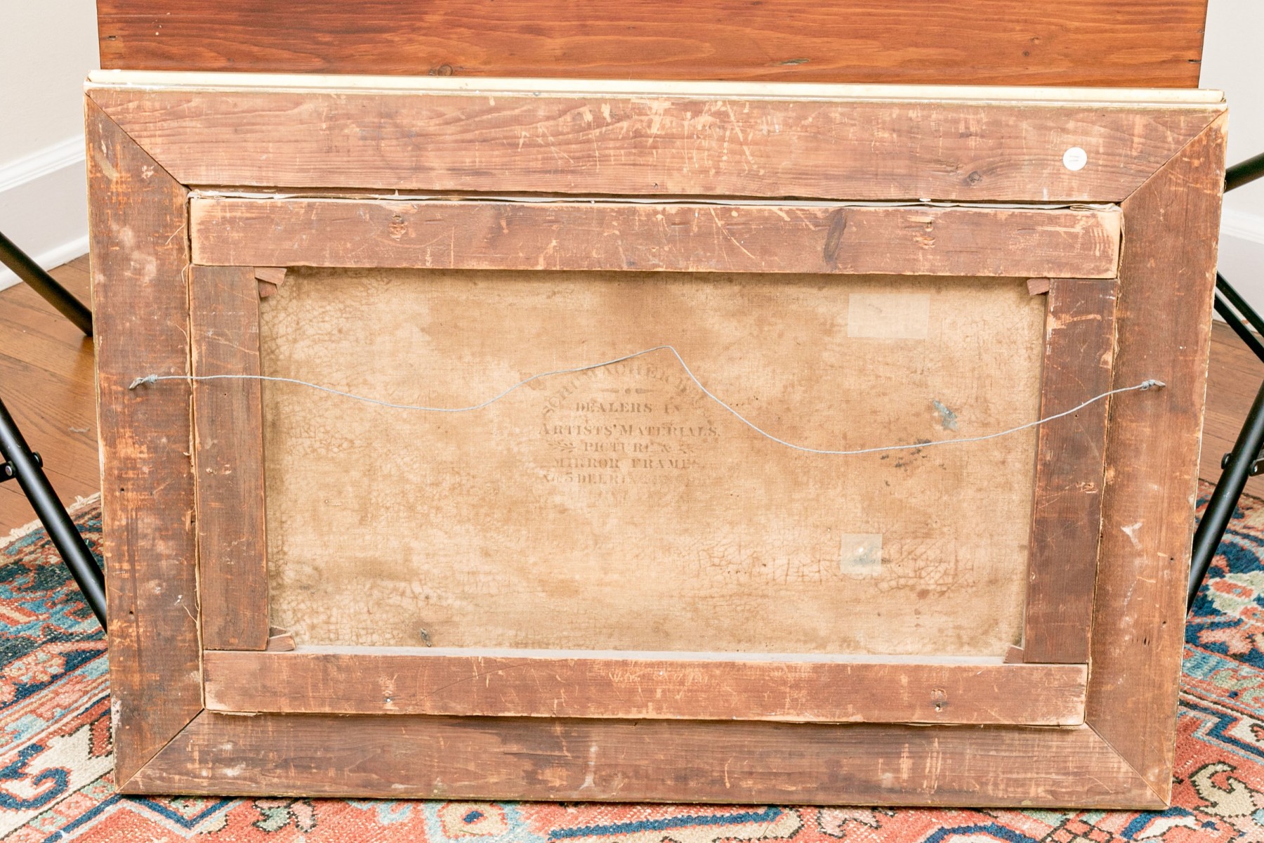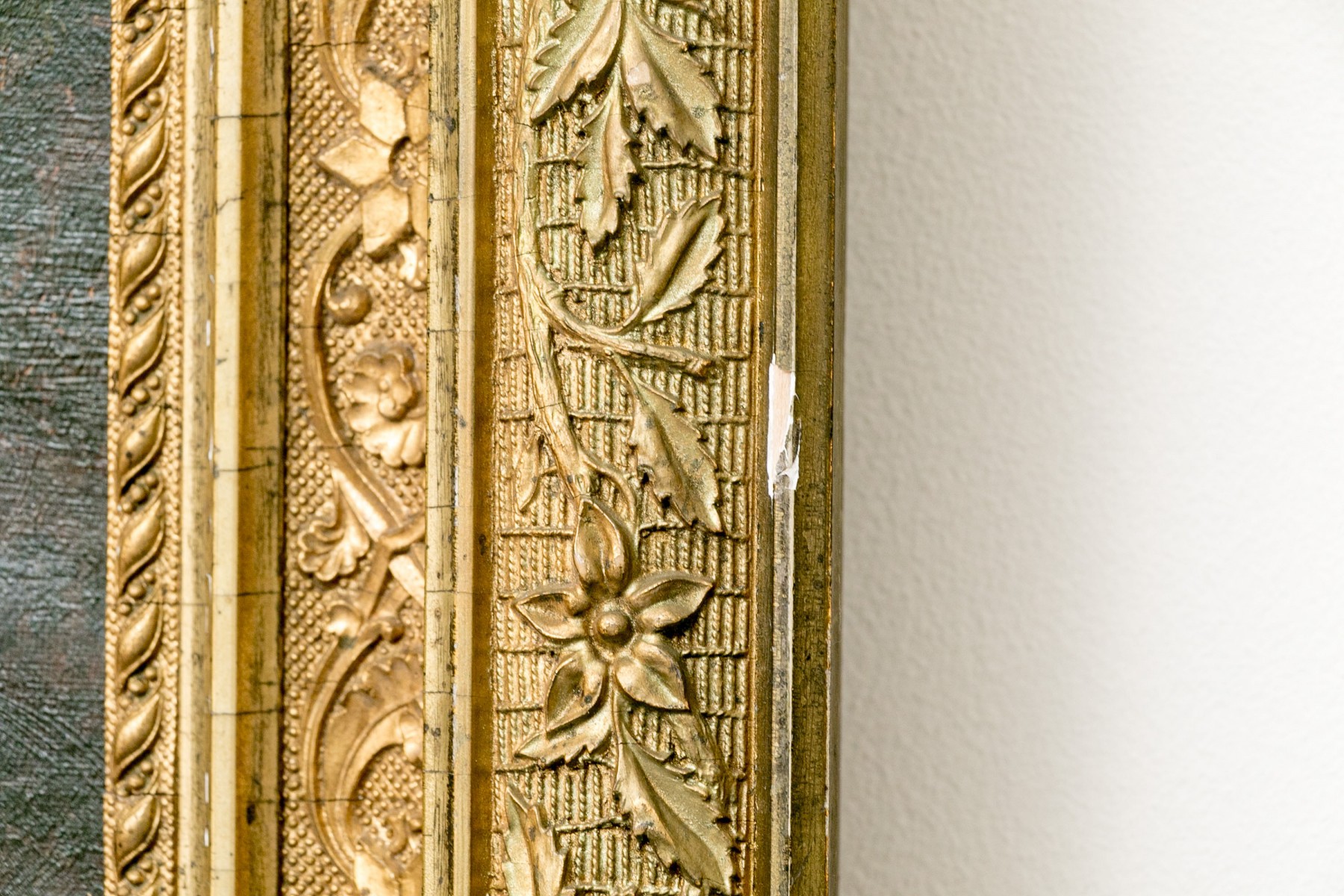 Condition: Two patches can be seen on verso to canvas which is an older restoration. Under blacklight there are areas of in painting and older restorations. There is craquelure to the painting as well. See lot images for further visual inspection. The frame is separating slightly to the corners along with chips and losses to the frame.