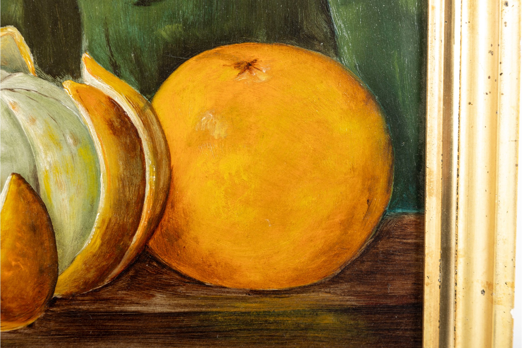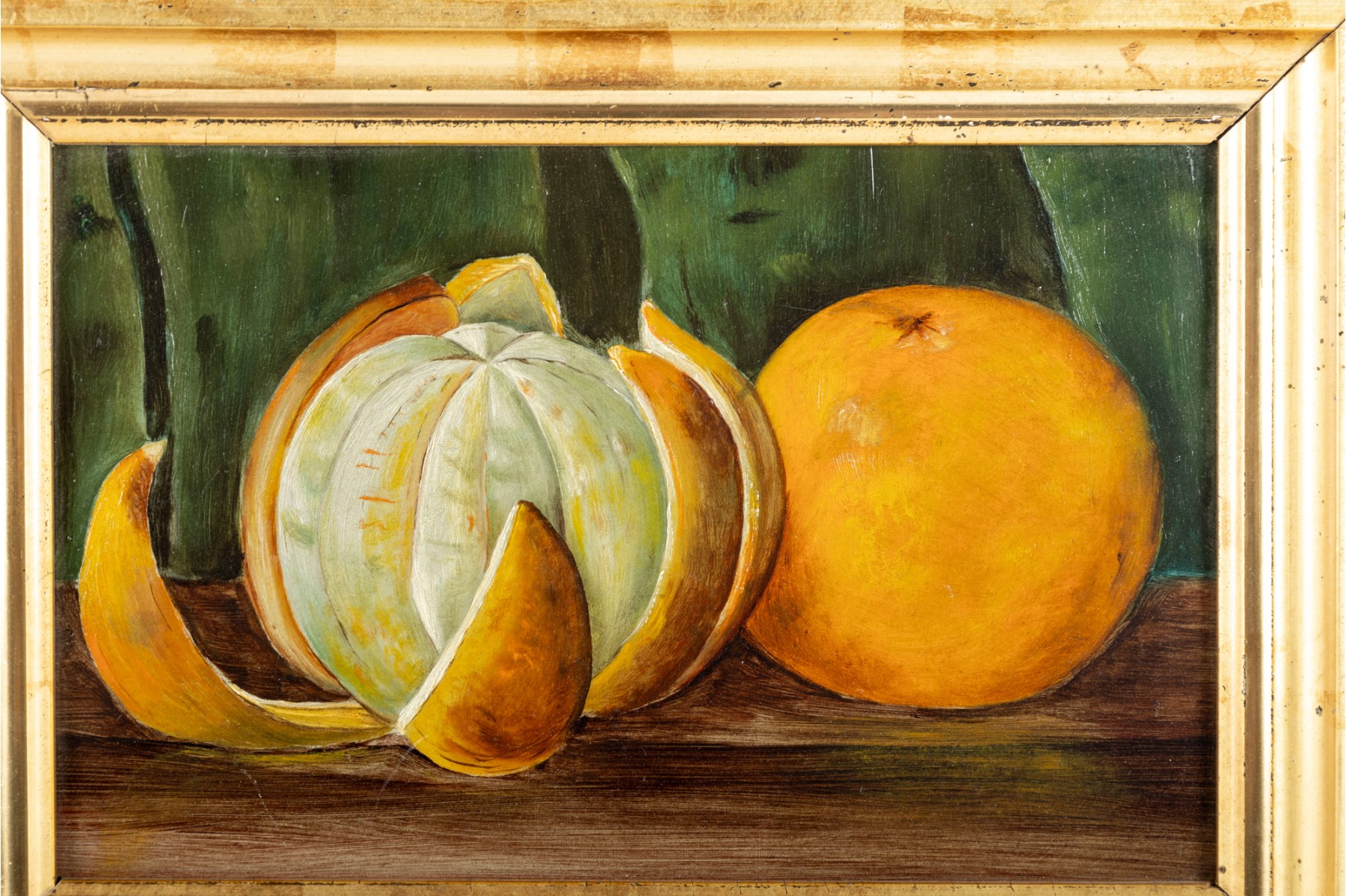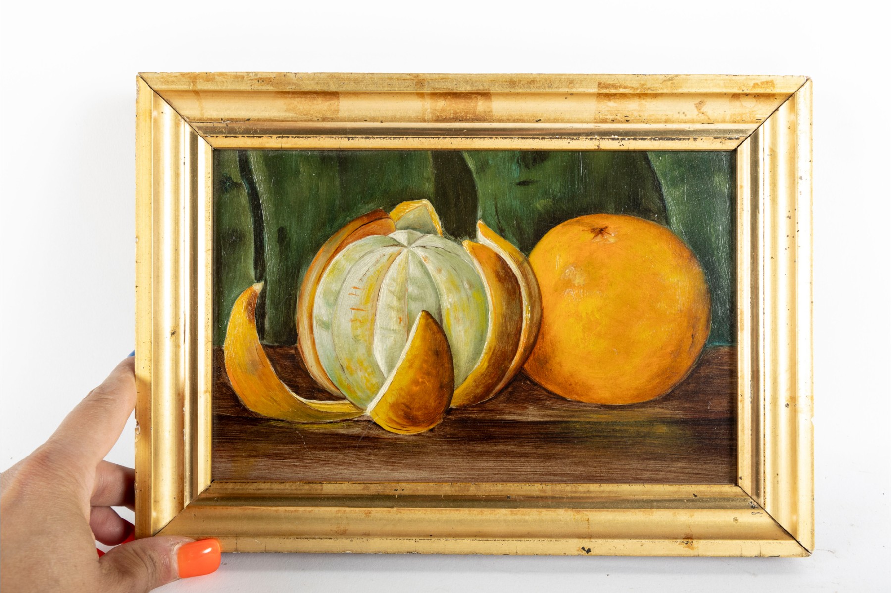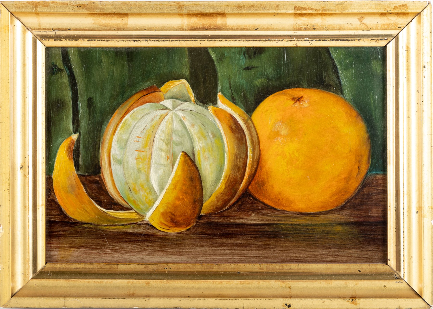 A small, antique oil on board still life of oranges, untitled, circa 1930. The artwork is displayed openly within a gold-tone wood frame.