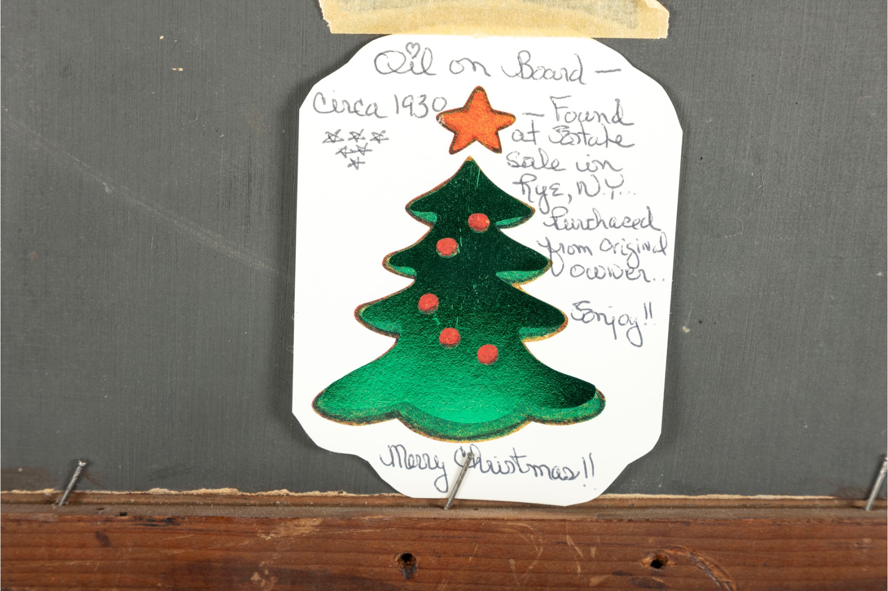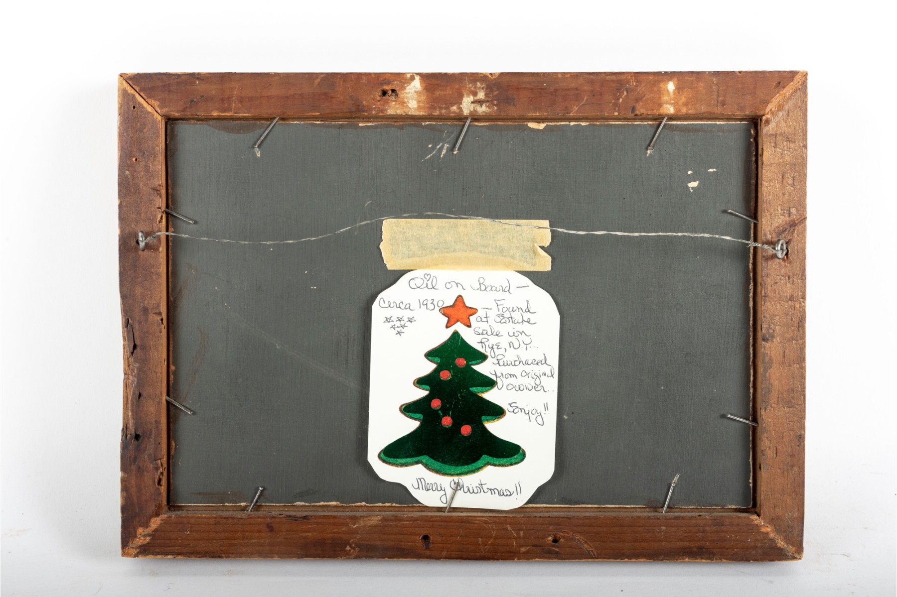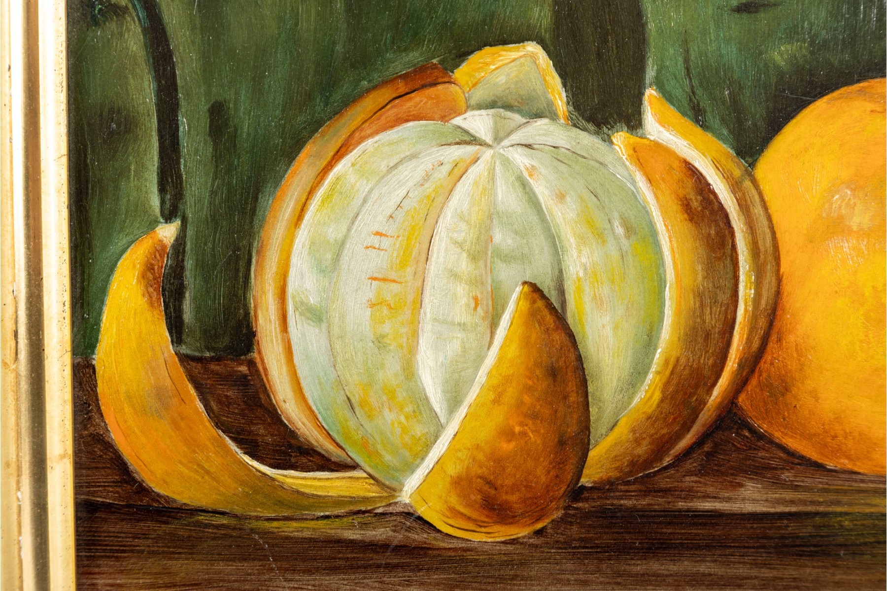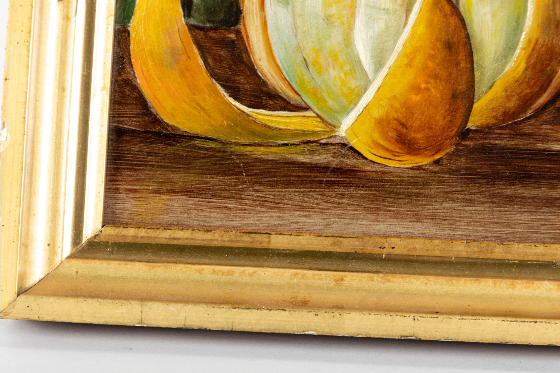 A small, antique oil on board still life of oranges, untitled, circa 1930. The artwork is displayed openly within a gold-tone wood frame.