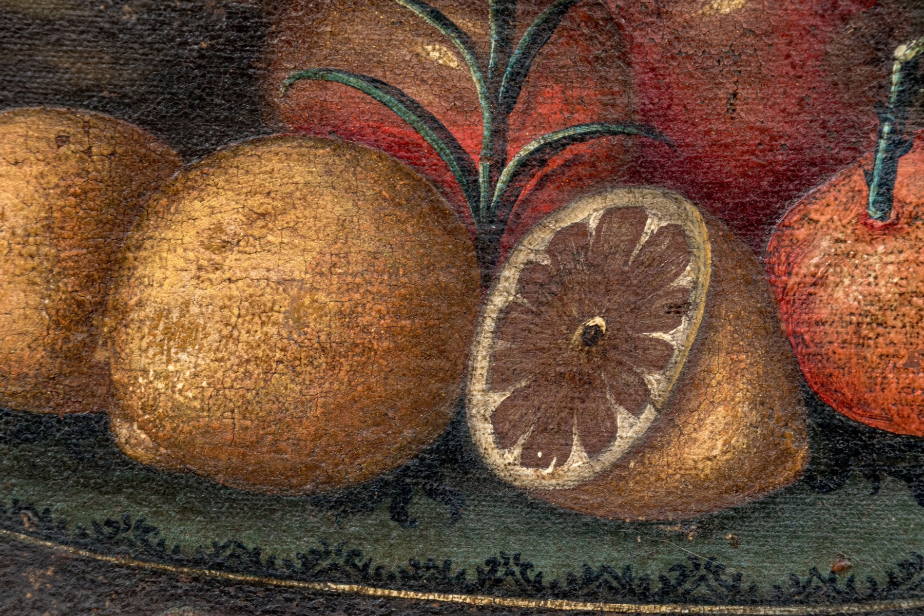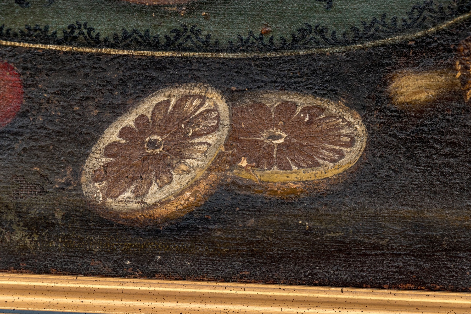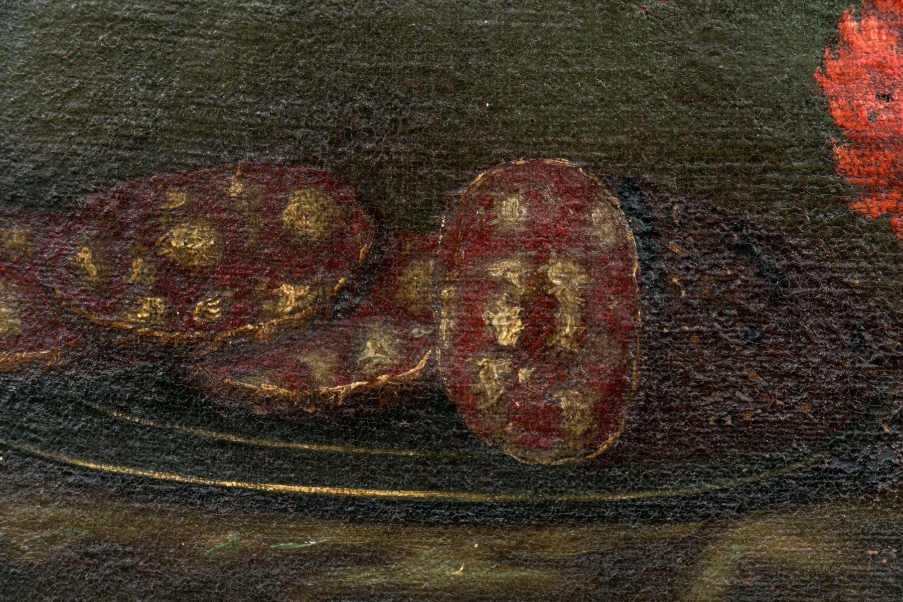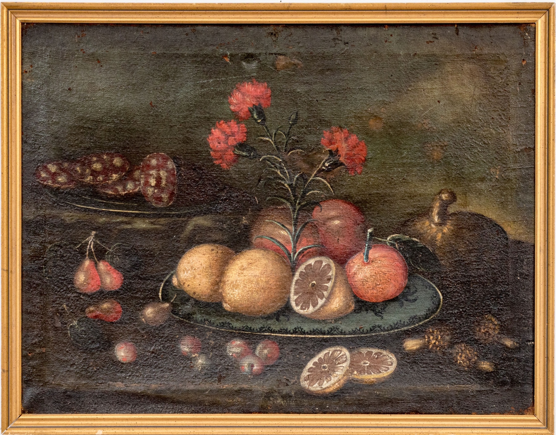 A charming antique oil painting on canvas depicting a still life with well decorated platters full of meat and fruit, including a plate of citrus and orange carnations set atop a brown table with pears, mushrooms, and a pumpkin against an olive-brown ground.