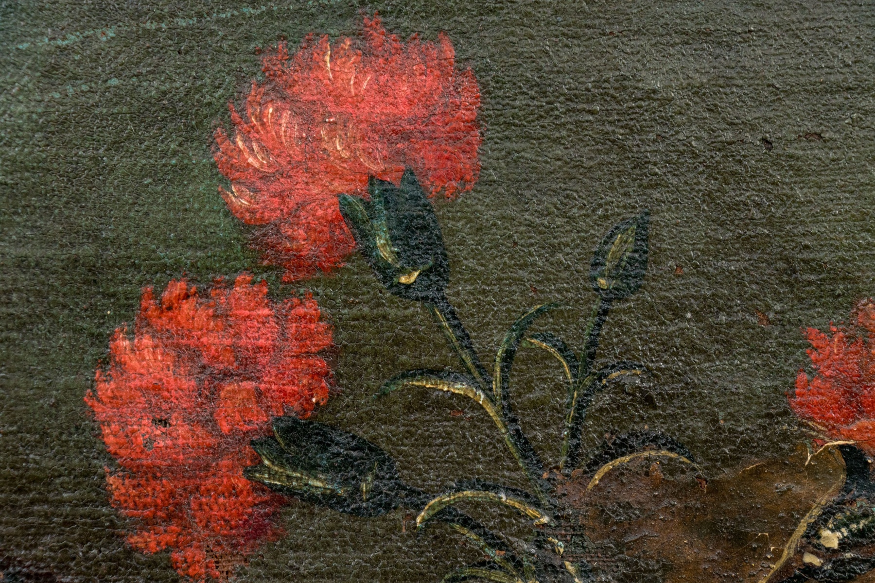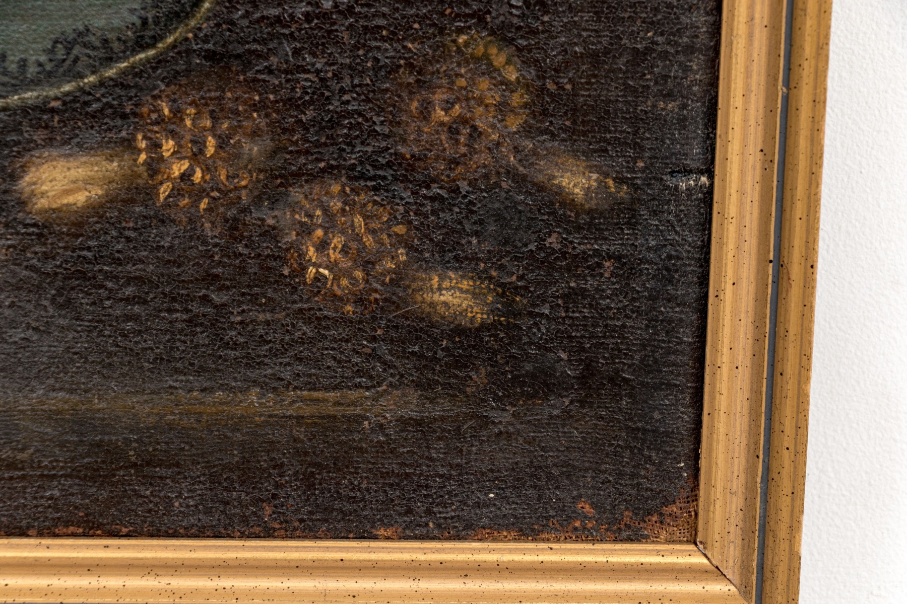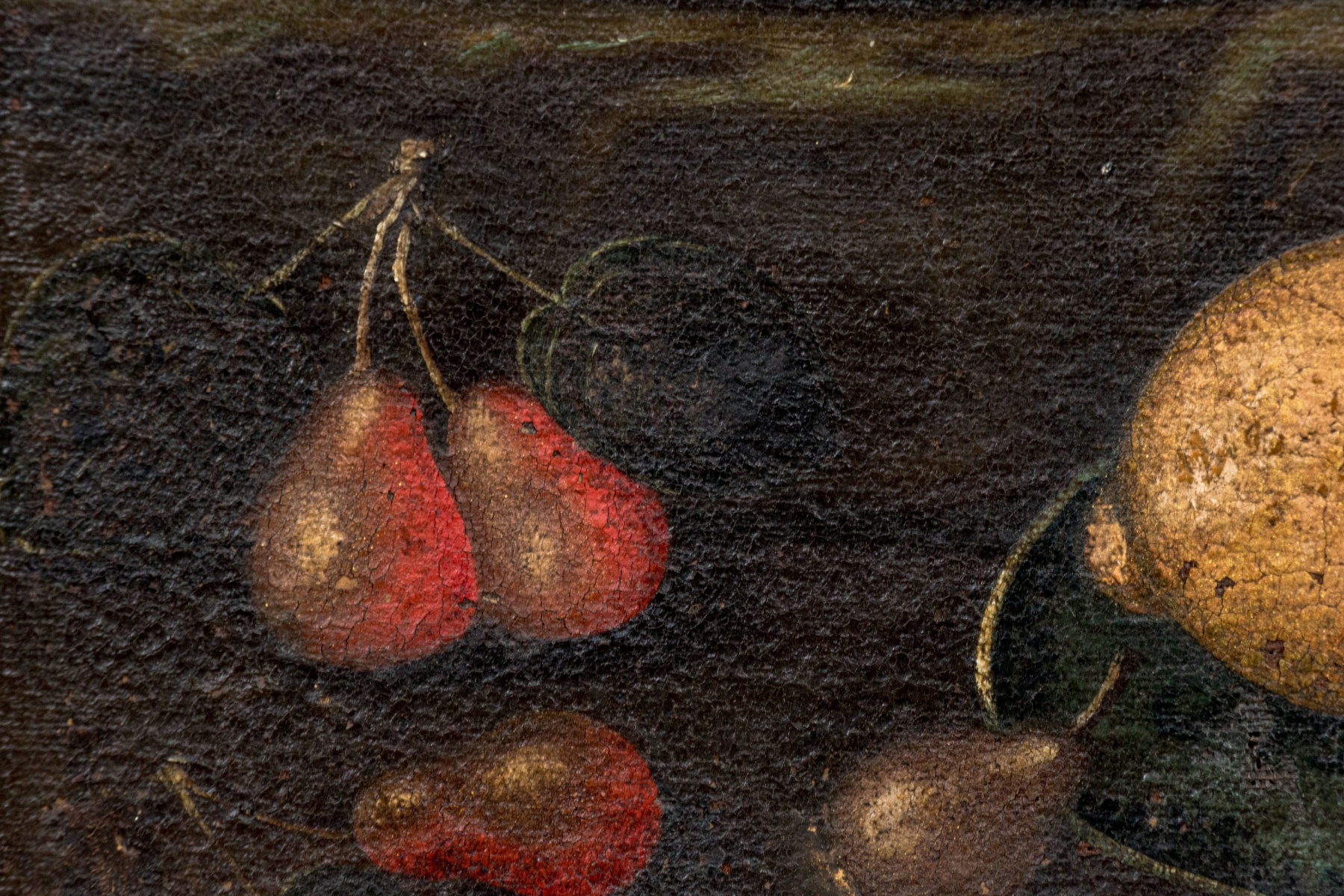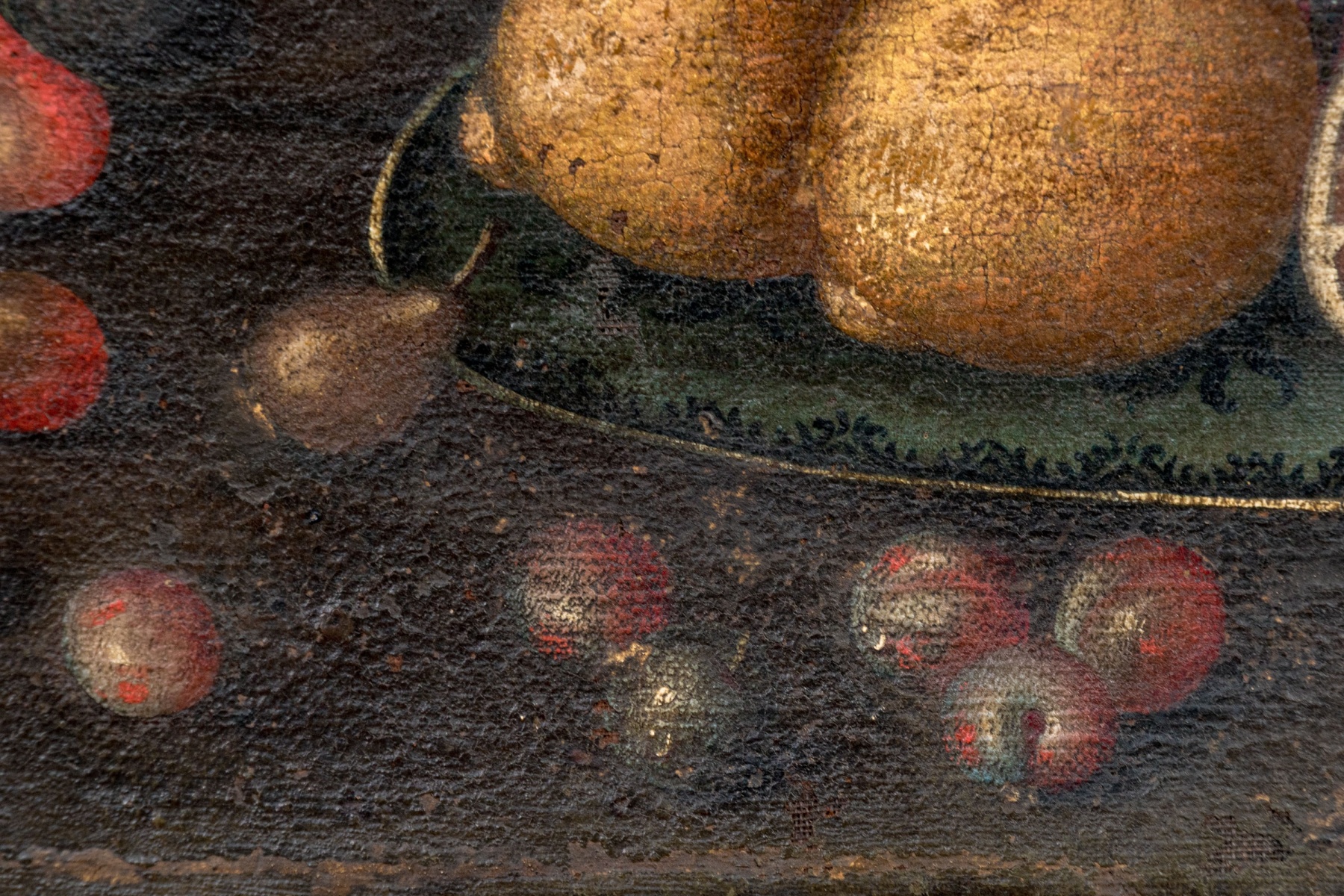 A charming antique oil painting on canvas depicting a still life with well decorated platters full of meat and fruit, including a plate of citrus and orange carnations set atop a brown table with pears, mushrooms, and a pumpkin against an olive-brown ground.