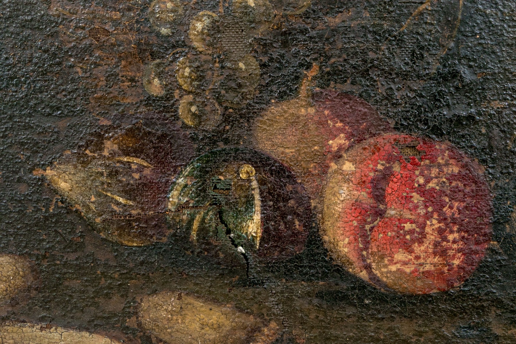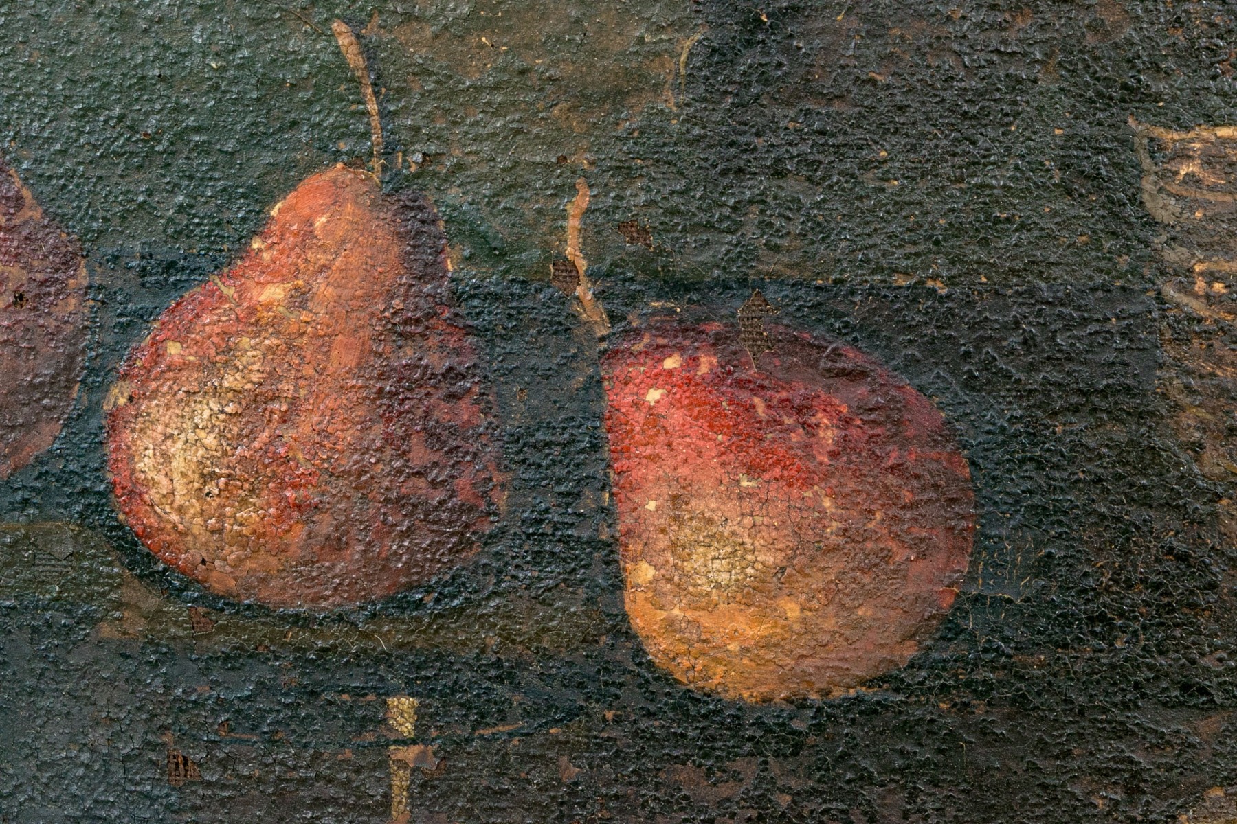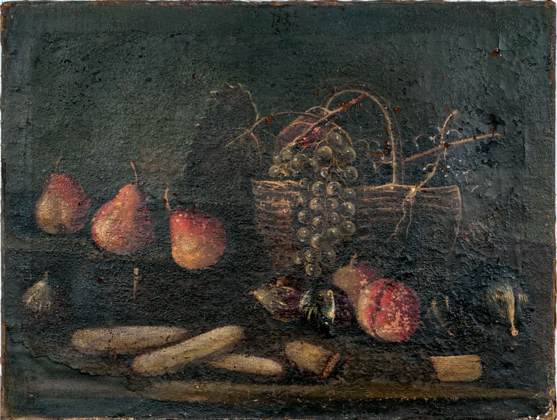 An antique oil painting on canvas depicting a still life with fruit and a woven basket including pears, peaches, grapes, and plums, set atop a dark surface against a black ground. Appears to be unsigned. The canvas is mounted to a stretcher, unframed.